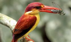 Common among Kingfishers are:- Kingfishers have very distinctive body profile. A large and long beak, usually black or red. Equally large head to keep up with the long, sharp, pointed beak but disproportional short legs and stubby tails. They see well both in air and under water with specially fitted egg-shaped lens, able to focus in the two different environments. Most Kingfishers live near water which gives the wrong impression that they are waiting for fishes. As opposed to its name, most kingfisher feed on insect and lizards, Their favorite perch are along small streams and waterways. Giving the impression that they stay close to places where fishes are plentiful. Of course, there are Kingfisher that thrives on small fishes. Wood kingfishers eat reptiles, frogs, and insects while the river Kingfishers prefers only fishes. Kingfishers of all three families beat their prey to death, either by whipping it against a tree or by dropping it on a stone.