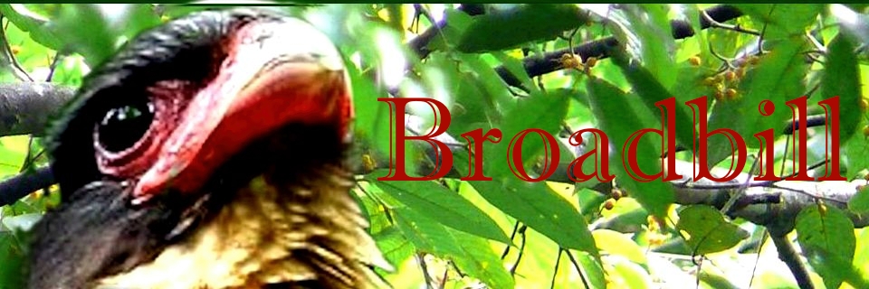 As the name suggests, these are birds with very conspicuous bills. Short & broad. More important to note is the ostentatious colors that it has for its bill. The bright colors simple punctuate the profile. Almost all of them, not gaudy, are very tastefully colorful. Most birders would agree with me that they are considered as one of the more beautiful birds. 4 of the species are generally small, just below that of an average sized bird. The long-tailed Broadbill with its tail looks very prominent as a fair size bird. The exception to this rule is the Dusky Broadbill. This bird is large, dark colored and comes with an "ugly" call as well. Worldwide there are 8 species - of which 7 species can be found in South-east Asia. We are lucky indeed, Malaysia can be hailed as a Broadbill country. We could easily spot all the species that could be seen in this region. Learn more about my experiences with these birds as you browse through their pictures below.