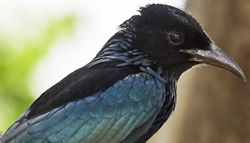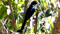 Drongos are a birds with quite a few distinctive features. Most notably are the Racquet-tailed species with the long streamers extending out from their fairly long tail. Other Drongos which are without streamers have the tail -forked. Next, these are birds with loud calls and in metallic tone. When they are around, you just cannot miss their presence, the loud calls in unique tones are repeated in close frequencies. Lastly, another general feature of these birds, is their glossy dark blue colored feathers.
