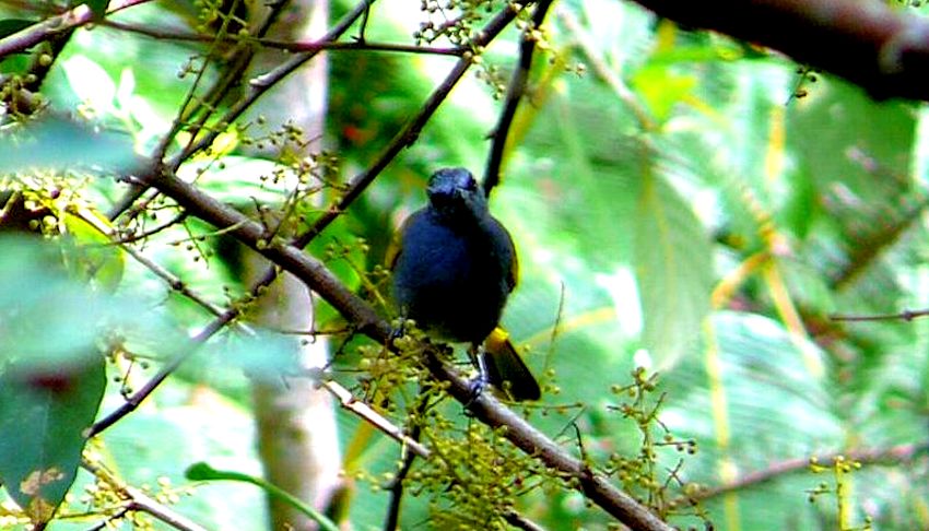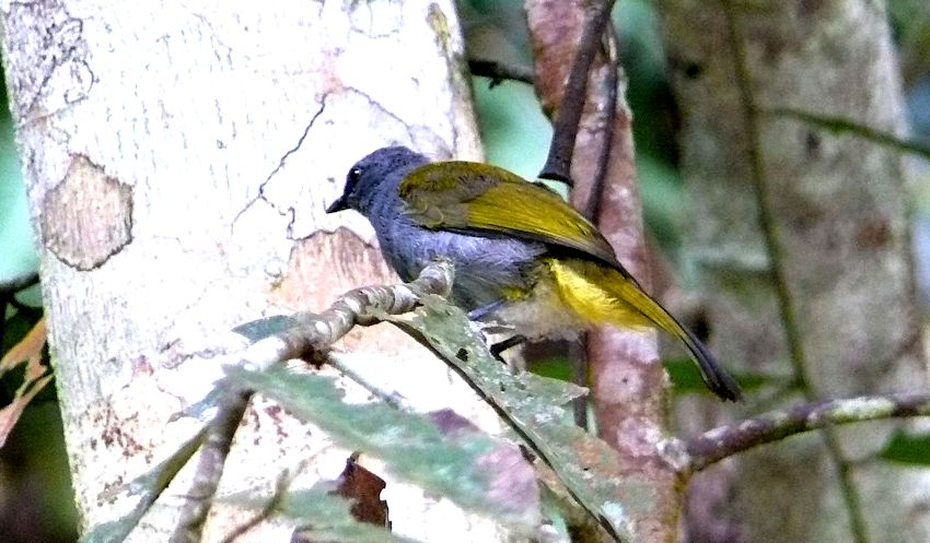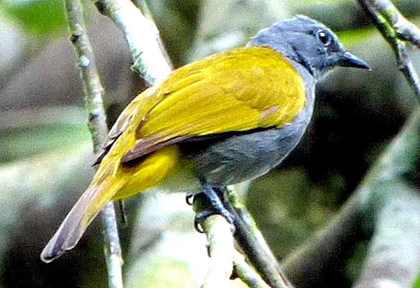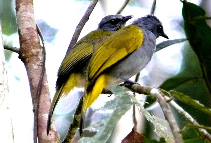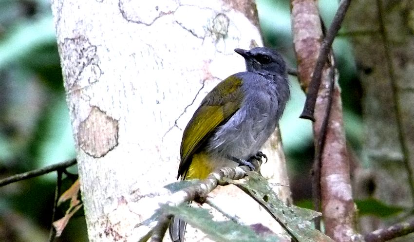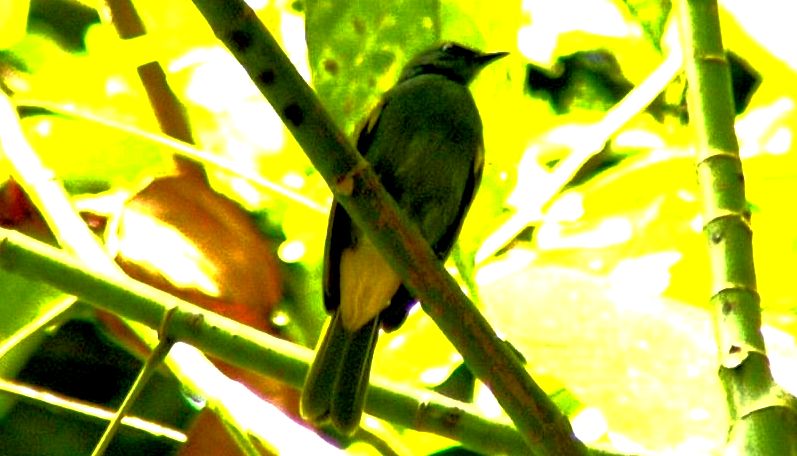 Diagnostic markings :- 16.5 cm. It is a small Bulbul alright but because of the dark colored belly and the very bright upper part, the bird stand out in the jungle setting and in a way also makes the bird appear to be larger that measurement hinted. [1] Grey head and belly, under part. [2] Yellow tail without band - upper part -olive greens. Watch out for low fruiting trees and those filled with lots of small birds like Flowerpeckers, Sunbirds and White-eyes. The largest bird among them should be the Grey-bellied Bulbul. Very distinctive, grey bellied with yellow tail and upper part. The bird though forages alone but in the same area at the same time, there could be several other birds but they do group together. Grey-bellied Bulbul pix # 1