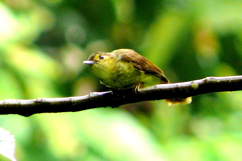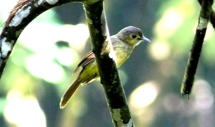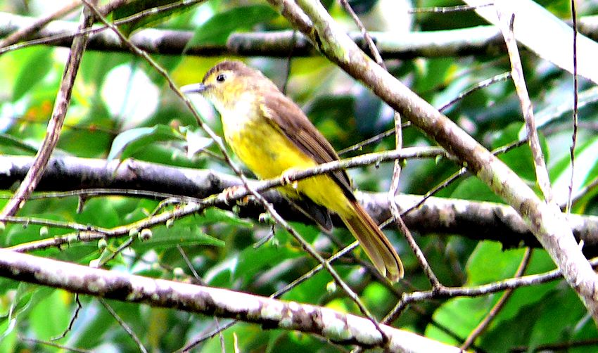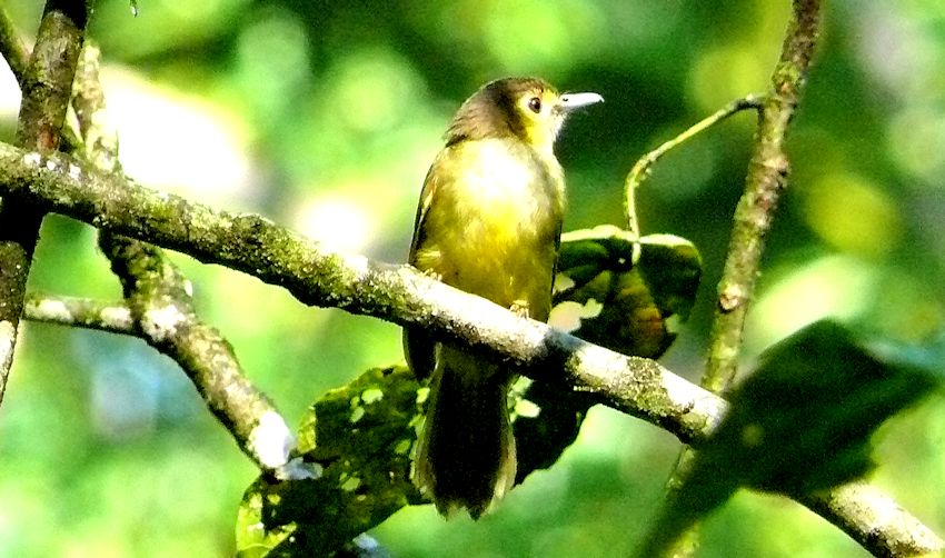 Malaysian Birds Hairy-backed Bulbul Diagnostic markings :- 16.5 cm. Here same as the Grey-bellied this small Bulbul also appear much larger than the stated measurement. cannot explain how I got the impression. [1] Broad yellowish ring around the eyes. Breast dirty green and rest under part with tail - yellow. Wings light brown. So-named -suppose to have fine long plums behind head but hardly seen. Though many subscribers on the internet did write about the bird foraging alone, my experience is that once one bird is sighted, quite often a few other birds in the vicinity. This species is not in the habit of grouping together. It has a habit of staying still in one perch for a long time like the Broadbills. Almost the same size but with very different colors. Most meeting with this species is accidental, meaning that we cannot seek the bird out but we could wait for them in places where the birds have being seen appearing. Hairy-backed Bulbul picture # 1
