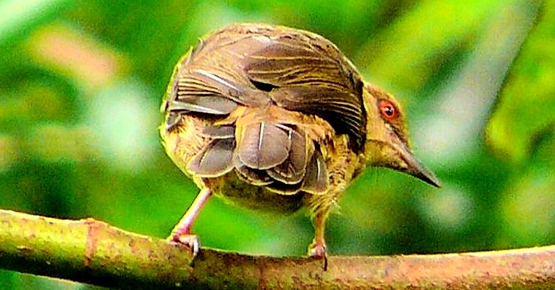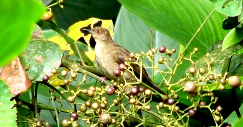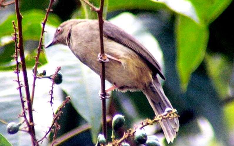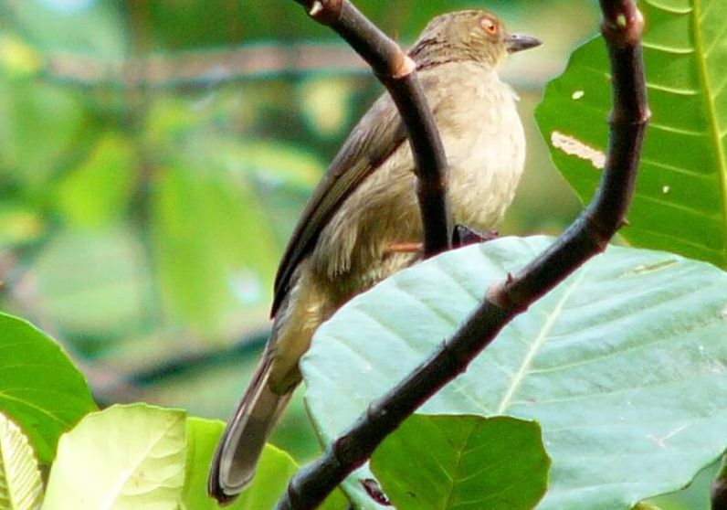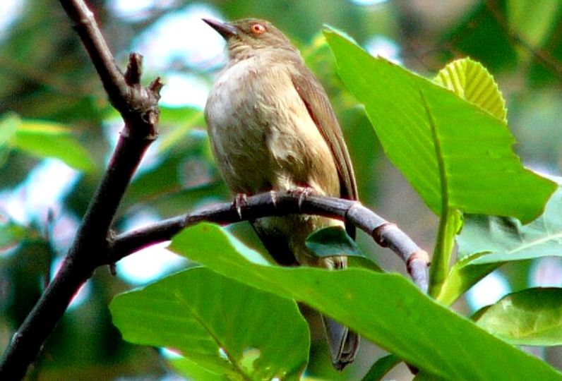 Diagnostic markings :- 19 cm.. This is bird with typical Bulbul size but somehow appears larger than its size. With the typical light brown tone uniformly, it is very difficult to identify, then focus on its eyes. [1] Distinctive red eyes [2] Very uniformly warm brown with a lighter shade on the under part. Bill is dark reddish brown. Has close resemblances to the Olive-winged Bulbul. Distribution :- The bird is resident to Sumatra and Borneo island and is a very common bird in our lowland forest. The big problem is that the bird is also mingled around by the Spectacled Bulbul which near identical other than the eyes. Habitats and preferences :- This is a lowland Bulbul that frequents forest trails and edges. Look out for low trees which are flowering or fruiting. It will remain feeding on the same tree for a while or return to the same tree each day during the season. Their presence is detected through the congregations of a few birds on the same tree. Same species or mixed group with other Bulbuls. Unmistakably Bulbul in shape and color, as I said over and over again, look for flowering tree and when a bird resembling the silhouette of Bulbul is spotted, glue your eyes onto the eyes. At certain angle the red color is very obvious. But it is not easy to look for the red eyes which can be seen as a reflection from the Sunlight. This Bulbul is a wandering birds feeding both on insects, nectars as well as fruits. Meaning the bird is seen throughout the year and do not have specific habits or preferred fruiting trees. When there is a fruiting tree, there they are, a few of them on the same tree and foraging together with other Bulbuls. Red-eyed Bulbul pix # 1