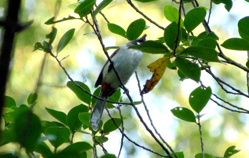 Diagnostic markings :- 20 cm. This is a very well sort after birds and not likely to be seen. Though a few still hanging around, the birds would appear when its favorite trees are fruiting. Still many hobbyists few that those spotted are either escapees or feral birds. To me judging from their habits and behavior those few I have seen were more likely to be wild birds. [1] Tall erected black crest [2] On the face, there is black moustachial line, white ear covert and red ear patch. [3] Upperpart dull brown and underpart white.[4] Undertail is also white Distribution :- This is a bird of continental India, countries south of the Himalayas and South-west China. Introduced in a few countries like Australia and North America. Habitats and preferences :- This is a lowland Bulbul that frequents open country and fields. Now there is a new trend since many of these birds were introduced, they frequent public parks as well as home garden. I saw my first Red-whiskered Bulbul in Rimba Kiara some 6 years back and never encounter the bird again. Then early this year, I was in Ampang at the jungle fringes opposite Kelab Darul Ehsan. There was a keen poachers lying in wait for the bird. Judging from his determination, he must have sighted the species in the same spot before. The point to note here is, that this bird appearing at forest edge, meaning this could be an authentic Bulbul and not an escapee. Again recently, a fruiting tree that attracted Yellow-vented, Striped-throated and Olive-winged Bulbuls also drawn in one Red-whiskered which hurriedly but quietly slipped in and left after a short time feeding of 45 minutes. I would say its habit is very unique and unlike any of the more common species of Bulbuls