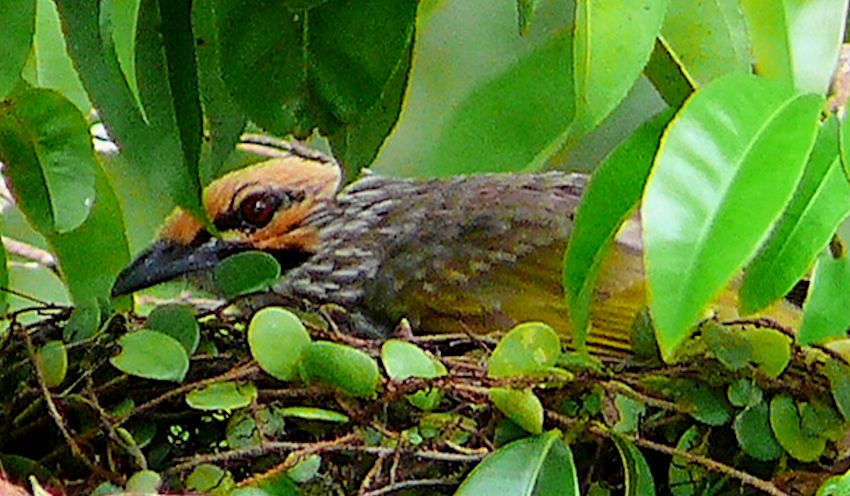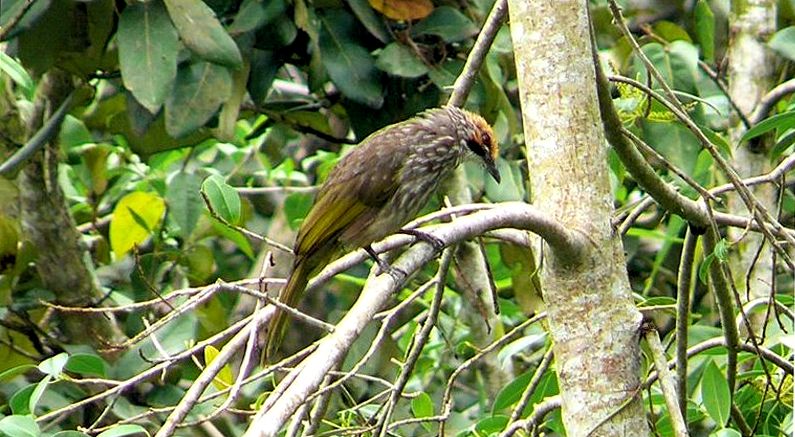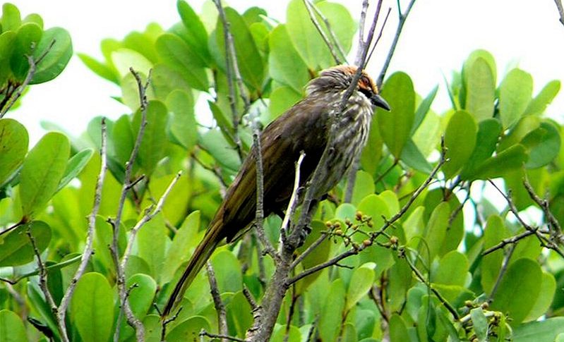 Diagnostic markings :- 29 cm. You cannot find this bird. Instead the bird would announce its whereabouts. Meaning, if the bird is in the vicinity you would be notified by its call. Just a couple of weeks ago that what I thought. I heard its call but as usual this bird like the Hill Mynas remained high in the canopy level. Could not be spotted until it left its perched and flew to the canopy of a lower tree. [1] crown & cheek - Golden-yellowish very prominent [2] nape, mantle, scapulars and the breast with fine and short white steaks. Throat is white and not puffed but the thick black submoustachial ordering the throat is obvious Distribution :- This bird is native to Peninsula Malaysia, used to have them in Southern Thailand as well. Not maybe not! This is a very much sort after bird by the breeders. it's presence easily told by its loud and distinctive calls. Habitats and preferences :- A lowland bird that prefers forest edge with human presence. Among which are plantations, public parks and along major country roads. Mangrove forest is also one of its preference. Somehow all these spots have one property in common - water source. Usually a stream or river, even a fair size pond will do. A common bird in FRIM, Kepong and also in Bagan Sungei Buloh by the sea side. This is the largest Bulbul and a very well sort after as a caged bird. So it is a poachers' favorite. The Striped-throated Bulbul has some resemblances with this bird but easily told apart. The Straw-headed is obviously a large bird when compared to an average Bulbul, the golden marking are more widespread and more distinctive. No way to get confused in the ID for the both. It is not a common bird to encounter, but the pair in FRIM had remained there for years until the last couple of years. There was another family in Kemensah, staying among the house overlooking the fish pond. Funny, these two that I mentioned plus a couple more were all seen near settlements though out in the rural areas. Even the bird in the series of pictures below were at the edge of a Mangrove forest beside the kampong in Bagan Sungei Buloh.