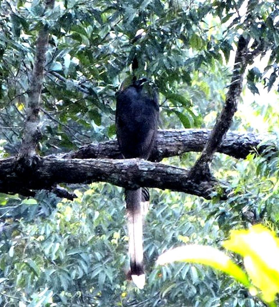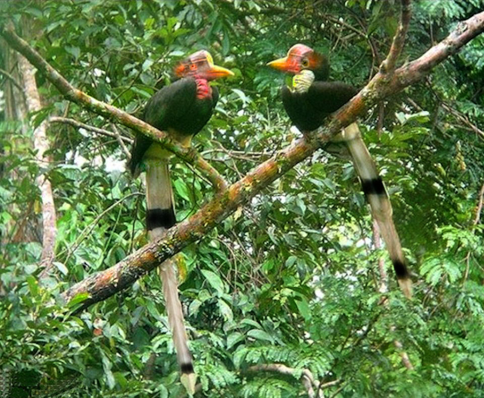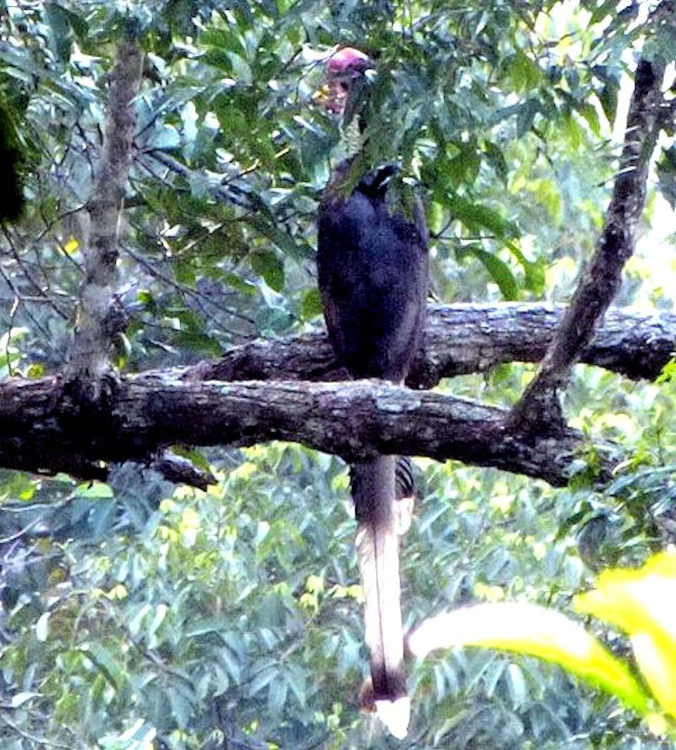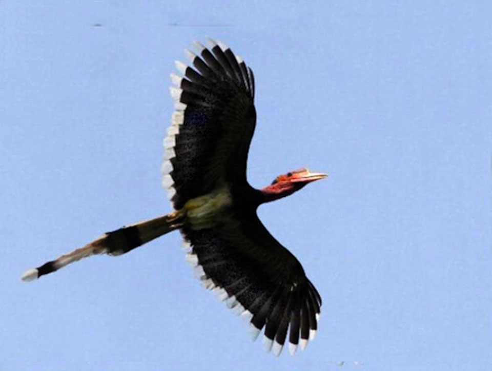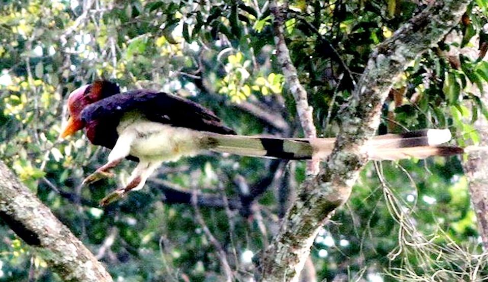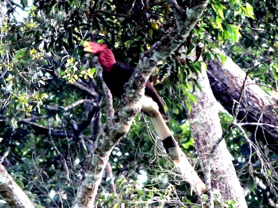 Size & diagnostic markings:- 127 cm. This Hornbill is even longer then the Rhinoceros Hornbill and could also be longer as the central feather at the tail could extend further. This point itself is diagnostic. Dark red skin on the sides of the head, throat and neck reminds us of that Turkey looks. This Hornbill is black with a white rump and hind underpart. The tail is also whitish with a central band. Like most Hornbill, it has a short casque, rounded in red color with a yellow tip. The bill is unlike that of other Hornbill, short - yellow in color ending with red at the end near the head. Distribution :- This bird is found in Sumatra and Borneo. Could be seen fairly often in peninsula Malaysia too. Habitats & preferences:- This is a lowland forest bird preferring preferring low hills. The bird usually seen in pairs. The call of this Hornbill though sounded different from that of the Great Hornbill has the same style and it is also this call that attracted us to the birds' where about. But the huge bird well perched on the canopy and very high up could not be spotted. Nicest point is that when the series of calls ended, that signal the bird's changed in perching spot and we should be on a look out for the birds flying past in the direction where the call was last heard. This is a graceful bird and I had no opportunity to be near a spot where the bird was perched for better pictures. |