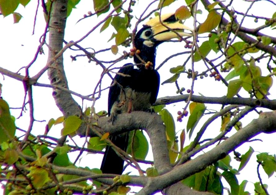 Size & diagnostic markings:- 70 cm. A small Hornbill at 70 cm long. Pied as it is called the bird is white & black. White facial marking with white belly and vent. This undertail is black with white-tipped outer feathers. The bill and casque in uniform pale yellow but sometimes the yellow is fairly rich as well.. Distribution :- This bird is found in the northern and eastern part of Indian sub-continent, South and west of China then to the Greater Sundas. This bird is a common bird at the coast in southern Thailand and Malay Peninsula. Habitats & preferences:- This is a lowland forest bird preferring coastal but not mangrove forest. Plantations and rural settlements. There is a tendency for the birds to gather in flocks but not flying around together. There are 2 species of this bird in Peninsula Malaysia. The more common Oriental-pied Hornbill and the Southern-pied Hornbill. Both are near identical except the white at the under tail. Though this sub-species Southern-pied Hornbill should not be found in Peninsula Malaysia, I have those seen in the Langkawi island recorded as such. Not that much pictures now but would get more for future use. |