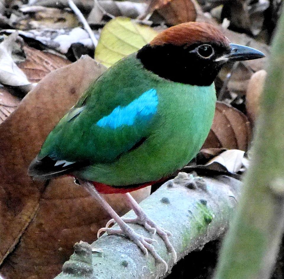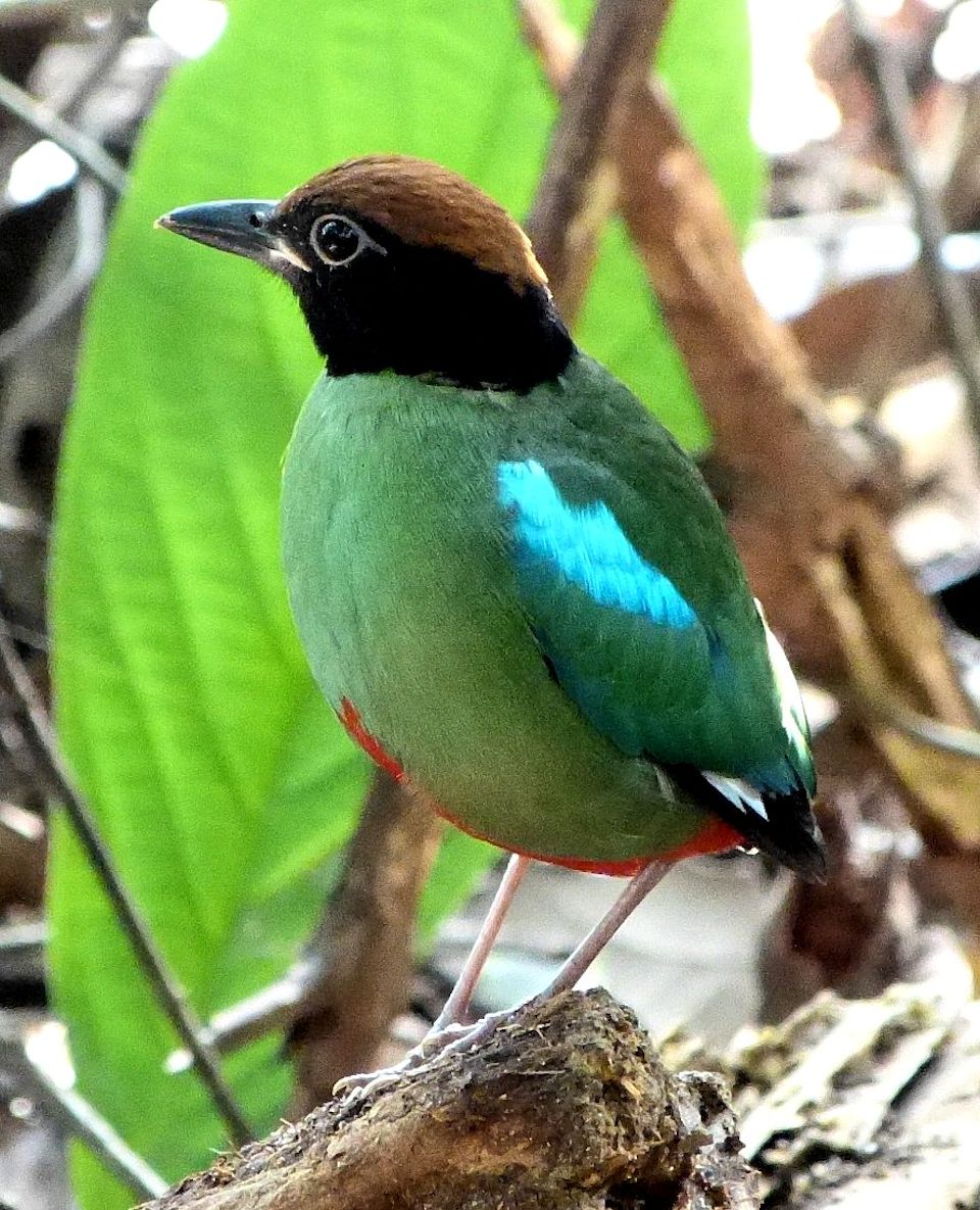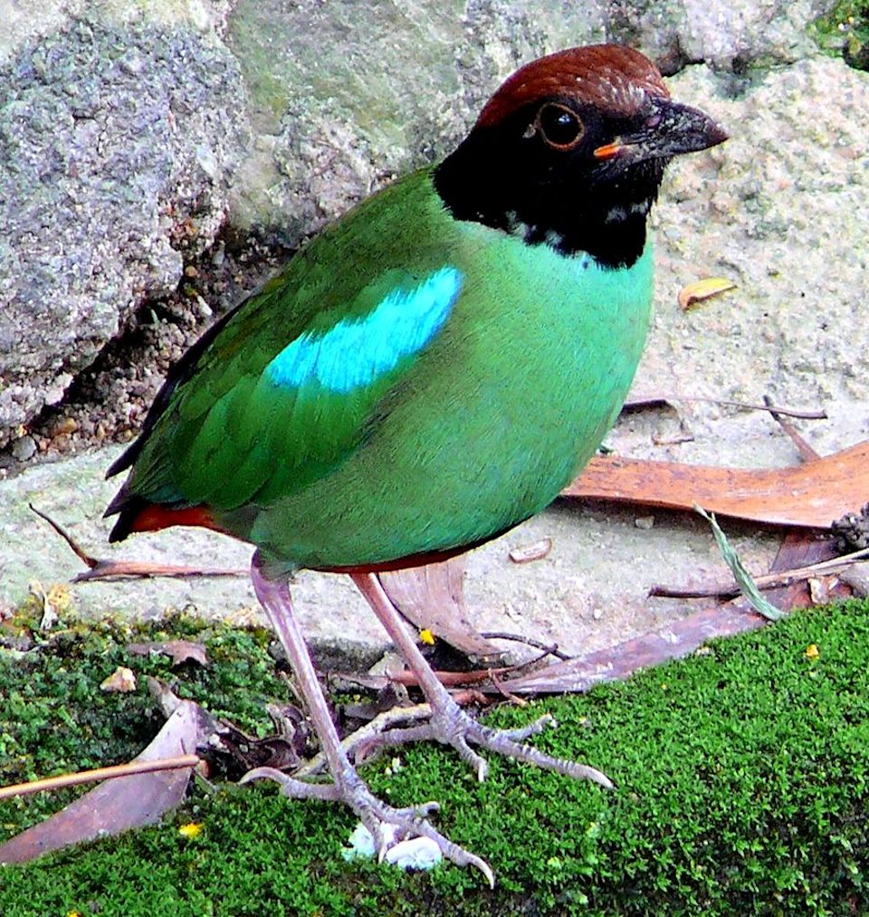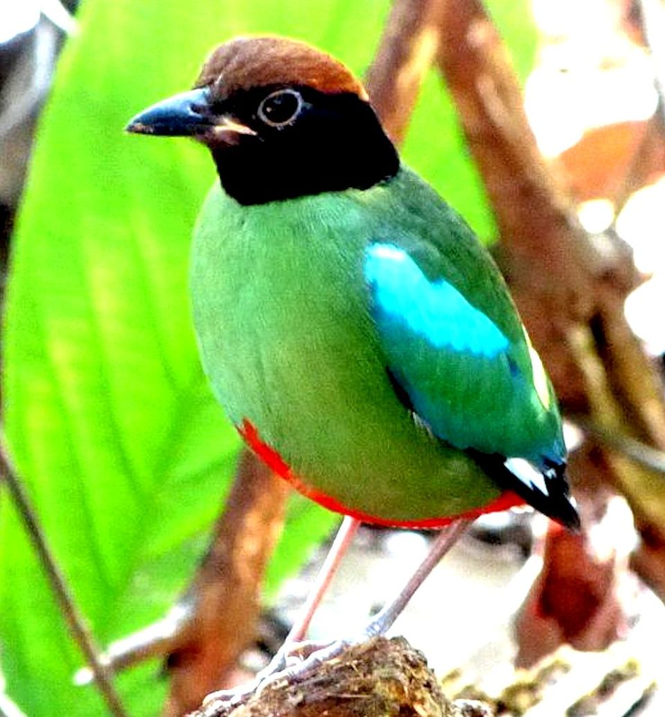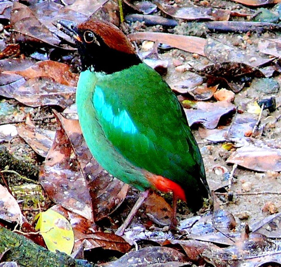 Size & diagnostic markings:- 18 Cm. This is another roundish bird with a very short tail measuring only 18 cm. The entire bird in dark pastel green with a dark brown crown and a thick black collar. A turquoise-blue stripe on the wing. From center of under part to the vent in bright red. Distribution :- The bird breeds in north-eastern India South-west China, then the region of the Greater Sundas down south to Sulawesi and New Guinea. Also resident in south Thailand and northern peninsula Malaysia.The Hooded Pitta is even smaller at 18 cm long. This is a bird from North-eastern India and western China, then another locality in south Greater Sundas and the Philippines. One more location is the Nicobar Island. This is a lowland bird and also a passage migrant in the Peninsula. Another sub-species the Pitta Sordida cucullata with a completely black crown is a resident in Borneo. This bird prefers open areas of the forest edge and old plantations. This bird is accustomed to human presence and would choose small patches of hiding places in urban or near to urbanized area. A pre-requisite would be the availability of wet ground nearby. Once the surrounding area where the bird is hiding is devoid of human presence, the bird would leave its hiding place to scour the open ground for food. The bird would remain in the same spot for a couple of weeks and then continues on its way. This bird remind me of the Flycatcher that works within a small confine. The bird is also shy of human to a certain extend and would not easily come out from the comfort of its hiding place. When it comes to time for feeding, the bird would come out in the open, even with the knowledge of human being around. Birders at this point of time should not spook their confidence by making too much movement or approaching closer within their comfort zone.
