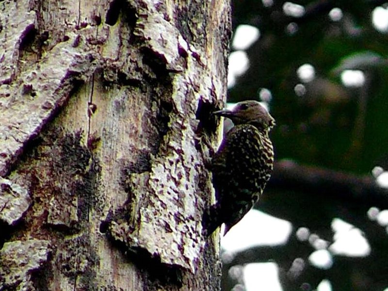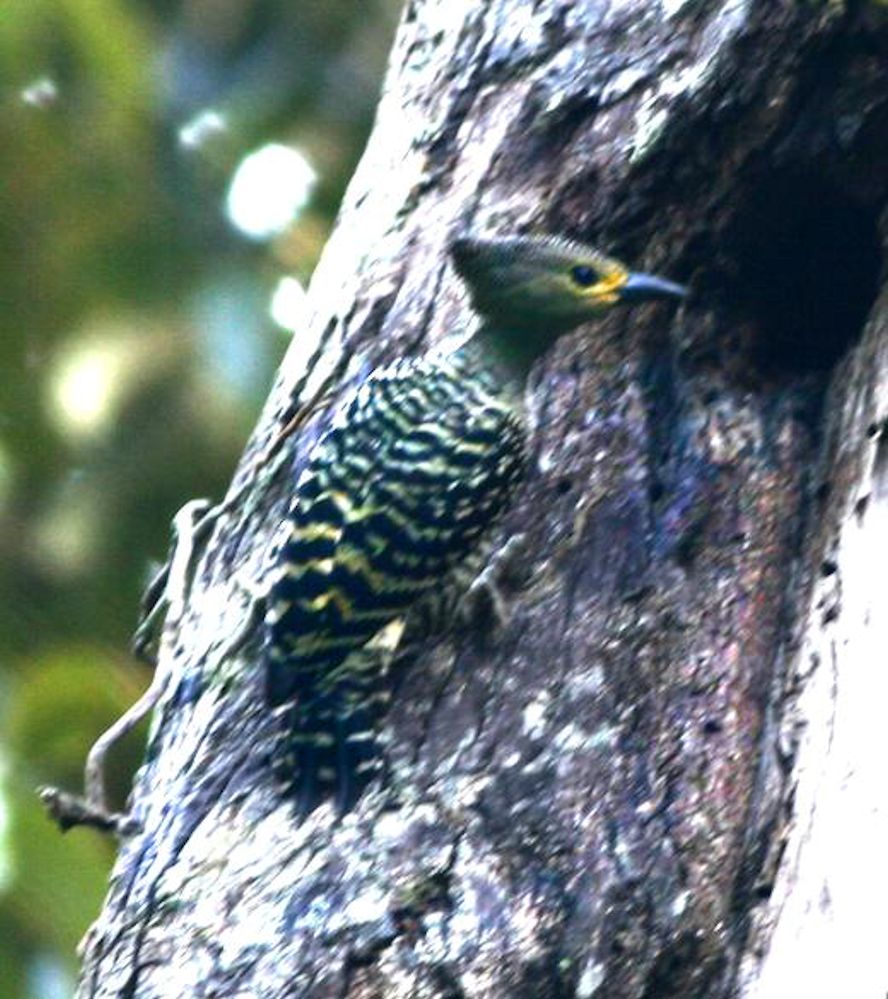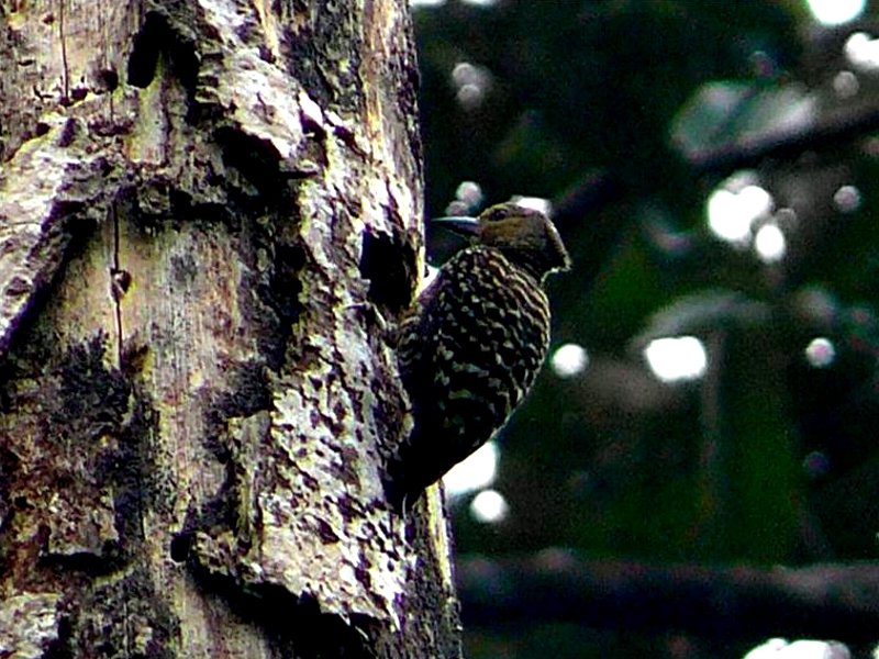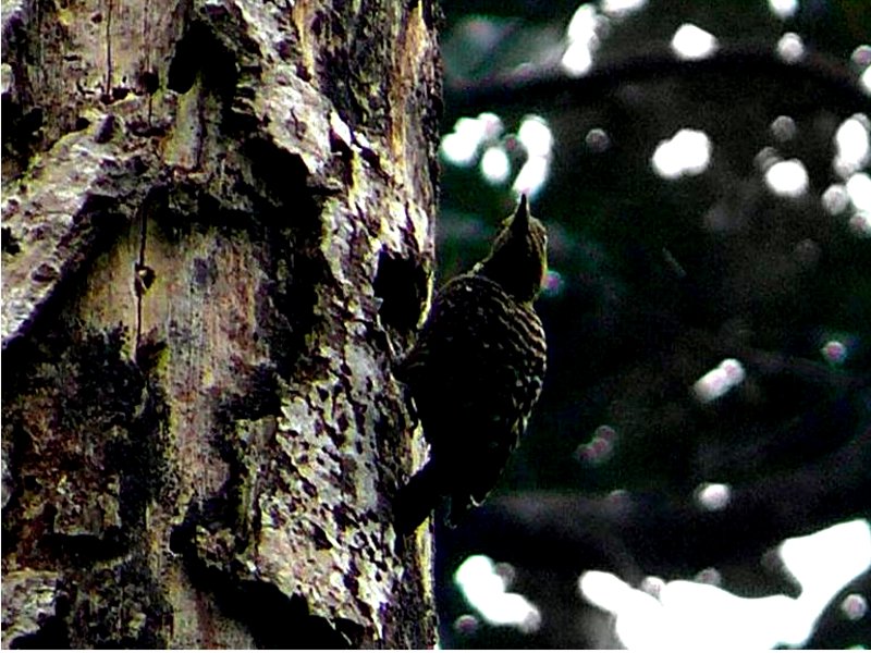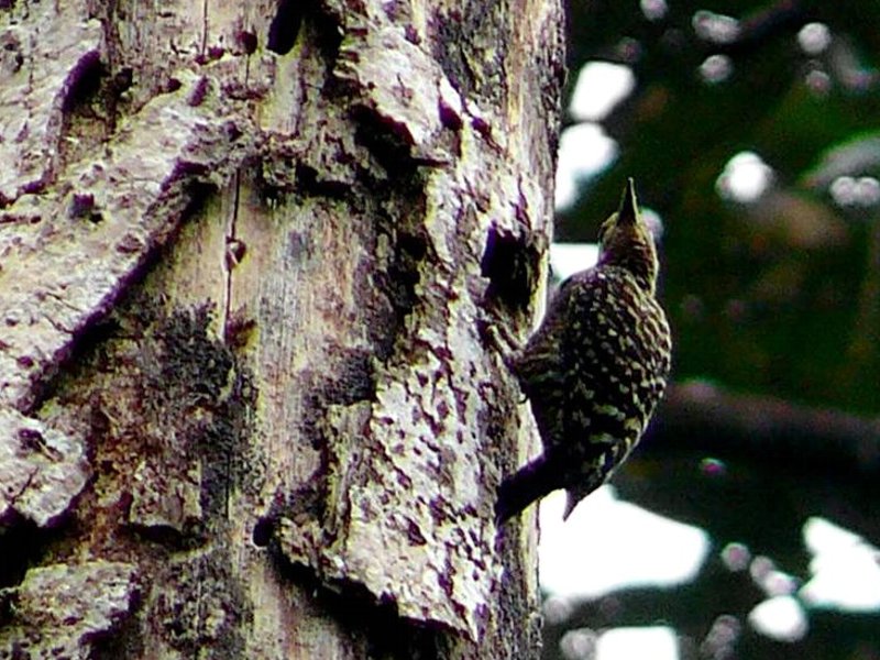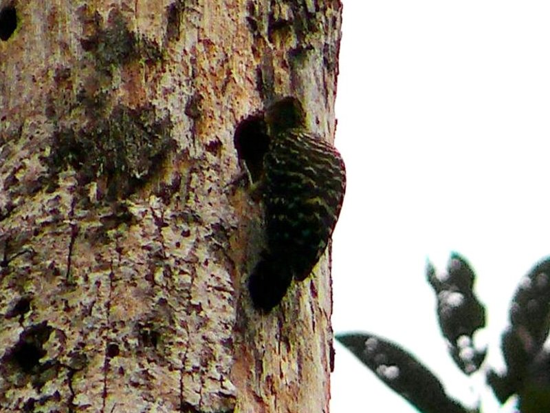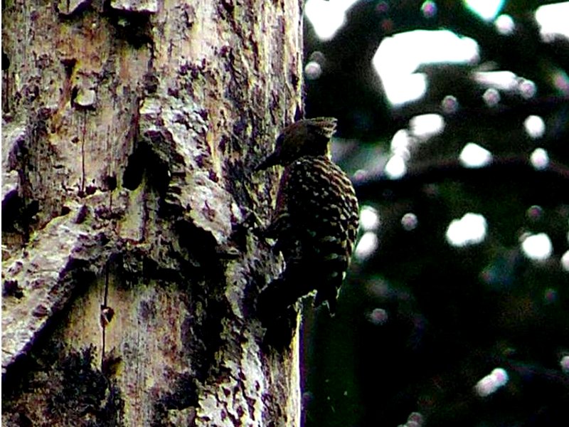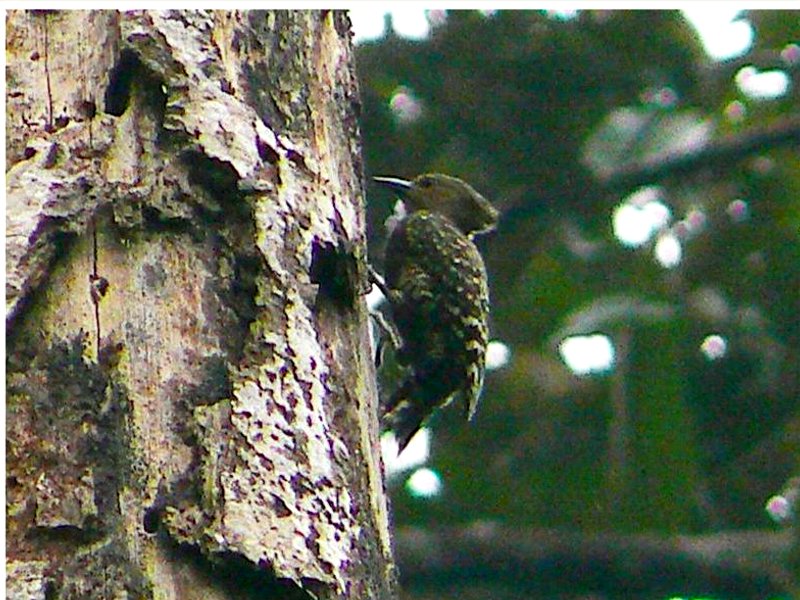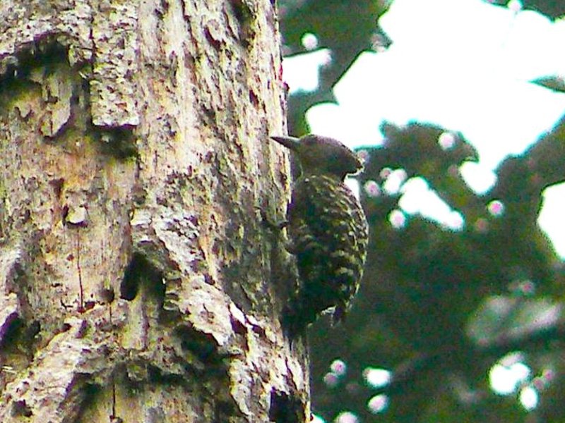 Size & diagnostic markings:- 17 cm. The Buff-rumped Woodpecker is small at 17 cm. The bird appears short as it has the combination of a smaller body plus a shorter tail. The red sub-moustachial stripe is not always noticeable Again the female do not have this stripe. So to tell the difference between this Buff-rumped against the Buff-necked would be 1] its small size and 2] the Pale patch on the neck. Distribution :- This is a bird again of the Sumatra and Borneo island but this time, Java is also one place for home. This is also another easy to spot Woodpecker in Malaysia Habitats & preferences:- The is also a lowland forest bird, but unlike the Buff-necked Woodpecker, the buff-rumped tends to get into secondary forest and plantation as well. It does crawl onto the trunk but also more times seen foraging among leaves. The Buff-rumped Woodpecker at 17 cm is a much smaller bird when compared to the 21 cm Buff-necked. First task is to look for that cream patch on the neck. Next, when there pale neck patch is unseen, then the ID of the bird being a Buff-rumped is more or less ascertained. Overall, I would say that Buff-rumped appeared blackish with all its barring. Buff-necked on the other hand has a brownish tone. Perhaps, good to note the head for the Buff-necked Woodpecker is more roundish while that of the Buff-rumped Woodpecker is getting triangular, some resemblances with the Grey & Buff Woodpecker. Like a in-between the Buff-necked and Buff & Grey Woodpeckers. Then next, look for the red sub-moustachial, those with that red stripe will confirm the Woodpecker is a male. As mentioned earlier, the Woodpecker spends more time foraging among the leaves. They are looking for insect by breaking up nests made by combining leaves. From afar, movements among the leaves could be interpreted as that made by Green Leafbirds.