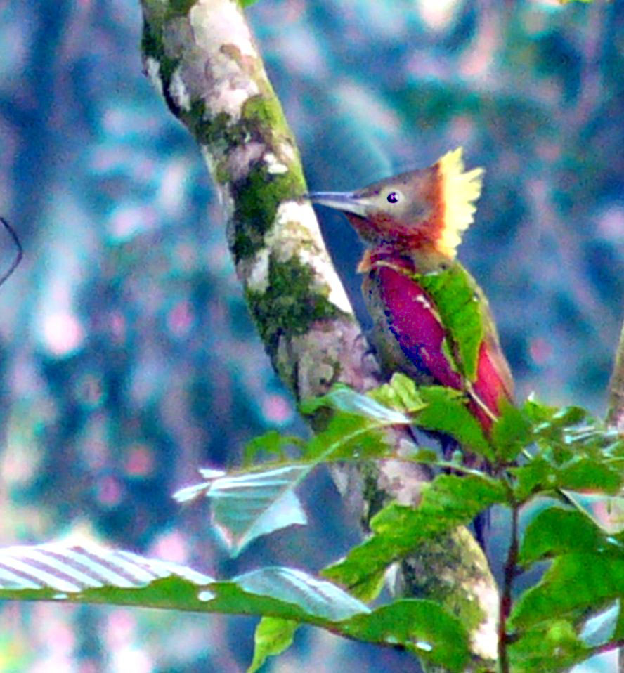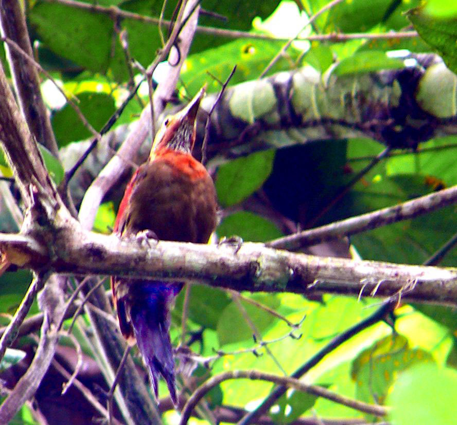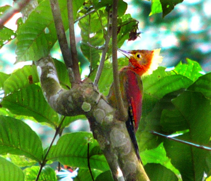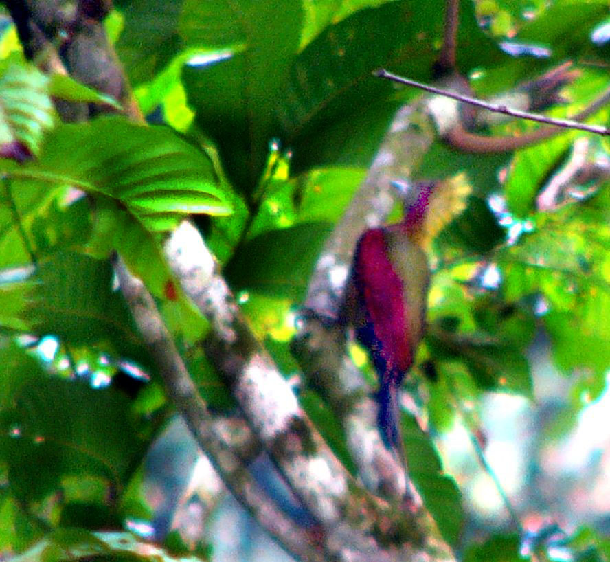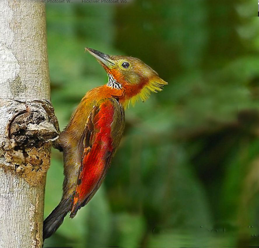 Size & diagnostic markings:- 28 cm. A fairly large Woodpecker at 28 cm long. With the looks of Crimson-winged Woodpecker having bright red wings part and Olive-green upper part. The eye ring is less prominent. The single most important diagnostic marking would be:- 1] the chestnut colored side of neck and the breast. Then 2] the small details of the throat white with black streaks. Distribution :- Also a bird of the Greater Sundas with a local population. In Malaysia, this is a bird of deep forest and not frequently encountered. Then on random meeting up easily dismissed as a Crimson-winged Woodpecker. Habitats & preferences:- This is a bird of the deep forest and mangrove wetlands but could be found in the hills as well. I could have missed many chances of photographing this bird, the lack of knowledge then made me complacent and dismissed spending more time to look for details on this bird. So my advise, upon seeing that common "Crimson-winged" don't draw conclusion yet. Observed harder. This is the 2nd Woodpecker that I was tied up in knots. In Malaysia, where can the bird be found:- Mainly in places with primary jungles. This is a large bird but more often seen from a distance spot. Rengit is one such destination when the chances of meeting up the bird is very good. Another place would be the forest at the Ulu Langat Waterfalls area of Terkali. Forest in Perdik and more times in Rengit.These places were quoted from my own experiences |