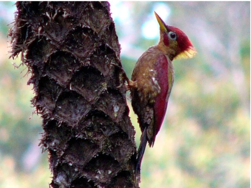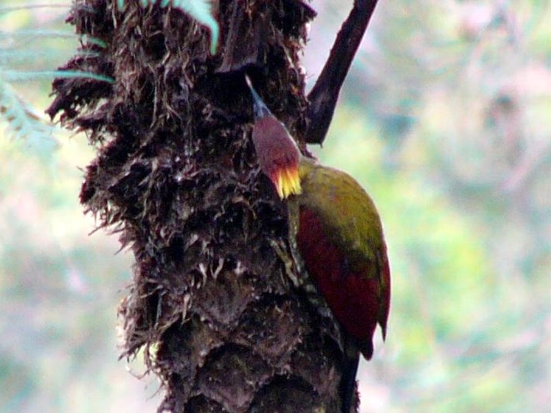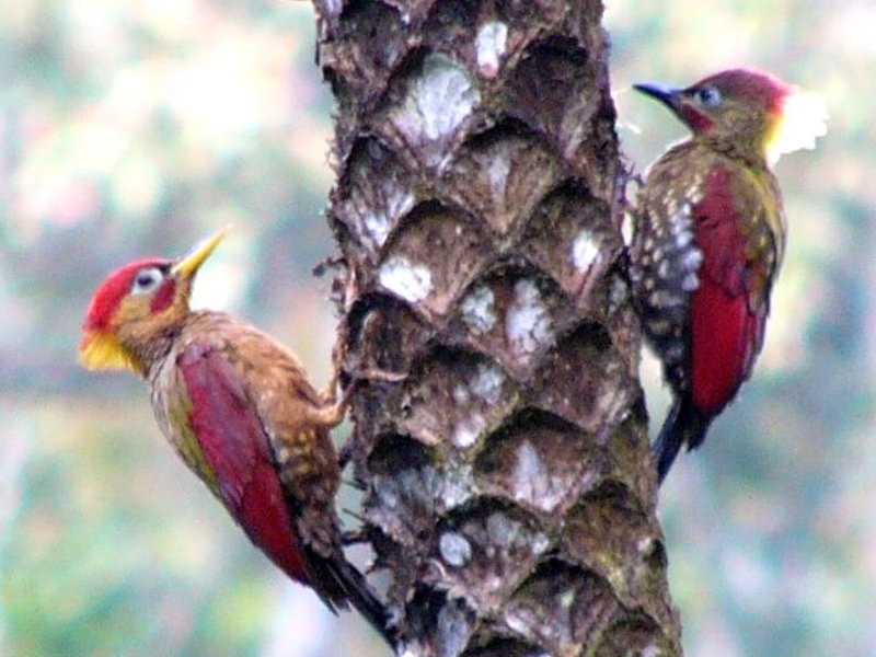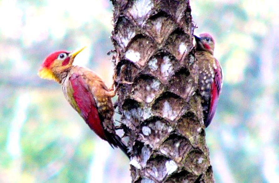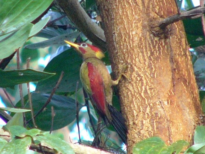 Size & diagnostic markings:- 27 cm. The Crimson-winged at 27 cm is larger when compared with the Banded Woodpecker. Obvious would be the Olive green on its upper part and the yellow nuchal crest. More distinctive would be the red sub-moustachial stripe appearing on the male. Then the red wings patch over the greenish body that helps to brings out the green. Notice the pale grayish-blue eye ring which is also diagnostic for this bird. Distribution :- Again this is another Woodpecker from the Greater Sundas. In Malaysian forest this is the most often seen Woodpecker. The Common Flameback has that position in rural forest edge and public park. Habitats & preferences:- This is a bird of the lowland forest edge as well as secondary forest. Commonly seen and the second most commonly seen Woodpeckers after the Common Flameback. This true to the term forest edge irrespective of terrains i.e. in the lowlands and well as in the mountain. Example the bird was seen in the plantation outside a kampong and then along the forested road in Rengit. This time a stretch of road without houses and primary forest. Some of the pictures included in this page were taken at the Old Pump House Road, a sub-montane area. Also in the same area, the Banded was spotted. In most other places, I have seen the bird moving in pairs. They moved at the lower as well as middle storey. This is not a shy bird and would carry on its activity even when it was under observation. In making out the differences between the Banded and Crimson-winged, I could see that photographs are better guides when compared to drawings. Straight away, the points mentioned about the subtle differences makes sense. The difference are so obvious and not subtle. It is a matter of getting used to recognizing the diagnostic markings.. As mentioned in the notes for the Banded Woodpecker, the wings on the Crimson-wings may sometimes makes the Woodpecker appear red. In actual fact, looking at the pictures, notice that brightly red shaded portion which may be a main feature is less imposing on the overall olive green color of the bird. In the case of the Banded Woodpecker, the dark red wings blended in well with the maroon-brownish speckles on the back. Of course, the clearest diagnostic marking is the red sub-moustachial stripe. This is so important but not helpful as the feature only appears on the male and with the bird moving about swiftly, hard to pick up unless done with after a picture was taken and studied.