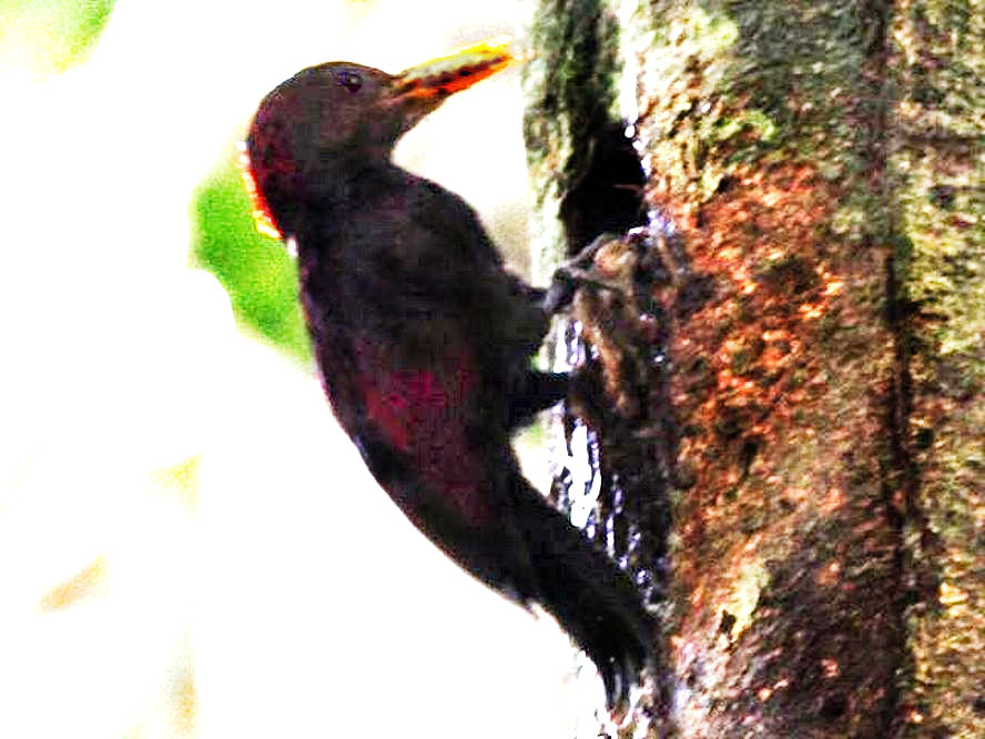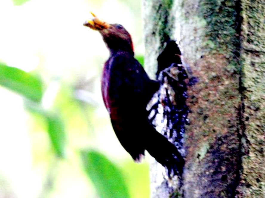 Size & diagnostic markings:- 24 cm. I love seeing this bird with a outstanding ivory beak A small Woodpecker at 24 cm almost the size of the Rufous and yet smaller. The description of "unmarked maroon chestnut" looks like plain maroon on the upper part and the under part also plain looks brown . The beak which is the striking part is long of pale ivory color. Distribution :- The is a bird from Sumatra and Borneo Island. This is not a common bird to find but could seen at Forest edge in Malaysia. Habitats & preferences:- The bird prefers Bamboo clumps. A lowland bird but usually prefers Bamboo growing on heavily forested hill slopes. So I would say that this is a bird of the low hills and not sub-montane. Though a bird native to Malaysia, the bird is not often sighted. In fact the few occasions I met the bird at the Gap and Perdik by chance. Not enough experience with the bird to pass on in this page. The images shown below with that of my collection of female Maroon Woodpecker. Then further down are pictures of the male bird feeding the chicks. Unfortunately, lightings was hostile even though I was very close by to the nest. In Malaysia, where can the bird be found:- The bird seen in the hills in Ulu Langat as well as those on the road to Frasers. A good place would be The Gap |