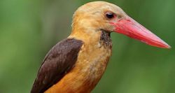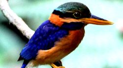 Common among Kingfishers are:- Kingfishers have very distinctive body profile. A large and long beak, usually black or red. Equally large head to keep up with the long, sharp, pointed beak but disproportional short legs and stubby tails. They see well both in air and under water with specially fitted egg-shaped lens, able to focus in the two different environments. Most Kingfishers live near water which gives the wrong impression that they are waiting for fishes. As opposed to its name, most kingfisher feed on insect and lizards, Their favorite perch are along small streams and waterways. Giving the impression that they stay close to places where fishes are plentiful. Of course, there are Kingfisher that thrives on small fishes. Wood kingfishers eat reptiles, frogs, and insects while the river Kingfishers prefers only fishes. Kingfishers of all three families beat their prey to death, either by whipping it against a tree or by dropping it on a stone.