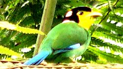 As the name suggests, these are birds with very conspicuous bills. Short & broad. More important to note is the ostentatious colors that it has for its bill. The bright colors simple punctuate the profile. Almost all of them, not gaudy, are very tastefully colorful. Most birders would agree with me that they are considered as one of the more beautiful birds. 4 of the species are generally small, just below that of an average sized bird. The long-tailed Broadbill with its tail looks very prominent as a fair size bird. The exception to this rule is the Dusky Broadbill. This bird is large, dark colored and comes with an "ugly" call as well. Worldwide there are 8 species - of which 7 species can be found in South-east Asia. We are lucky indeed, Malaysia can be hailed as a Broadbill country. We could easily spot all the species that could be seen in this region. Learn more about my experiences with these birds as you browse through their pictures below.
