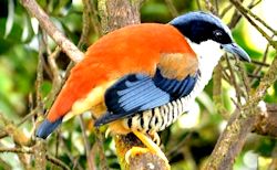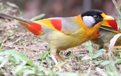 Leitherichidae Passerines are song birds that perch on open branches and display their singing. These are also the birds recognized by their profile of slim bodies and fairly long tails, associated what we conceived as Passerines. Given meaning to that impression of ours, then how should a song bird would look like? Among the many birds grouped under the loosely coined name "passerine" is the group of Leiothrichidae. Before and now, it has always being the problem that most songbirds are so much look alike from one another. For example, when it comes to grouping or classifying them, Mesia for example, was once grouped together with Flycatcher. Now more appropriately slotted in together with the Laughingthrushes Well, this group Leiothrichidae are colorful birds with a sweet repertoire of calls. They also have quite few other characteristics in common. First - they are all colorful, they have sweet songs, they are singing out loud and continously and they forage in small group of a few birds Better known within in this group would be the large birds, Laughingthrushes. As quite an obvious group of birds, I have taken out for a dedicated page. Leaving behind in this page would be a collection of medium to small size birds. Among them are the most sort after Cutia and Mesia