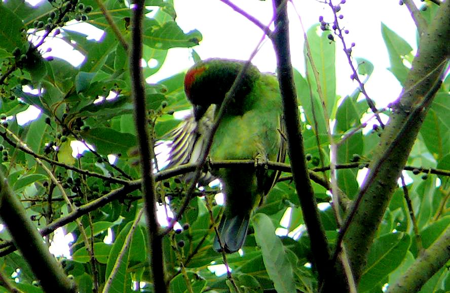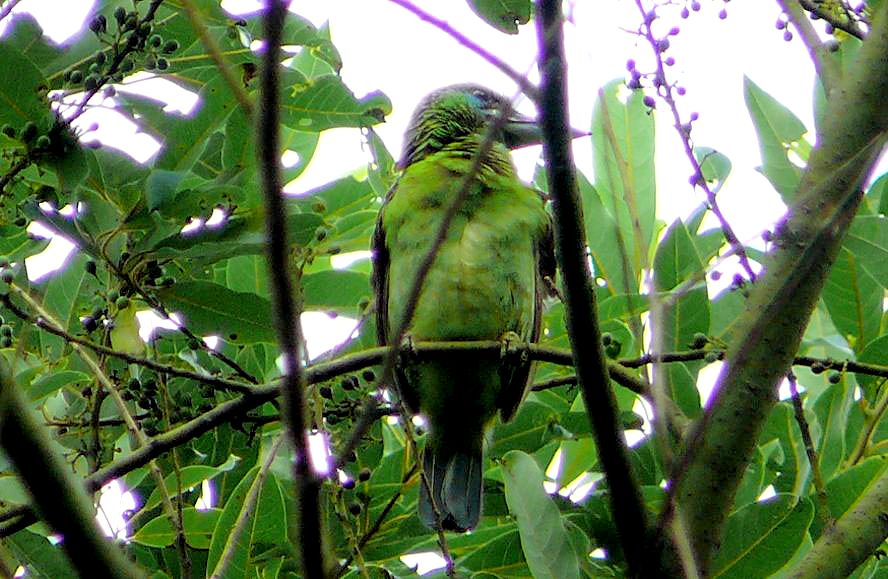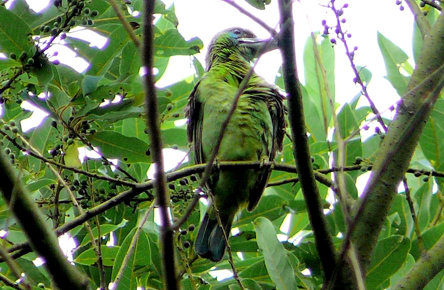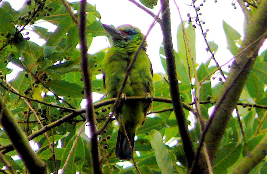 Size & diagnostic markings:- 23 cm. The Blue-throated is a fair size Barbet. Slim, particularly our Malaysian sub species with a blue face and crown. The supercilium is a narrow black streak much less conspicuous than that on the Black-browed. Then a dash of red on the side of the breast. Distribution :- Coming from around the same region of the Blue-eared i.e. North-eastern Pakistan, north-eastern Indian sub continent and south-west China. Habitats & preferences:- For us in Malaysia, this is a hard to find Barbet as they are always in the canopy level of hills to a region just below the sub-montane level. So very little chances of exploring these forested surroundings. In fact, I have no clue as to where to search for the birds other than knowing that this is a birds of the rolling hills. These could only be along the country roads of some altitude leading to the hill resorts of Cameron Highlands and Frasers Hills. With a bit of luck, there was this patch of forest with a few fruiting trees. Somehow the fruits were attractive to a few types of Barbets. Among them was the Blue-throated. What rare opportunity! Got one miserable shot of the adult while the rest of the pictures were those from the juveniles and sub-adult which are not representative. I would say that meeting up one in Malaysia is not easy. Still on a look out for more decent pictures. In Bukit Tinggi, the birds shown on this page were among a crowd of 4 species of Barbets.