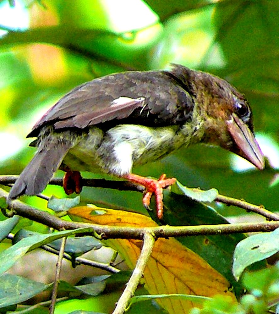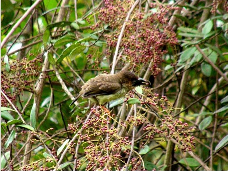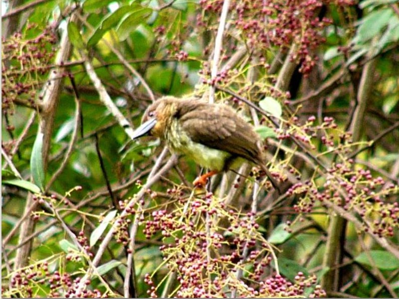 Size & diagnostic markings:- 20 cm. This is a stocky little bird but not tiny. Unlike normal Barbet, this is the only Barbet that is not green in color. Almost dark brown on the upper part and lighter brown on the under part. The chest and breast appear a pale color. Distinctive also would be the pink-orange colored leg and feet. The beak in dark grey. Distribution :- This is a bird from the islands of Sumatra and Borneo. In peninsula Malaysia, the bird is fairly common Habitats & preferences:- This is a bird of the lowland forest, staying at the canopy level and coming down during the fruiting season. This bird is also seen at the lower level of sub-montane forest like Awana. I would say that this is a medium size bird of 20 cm. First impression - with its shorter tail, the bird looks small and roundish. Unfortunately its brown color did not help and from distances of over 100 feet high, it is quite difficult to make an instant ID despite of seeing it with a thick bill. Yes, the bird is found in forest edges below 1,000 m high. Most time, when they are not feeding, I saw them they were in canopy level but actually the bird prefer middle storey. Again, most times I have seen them in Ampang [lowlands] or in Awana [Sub-montane] the bird is solitary. While they descended for teh fruits, at close range, the reddish feet gave the clue away. Since there were so much of fruits to share, they do get together and became a gregarious bunch. One more point, they do hang themselves upside down. You will find them when the air is filled with lots of noises, and a cluster of few birds together. Or, a quiet loner that is not driven away by human presence.