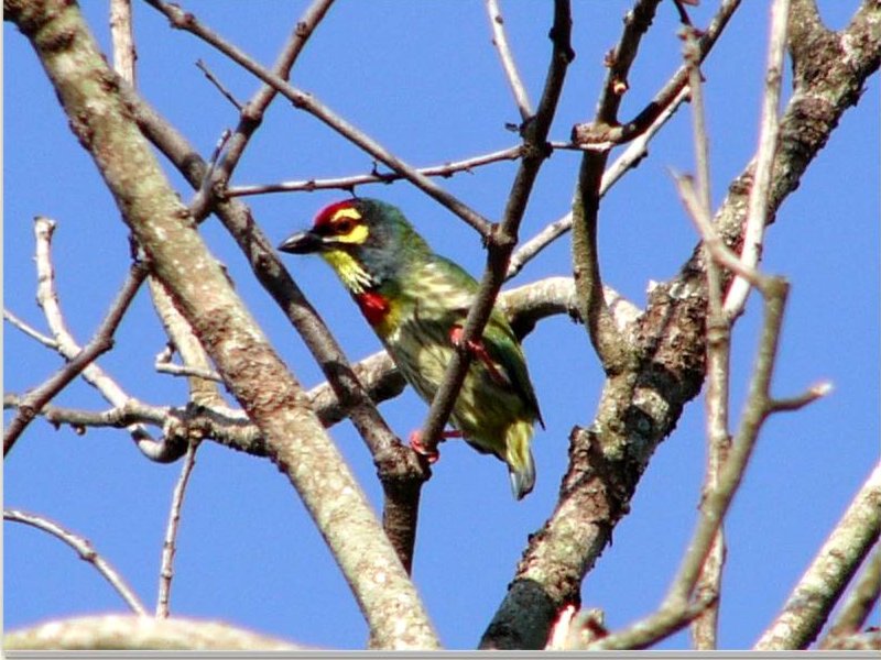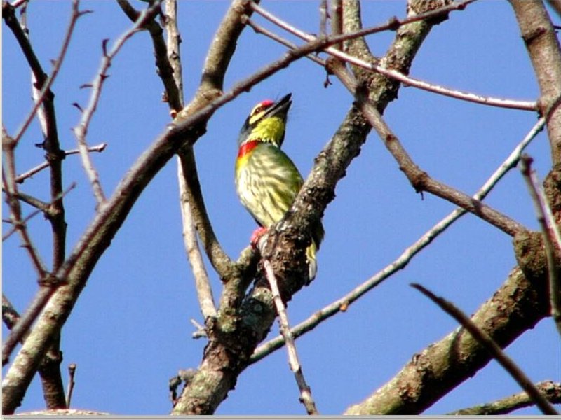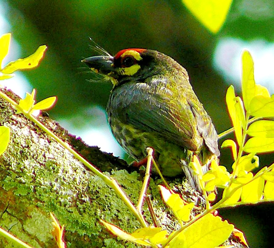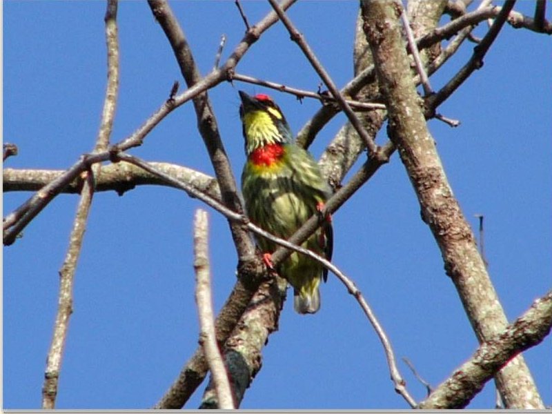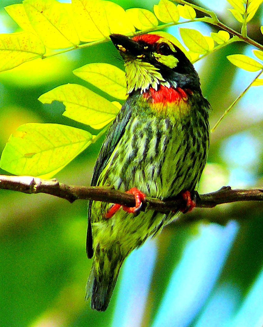 Many of you may not have noticed a soft continuous tooting in your neighborhood. The manner of the call? Experts named it as metronomic. It is a bird call from a tiny Barbet bird from a spot at the tallest branch of a tree within your park. This page will show you images of this colorful little Bird. Barbers and members from this family which are green birds with multi colored patches around their heads. That makes them, a well sort after trophy by Bird photographers Most of the Barbets, in fact, all Barbets are forest birds. Even the Coppersmith Barbet is a forest edge bird though it is a bird seen more often in parks. It keeps to tall trees in urban surrounding and I suppose is attracted to the numerous Macarthur Palms trees with fruits throughout the years. From where they are perched, far away from human interaction. It is s fruit eater. Size & diagnostic markings:- 17 cm. This is the smallest Barbet as well as the most common one for me. A yellow face split by a black eye stripe. The throat also yellow separated from the face by a sub moustachial stripe. The head - front part of crown red with the top and back in black. Matched by another red band on the upper breast
