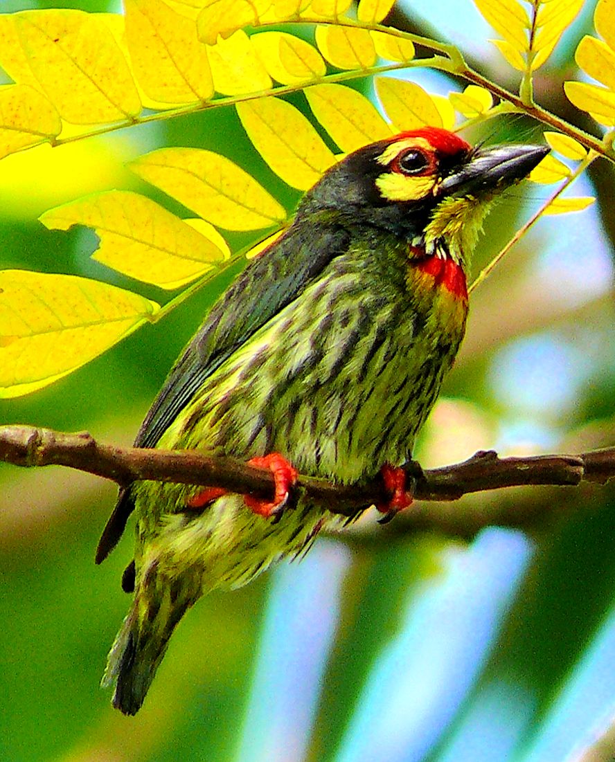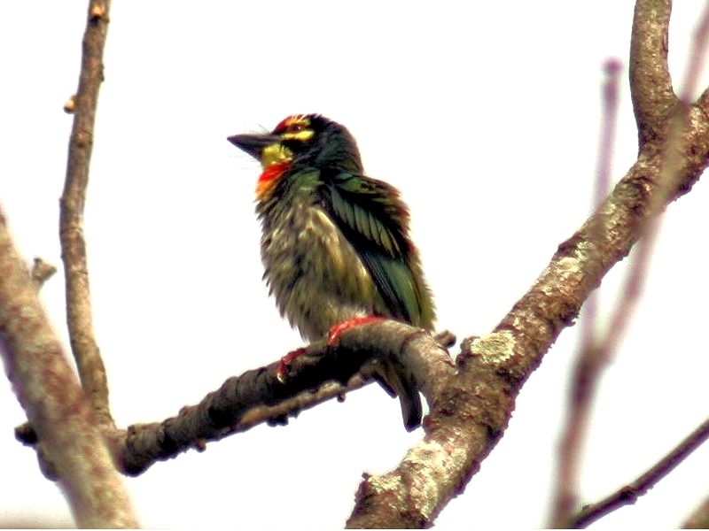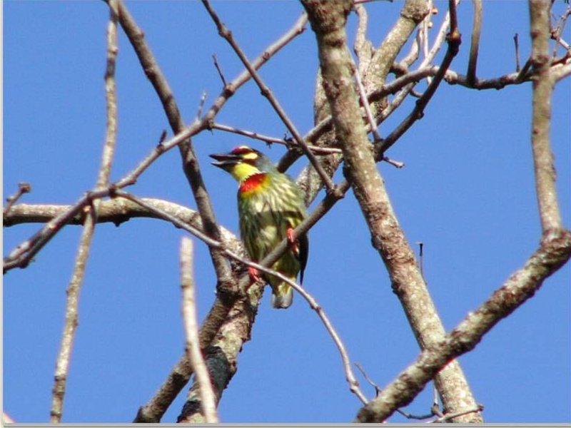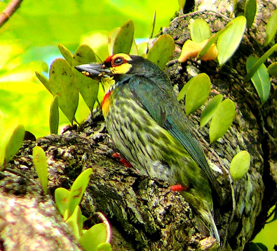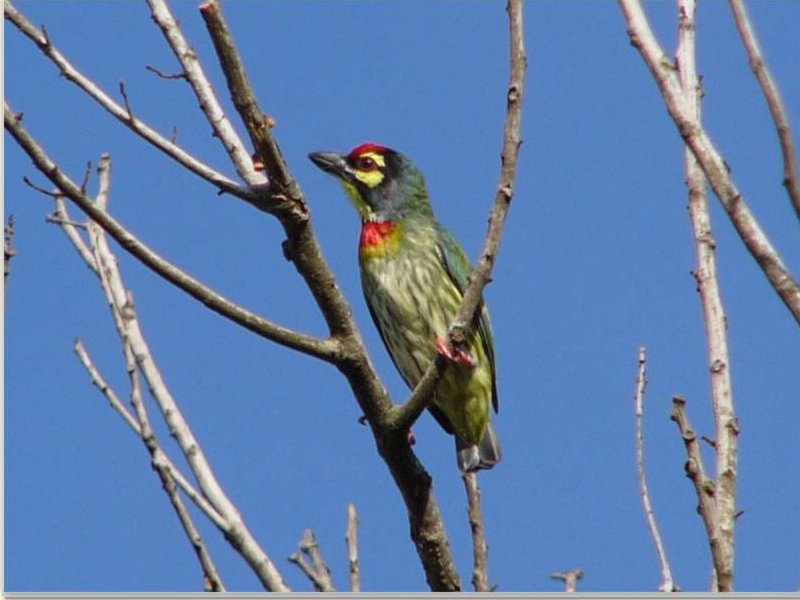 Many of you may not have noticed a soft continuous tooting in your neighborhood. The manner of the call? Experts named it as metronomic. It is a bird call from a tiny Barbet bird from a spot at the tallest branch of a tree within your park. This page will show you images of this colorful little Bird. Barbers and members from this family which are green birds with multi colored patches around their heads. That makes them, a well sort after trophy by Bird photographers Most of the Barbets, in fact, all Barbets are forest birds. Even the Coppersmith Barbet is a forest edge bird though it is a bird seen more often in parks. It keeps to tall trees in urban surrounding and I suppose is attracted to the numerous Macarthur Palms trees with fruits throughout the years. From where they are perched, far away from human interaction. It is s fruit eater. Size & diagnostic markings:- 17 cm. This is the smallest Barbet as well as the most common one for me. A yellow face split by a black eye stripe. The throat also yellow separated from the face by a sub moustachial stripe. The head - front part of crown red with the top and back in black. Matched by another red band on the upper breast