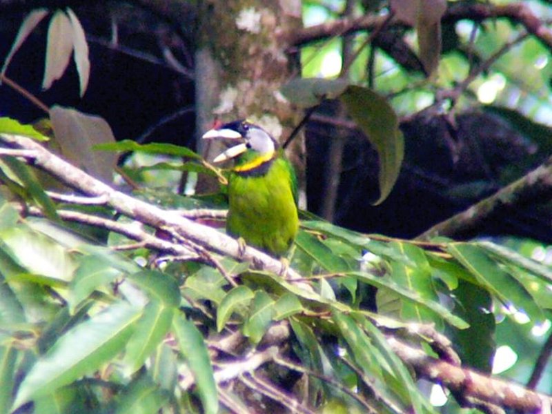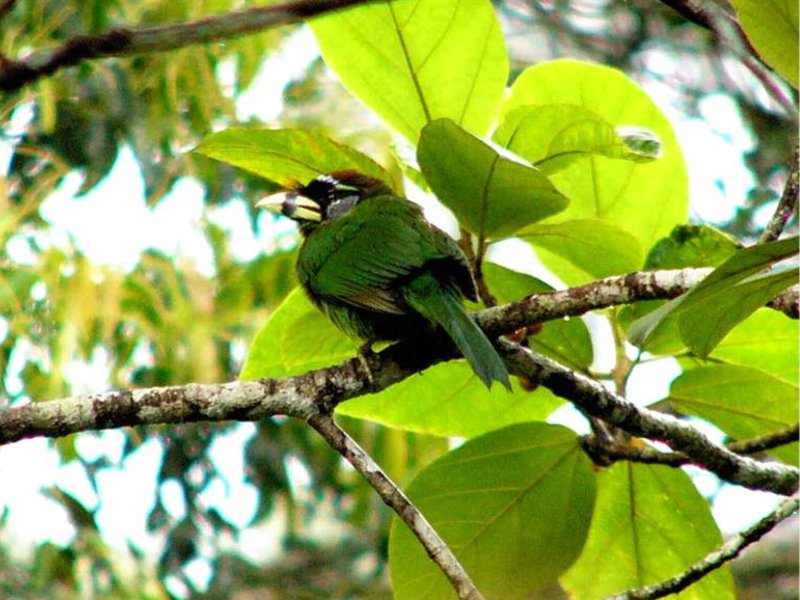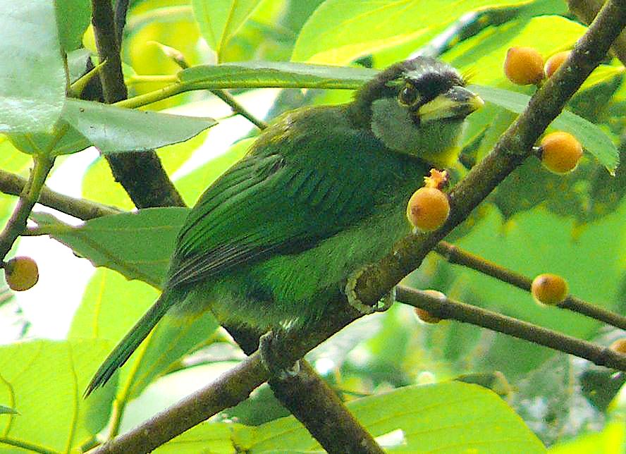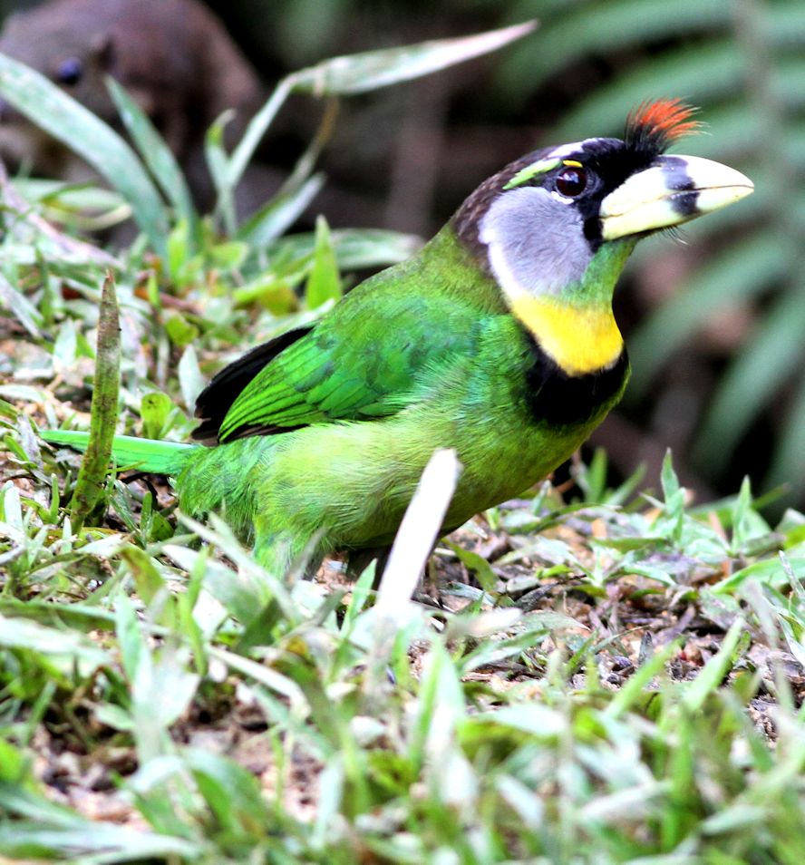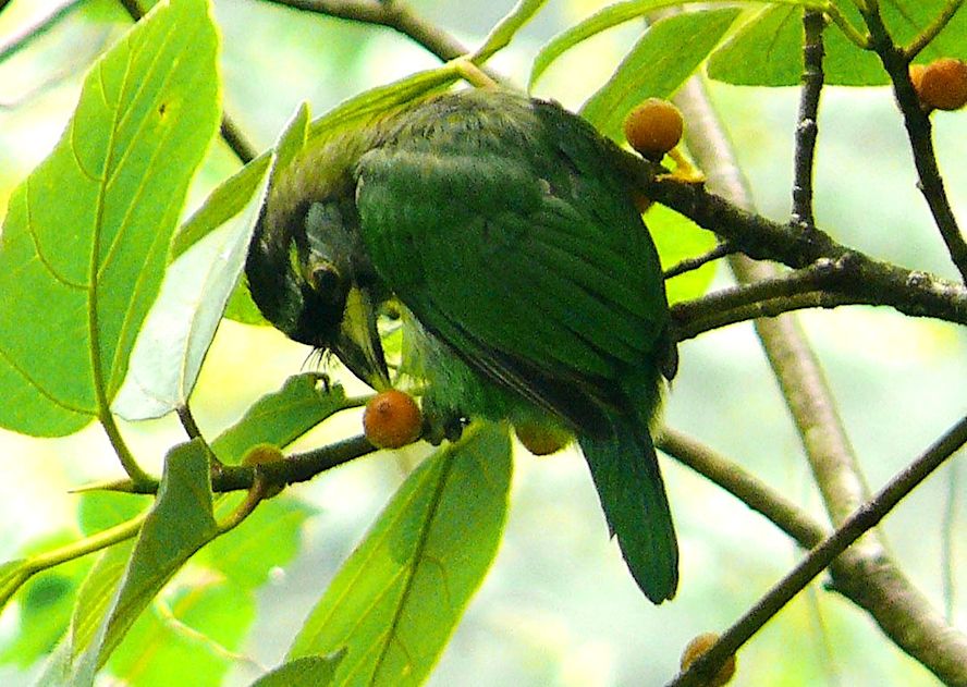 Size & diagnostic markings:- 28 Cm. Though not the largest but this is a big Barbet. This unique bird has ivory-greenish bill with a faint vertical black band at the center. Throat whitish with a yellow band across the chest lined in black. More features - the forehead and lores black with a prominent red tuft appearing as spines from the base of the upper bill. Distribution :- This is a bird from Sumatra but also a very common bird in our sub-montane hill stations. Habitats & preferences:- For us, the Fire-tufted barbet stays in the forest of the sub-montane climate Fire-tufted Barbet is member of the club of big Barbets, though not the biggest. It is 28 cm and has an unique bill. Yellowish with vertical bands at the center. Though it is a large bird, not easy to spot this green bird among the foliage, even its rough whereabouts is betrayed by its call.. Its presence is announced by a series of Cicadas type calls. Again quite a common occurrence in the resort areas in Frasers Hills. It is not a shy bird and make no attempt to disappeared when human presence detected. Meaning they do visited gardens of holiday homes. I have seen them as a solitary bird but have also seen them in pairs, perhaps it was during the breeding season. Then when it comes to feeding in the fruiting season, the whole community of Fire-tufted would descend on that particular tree.