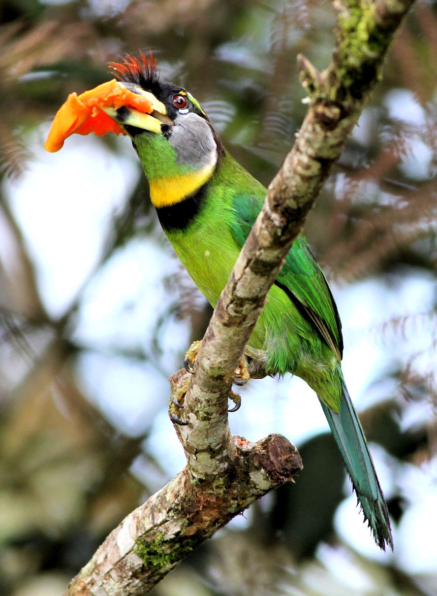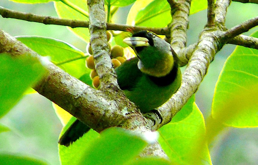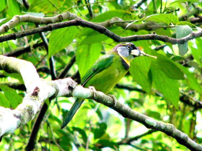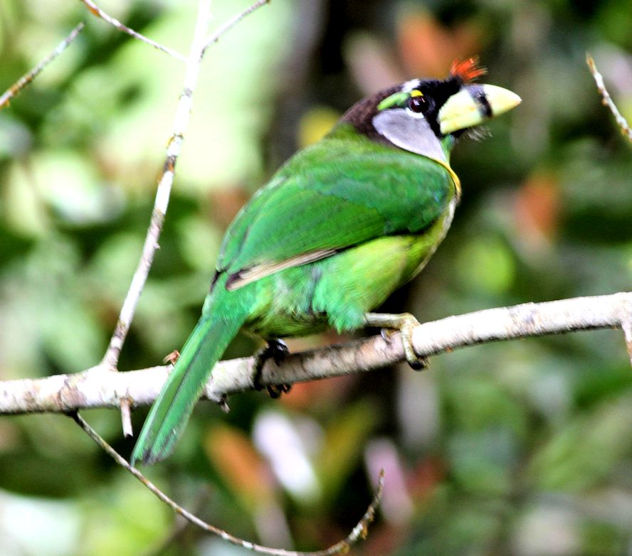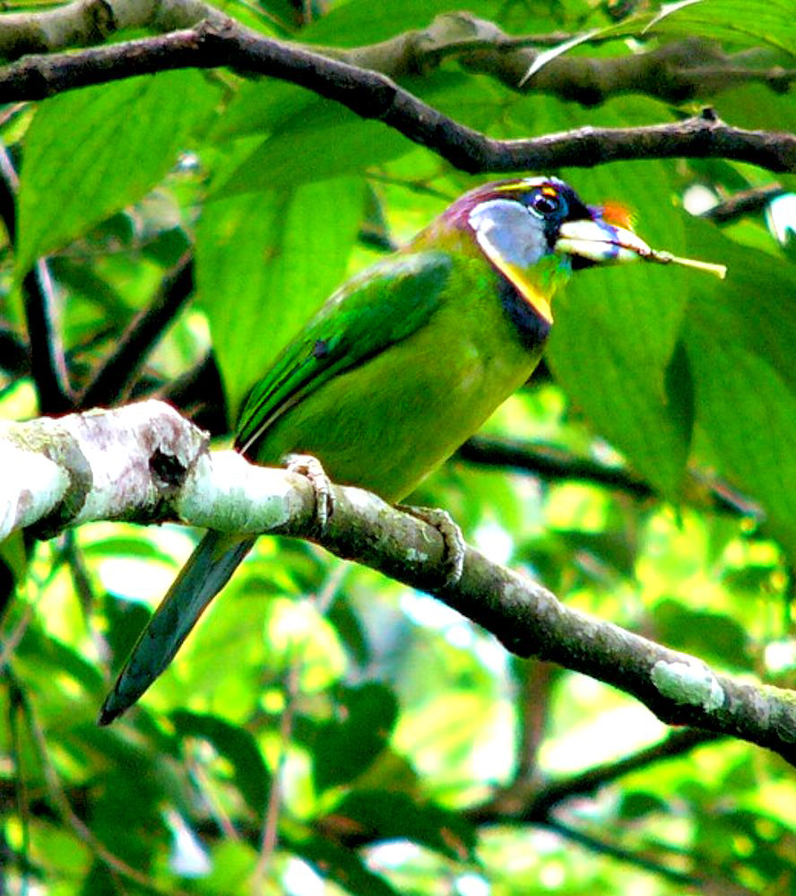 Size & diagnostic markings:- 28 Cm. Though not the largest but this is a big Barbet. This unique bird has ivory-greenish bill with a faint vertical black band at the center. Throat whitish with a yellow band across the chest lined in black. More features - the forehead and lores black with a prominent red tuft appearing as spines from the base of the upper bill. Distribution :- This is a bird from Sumatra but also a very common bird in our sub-montane hill stations. Habitats & preferences:- For us, the Fire-tufted barbet stays in the forest of the sub-montane climate Fire-tufted Barbet is member of the club of big Barbets, though not the biggest. It is 28 cm and has an unique bill. Yellowish with vertical bands at the center. Though it is a large bird, not easy to spot this green bird among the foliage, even its rough whereabouts is betrayed by its call.. Its presence is announced by a series of Cicadas type calls. Again quite a common occurrence in the resort areas in Frasers Hills. It is not a shy bird and make no attempt to disappeared when human presence detected. Meaning they do visited gardens of holiday homes. I have seen them as a solitary bird but have also seen them in pairs, perhaps it was during the breeding season. Then when it comes to feeding in the fruiting season, the whole community of Fire-tufted would descend on that particular tree.