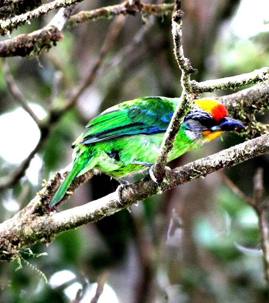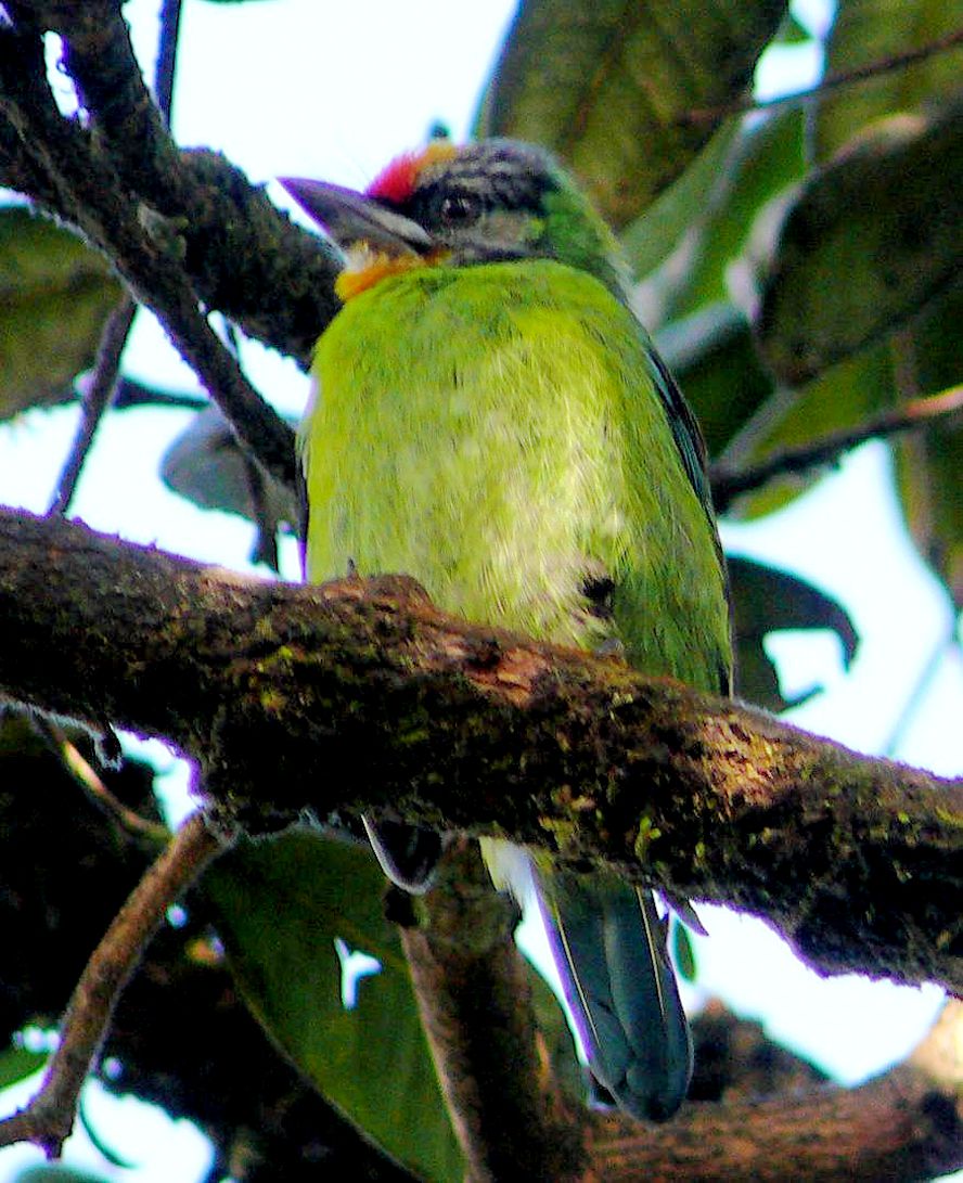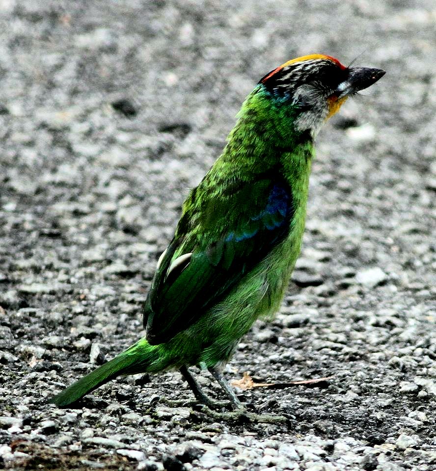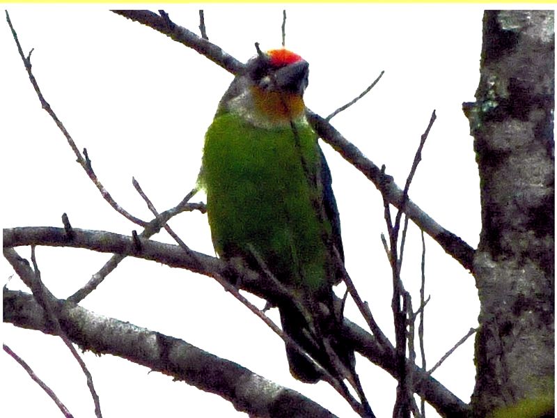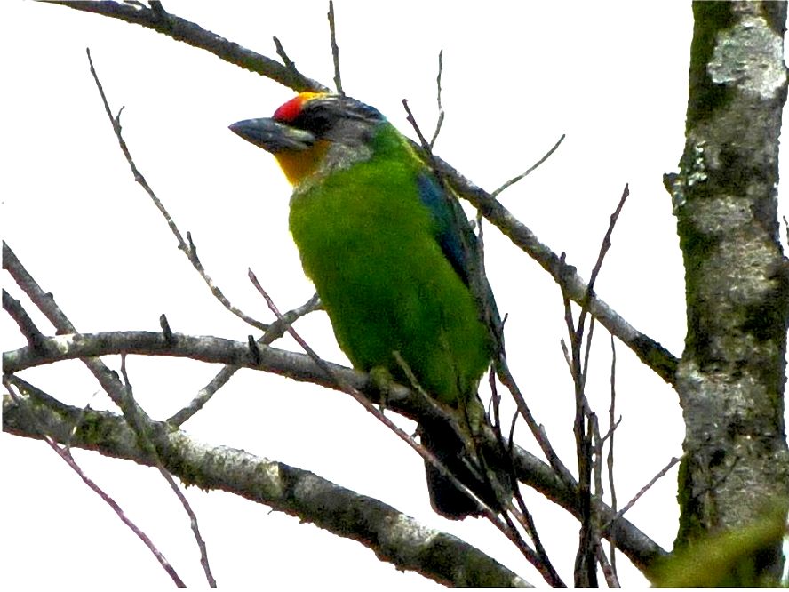 Size & diagnostic markings:- 22 Cm. The Golden-throated Barbet is a medium size Barbet. The most striking feature would be the bright red crown, in the front and rear separated by a yellow patch. The upper throat is also yellow followed with a pale grey lower down. A faint black band across the eye dispersing into streaks. Distribution :- The bird is resident to Nepal, North-eastern Indian Sub-continent and south-western China. The bird is commonly spotted in the montane region in Malaysia. Here mainly Gunong Ulu Kali and Gunong Brinchang. Habitats & preferences:- For us in Malaysia, this is the most obvious bird in a montane climate I would say that this is not a common bird to spot, each trip to Gunong Brinchang I never fail to hear their calls and were coming from spots closely nearby. So this is another bird that is easy to ID. Reason - the one and only montane Barbet. At times, I did get to see this bird, on most when I was there but only momentarily when it left its hiding perch and landing some where I cannot see. There were also during those brief exchanges in glances, the bird would be hoping from branches to branches. Other Barbets would stay in one position for a while, if there was a need to assess it's safety. In total, I had much less chances of a good look at the Golden-throated when compared with other Barbets, hence information about the bird is sketchy. A large bird, after the Javan Cuckooshrike, in comparison with other birds in the area, but it is in fact a medium size Barbet at 25 cm.