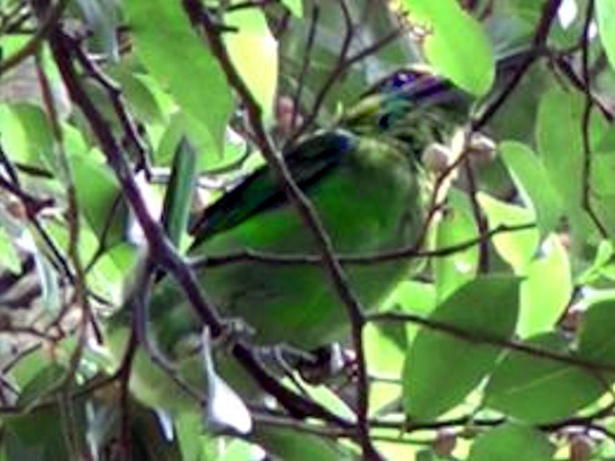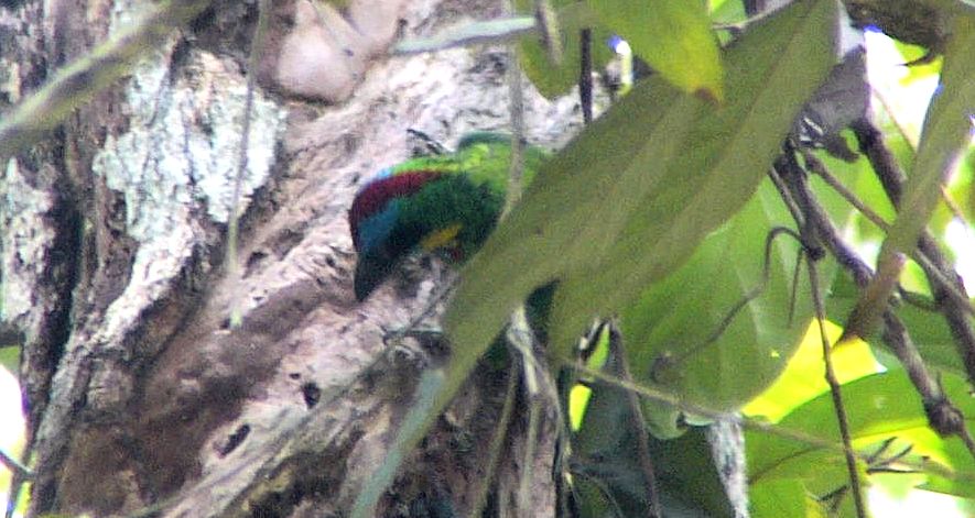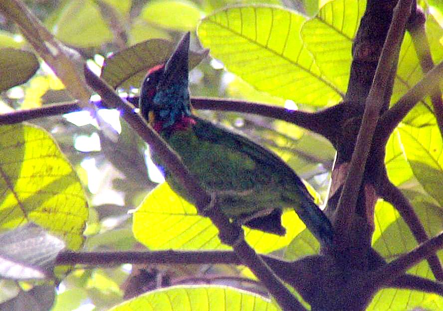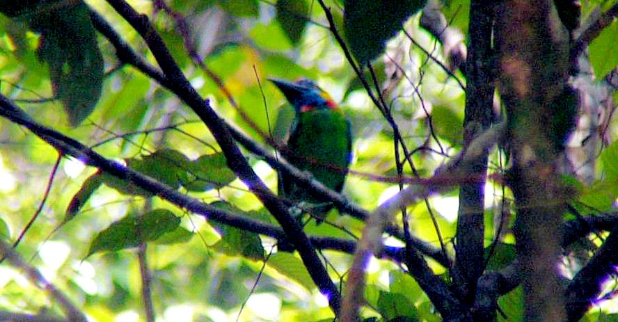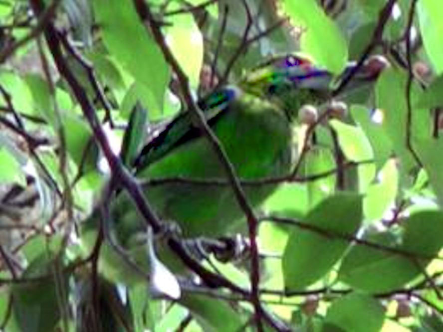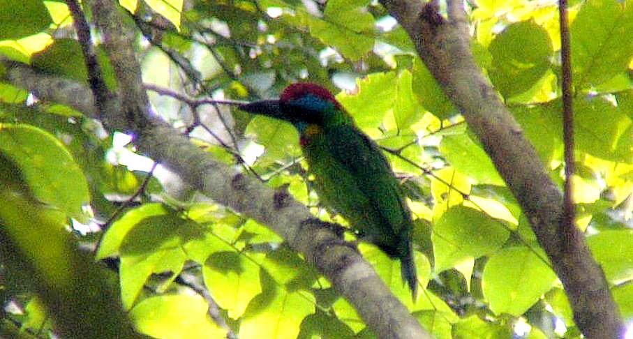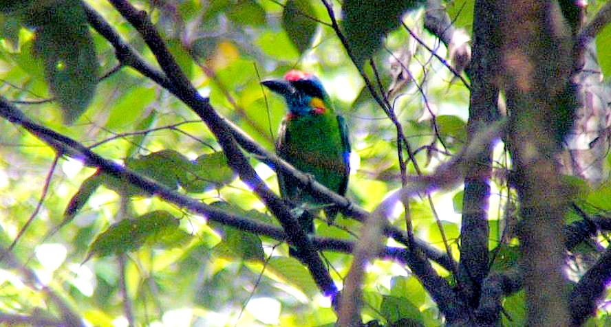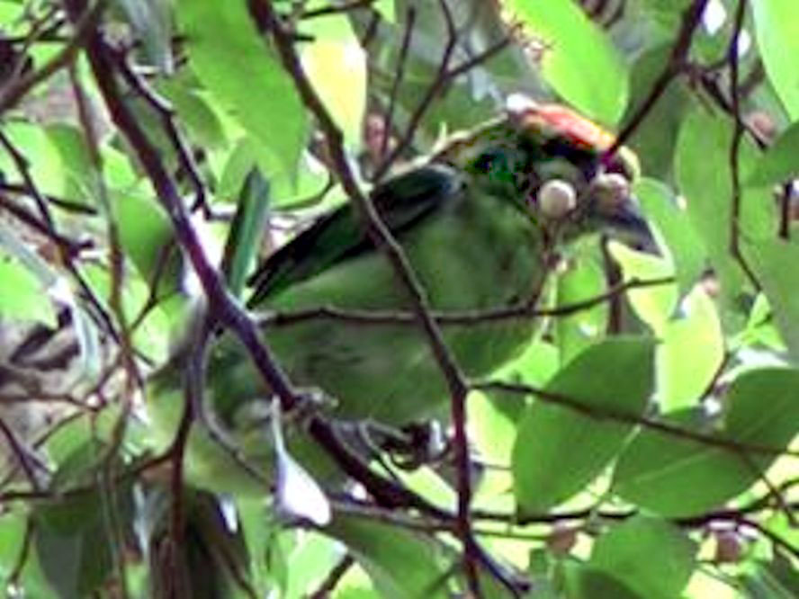 Size & diagnostic markings:- 26 cm. The Red-crowned Barbet. Significant with this bird is the blue face and upper throat, prominent red patch on the fore crown and continued as a band along the entire crown then both sides of the crown - Blue. Then another small patch of red on the side at the upper breast. Just beside this red patch on the breast there is a larger yellow patch above it and side by side. Distribution :- This bird is the resident for the islands of Borneo and Sumatra. It is also available in Peninsula but in small numbers and not often encountered. Habitats & preferences:- This is a bird of the thick lowland forest, may sometimes found in low hillside forest. This is another mid size Barbet of 27 cm that is seldom seen. This is a Barbet of the lowland forest. According to Bird's books, it moves around with other Barbets and is a canopy bird. The pictures that I am having is from a batch taken in the Pandan Waterfalls in Kuantan. The birds, a family of 4 were gathering fruits in the middle storey. They were alone and not part of a bird wave. I spent close to 30 minutes watching them and they appeared undisturbed by my presence. Lightings under the dark canopy was not conducive for photography.