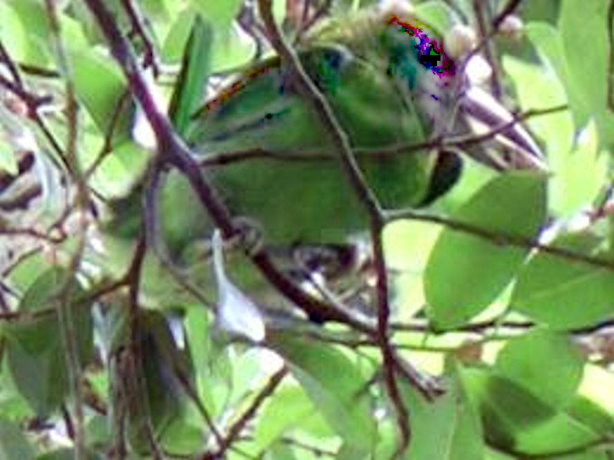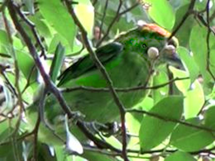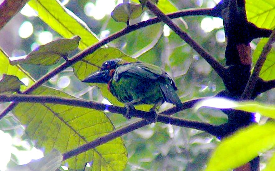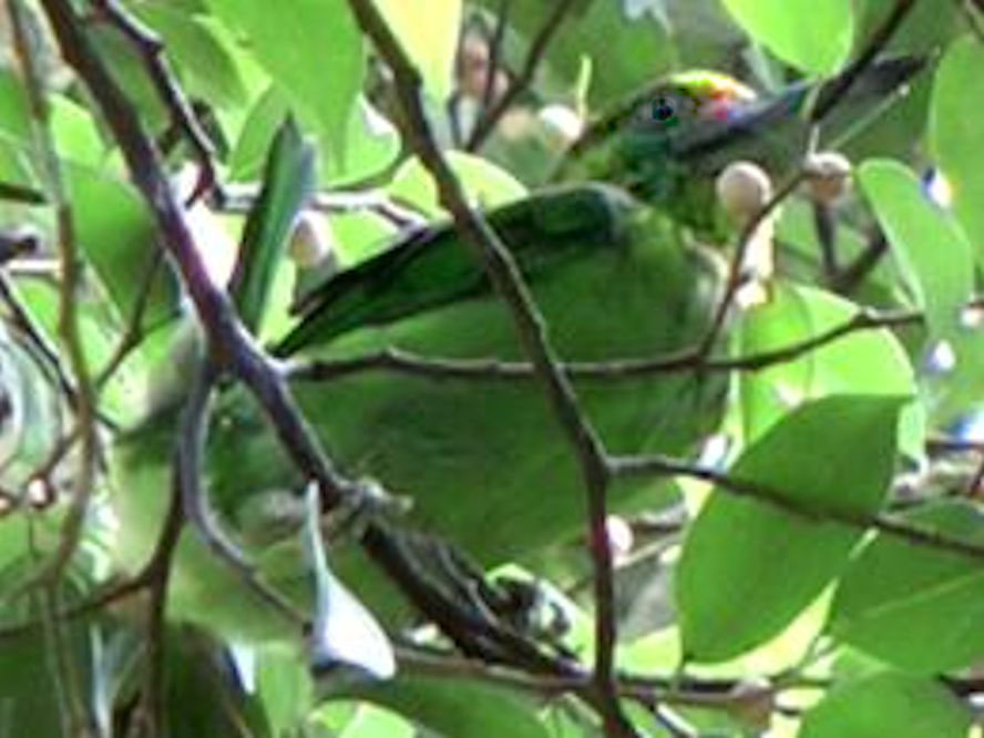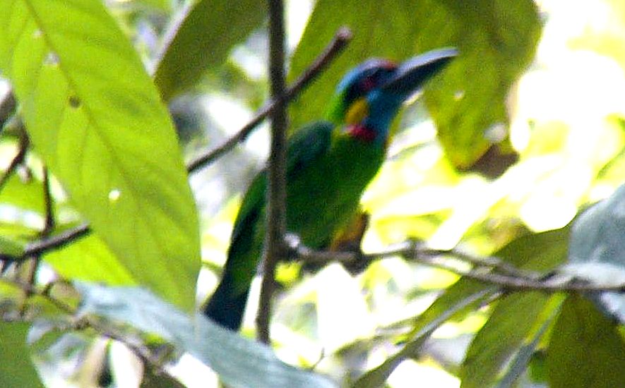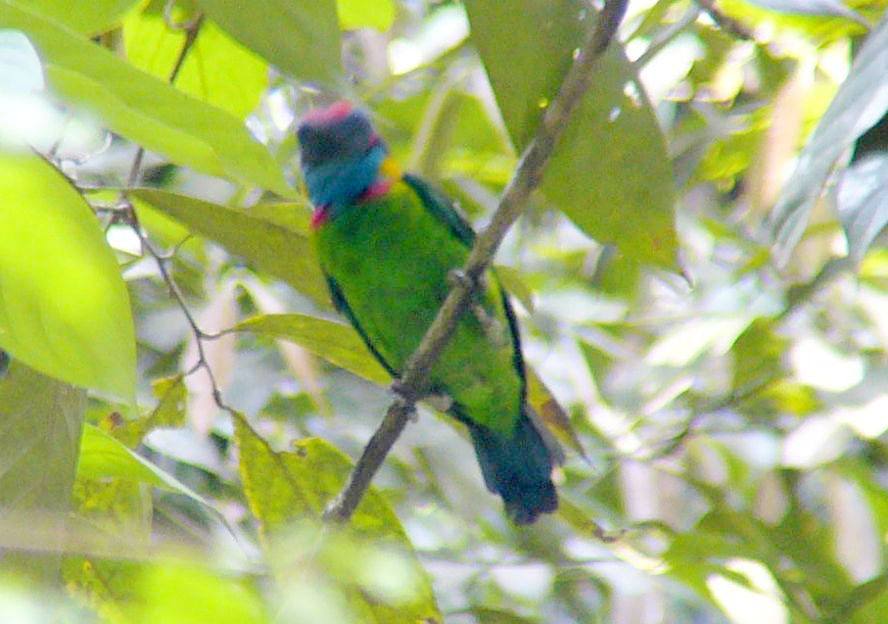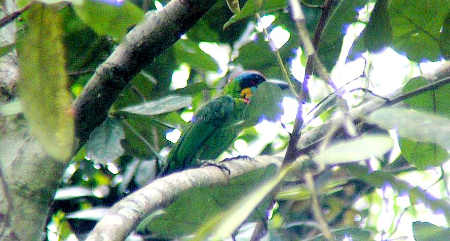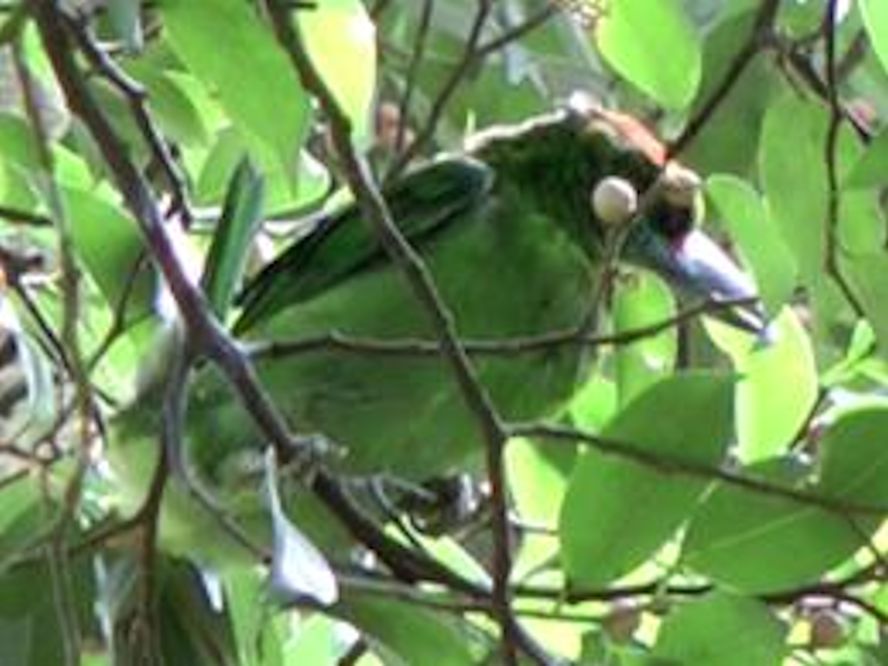 Size & diagnostic markings:- 26 cm. The Red-crowned Barbet. Significant with this bird is the blue face and upper throat, prominent red patch on the fore crown and continued as a band along the entire crown then both sides of the crown - Blue. Then another small patch of red on the side at the upper breast. Just beside this red patch on the breast there is a larger yellow patch above it and side by side. Distribution :- This bird is the resident for the islands of Borneo and Sumatra. It is also available in Peninsula but in small numbers and not often encountered. Habitats & preferences:- This is a bird of the thick lowland forest, may sometimes found in low hillside forest. This is another mid size Barbet of 27 cm that is seldom seen. This is a Barbet of the lowland forest. According to Bird's books, it moves around with other Barbets and is a canopy bird. The pictures that I am having is from a batch taken in the Pandan Waterfalls in Kuantan. The birds, a family of 4 were gathering fruits in the middle storey. They were alone and not part of a bird wave. I spent close to 30 minutes watching them and they appeared undisturbed by my presence. Lightings under the dark canopy was not conducive for photography.