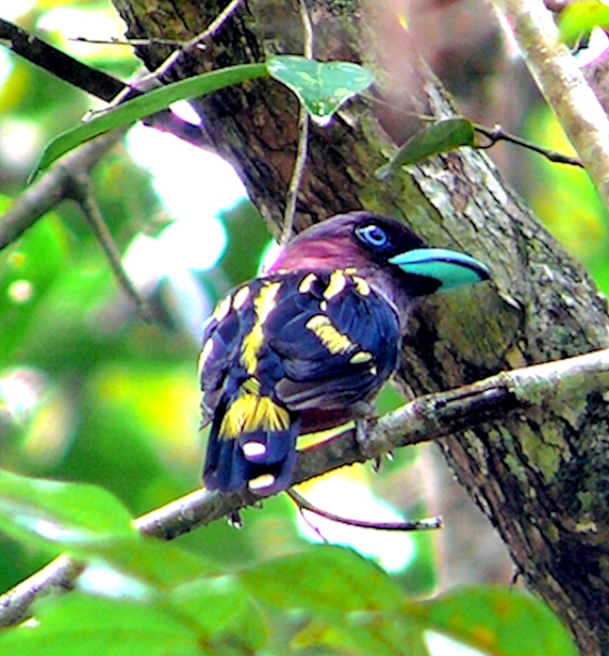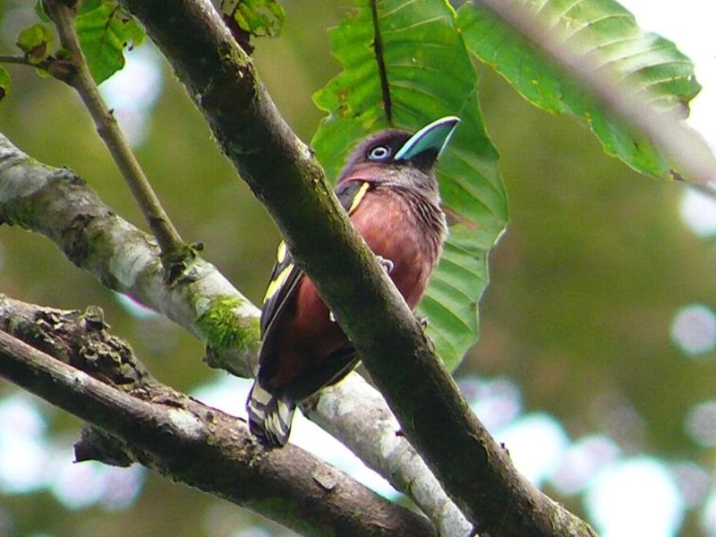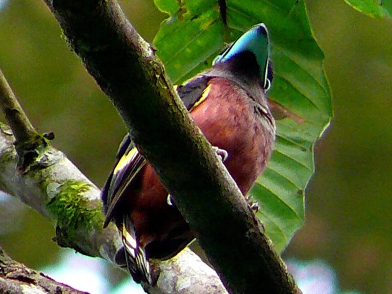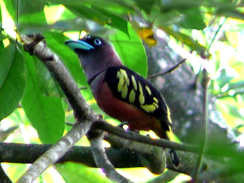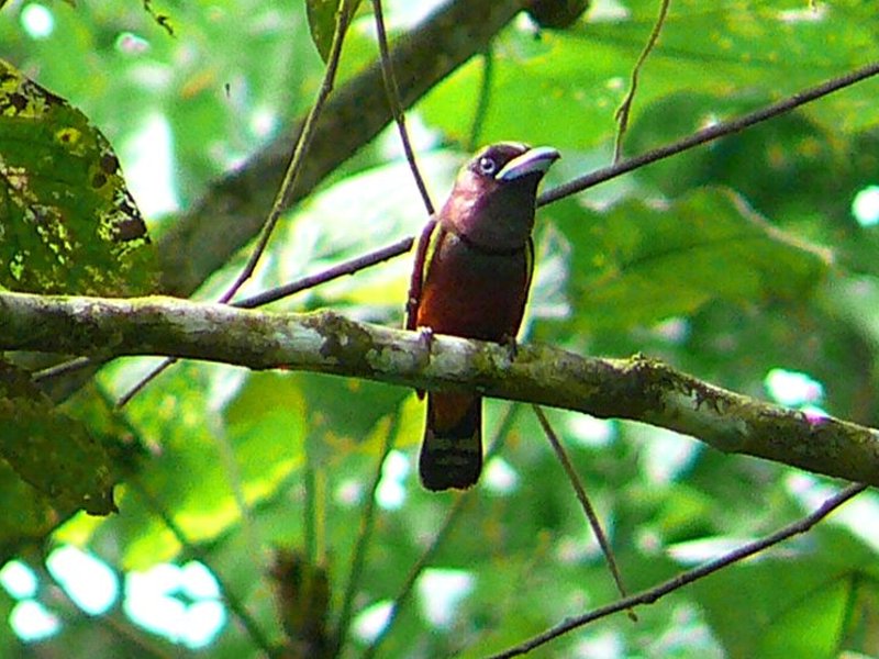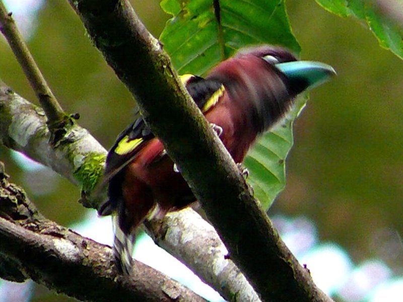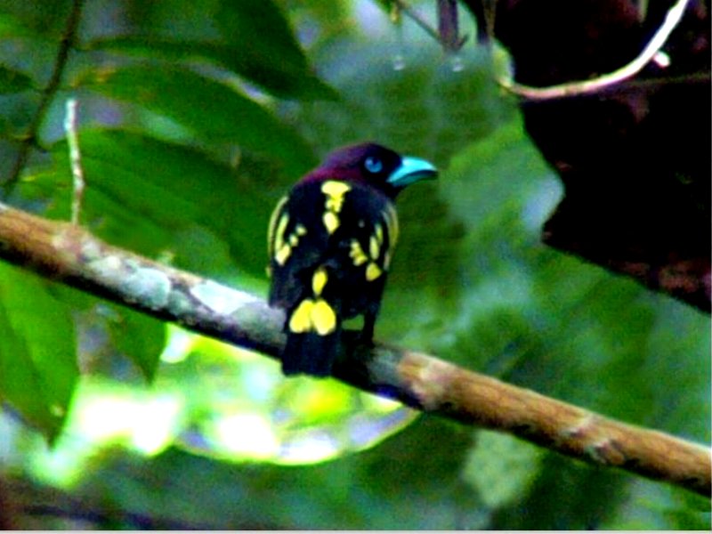 Size & diagnostic markings:- 22Cm. This is a very colorful Broadbill. First, the prominent call will ID this species. Then it has a habit of appearing on visible branches, usually in middle storey. More often in one or two positions before flying off deeper into the jungle. The upper part of this broadbill is dark maroon with large patches of bright yellow markings. It has the similar dull maroon head. The under part has a varying shades of brighter maroon. These marking also appear on the blackish brown wings. The broad yellow band s appears on the wings in flight Distribution :- The bird is resident in the Greater Sundas Habitats & preferences:- The bird prefers thick forest in the lowlands but also appear near sub-montane environment if the area has fairly moist forest such as a stream nearby. I do not have that much experiences with the Banded Broadbill. I mean, I am still waiting for the chance to watch them nesting or feeding. This bird presence in an designated area is very much marked by sounds of its rolling call - actually calls made by both birds in harmony. A very common sound in the forest. I would say that the frequency of hearing that calls would be as high as 80% of the occasions that I am in the forested area. It created such a lasting impression. When I compared these calls with the series of single note calls by other Broadbills, I would say that the incidence is so high that I would deduced that Banded Broadbill is the most vocal among birds. Could it be a fact that this is one species of Broadbill that is most common. When you have chance to make a special note of how often you had hear that call, then you may even agree with me. They seemed to be around, always. Very comforting as well especially when you are out on a day of birding trip. Hearing that call means there might be a chance of meeting up with a quality bird for that day.