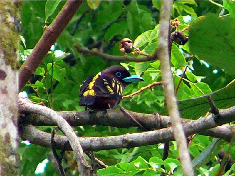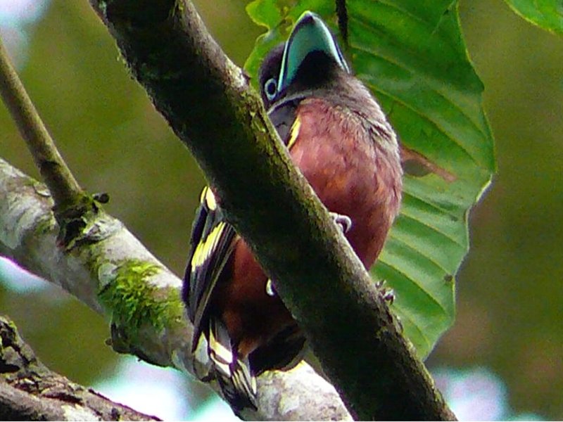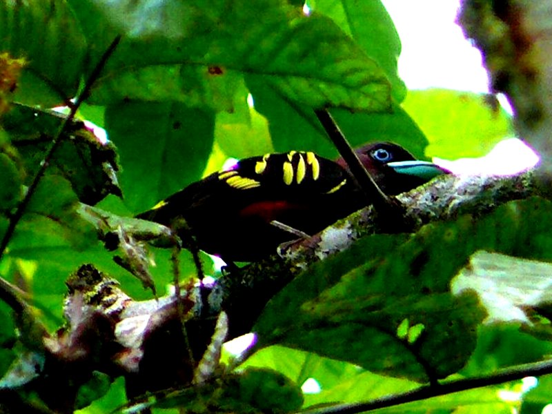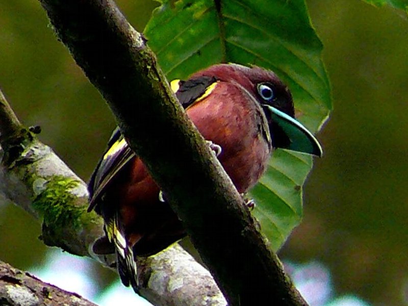 This bird is less often seen when compared with the Black& Red or the Black & Yellow Broadbills. This is another lowland Broadbill in dull red color and marked with prominent yellow patches. The bird prefers middle storey, which means staying rather high on tall trees. That explain the reason why the bird is spotted less frequent when compared to the other two Broadbills. While the nest may have the untidy Broadbill style outlook, these nests too are suspended very high up on the tree. Very much opposite that of Black & Yellow which is at low height and away from area with water.