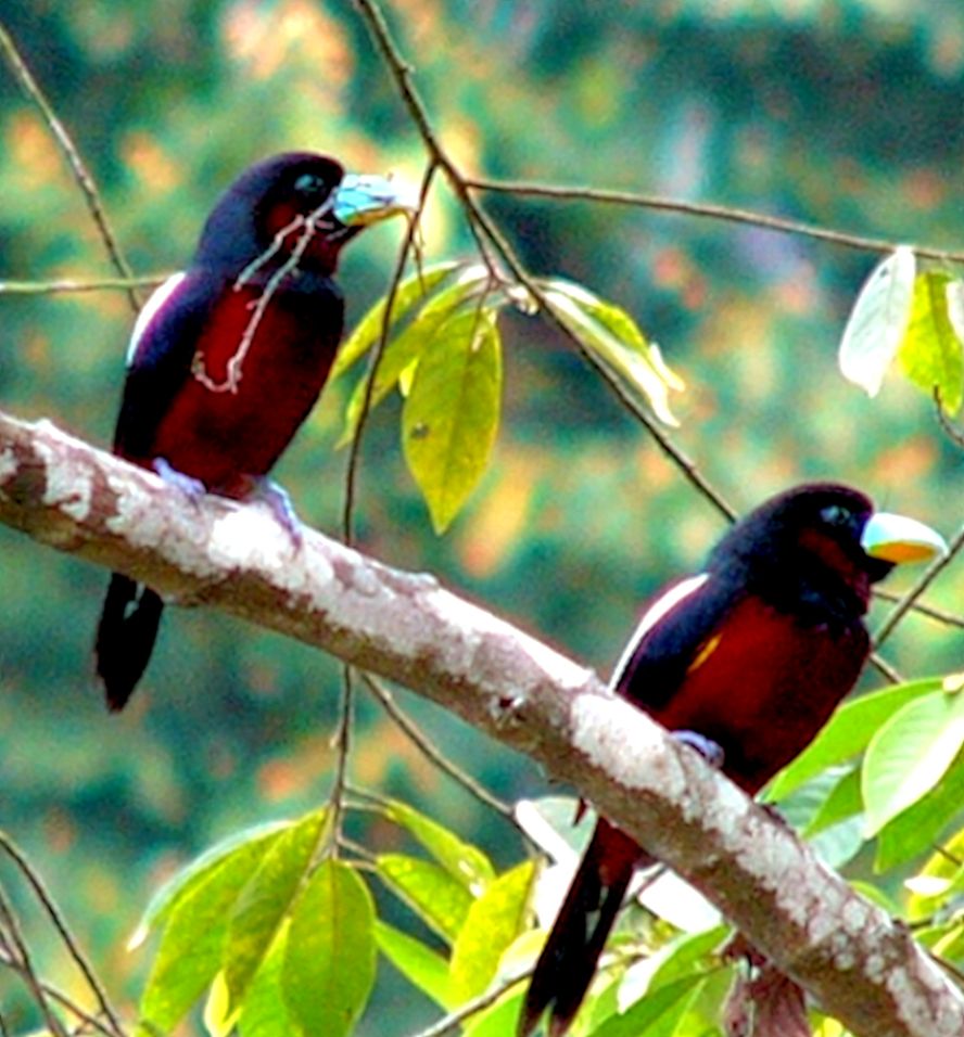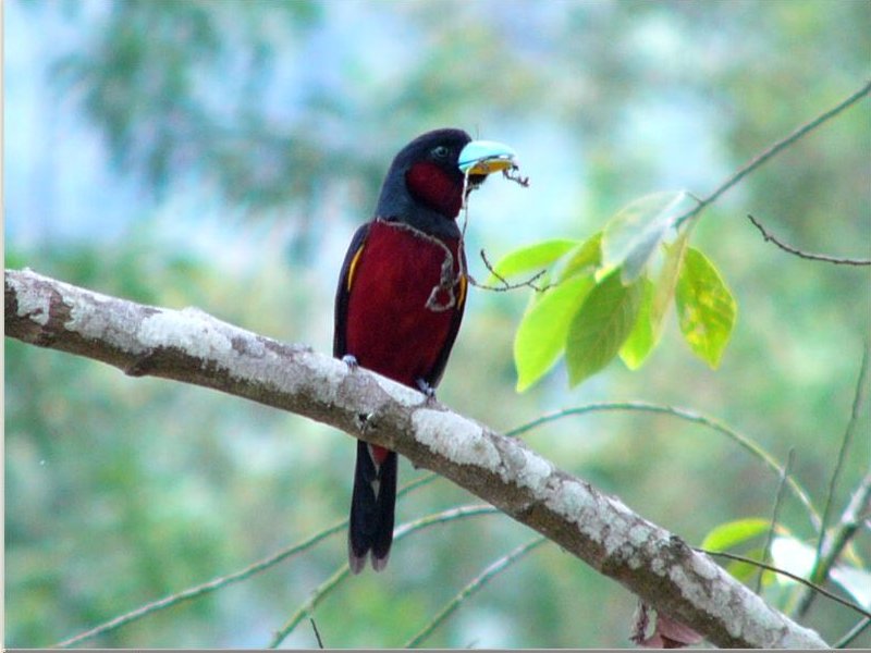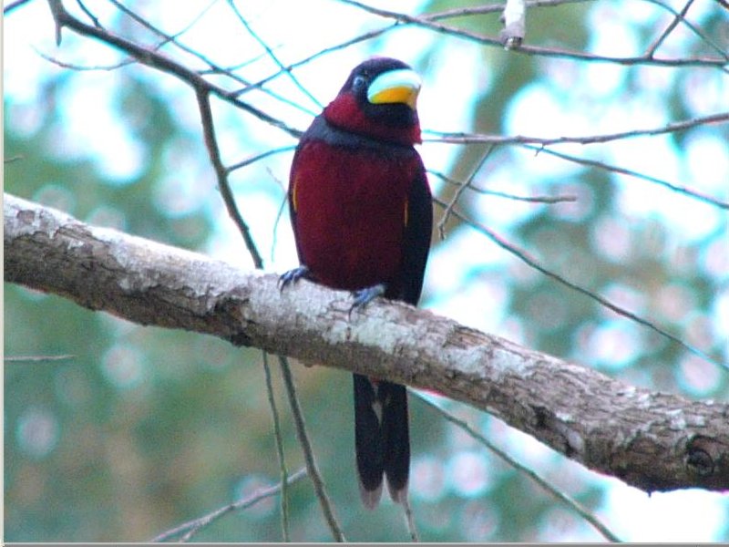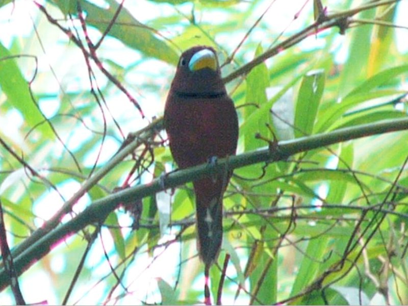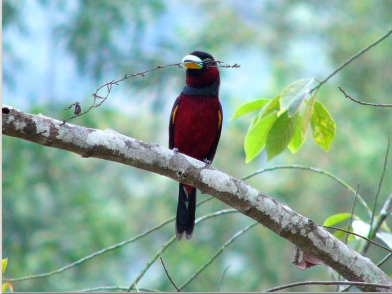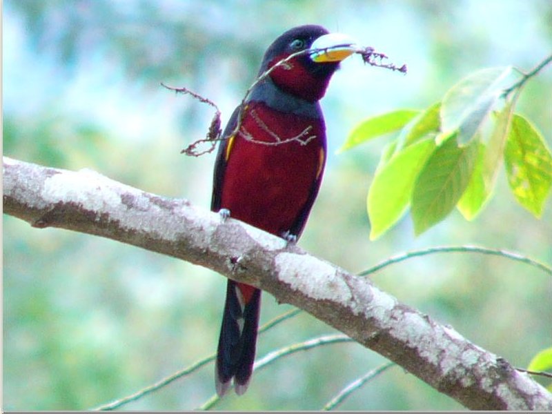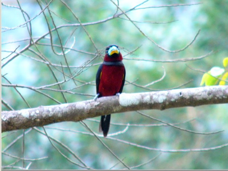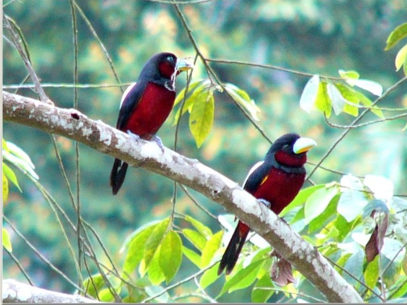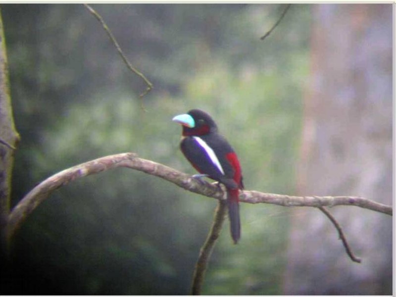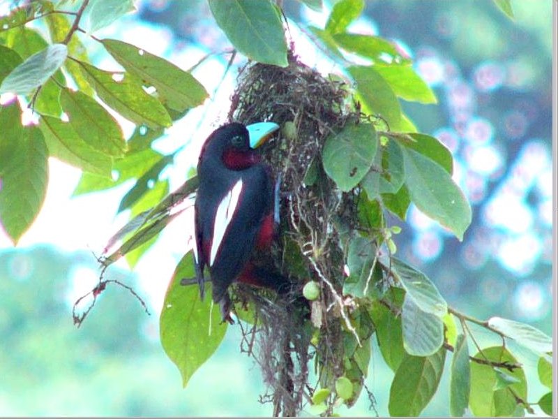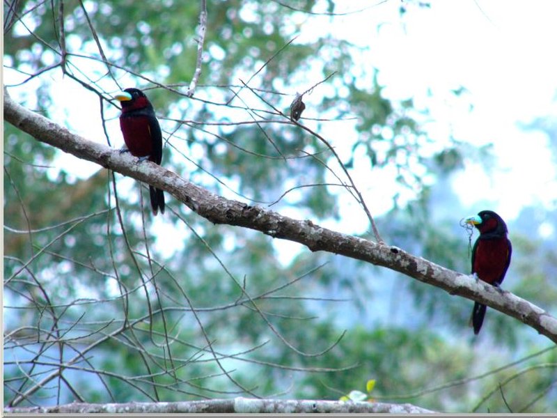 Size & diagnostic markings:- 24 Cm. This bird appears much larger and easier to see. It comes out in the open, meaning perched on spots that are near and clearly visible. During mating period in pairs too. The Black & Red Broadbill may appears like the size of an ordinary Bulbul bird while the Banded like that of a Flycatcher, though this bird is generally the same size as the Banded. The crown and the band at the neck with the upper part is black. The face and the rest of the under part is dark maroon. A long white streak run from front to end of wing then the very prominent upper mandible is bright turquoise while the lower mandible in yellow. Distribution :- The bird is resident in the Islands of Sumatra and Borneo Habitats & preferences:- This a lowland forest bird, not forest edge nor open country bird as it stays mainly in the deep forest while its nest is constructed in open view more often than not, above water. This is a very distinctive bird with its bright maroon color and turquoise-blue bill. Very prominently broad as compared to other birds. In actual fact, there is no need for a look out for further diagnostic markings, like the broad black band across the neck or long white streak along the wing. If needed more confirmations, then compare this bird with the Banded broadbill which is also maroon but with bright yellow patches. The Red & Black Broadbill has no yellow marking at all. In the field, both birds are unmistakable and easily distinguished from one another. This is a very common bird in the undisturbed lowland forest. With rapid development and the fact that this bird do come to the forest edge, it is not surprising to have them very close to areas with humans habitats. Lately I am following through a few couples living in the compound of FRIM in Selangor. Here there was an endless stream of workers were moving around their chores, yet the birds were constructing nest in the ponds, one after another. The nests, at least 2 of them were destroyed or had fallen down. New one sprung up. I have now seen the fact about the bird's preferences place with water as nesting sites. The birds were seen in area next to a pond or river. On quite few occasions I had seen nests built in the middle of the a pond or nest over hanging the water's edge.