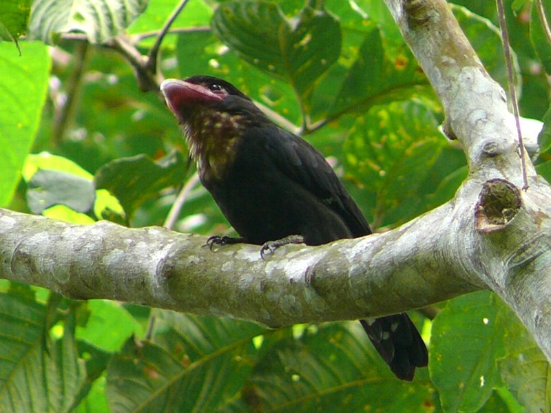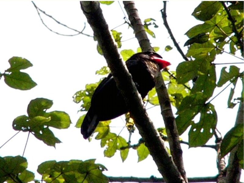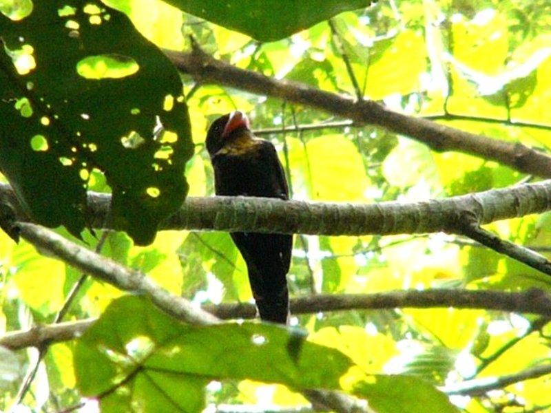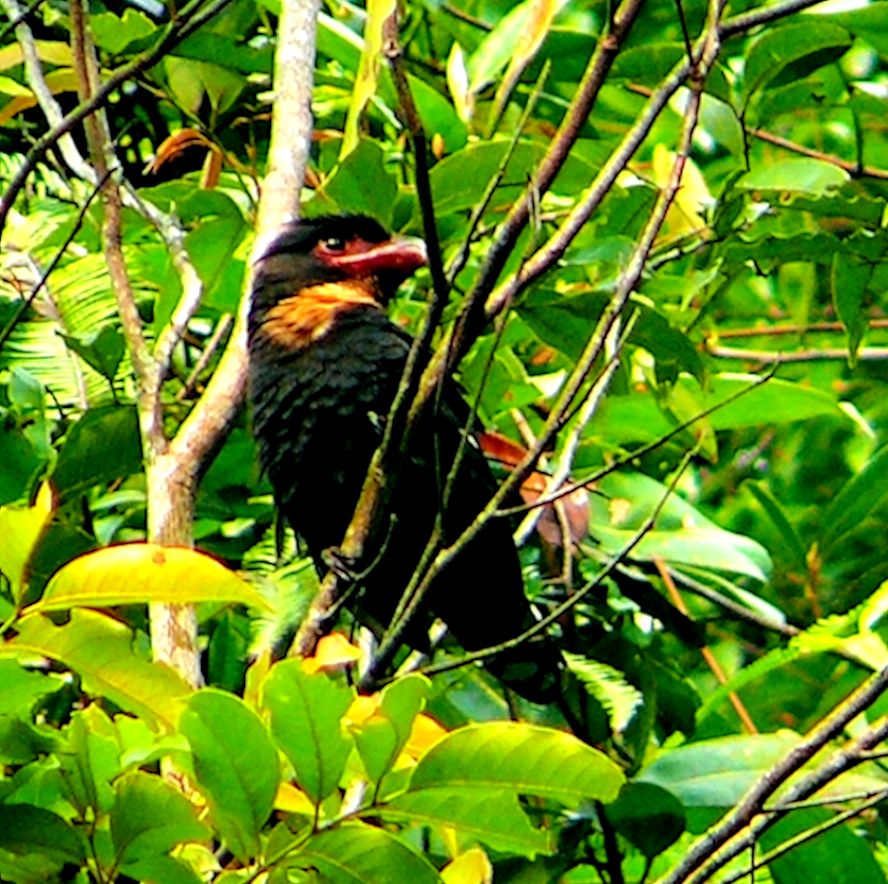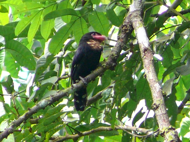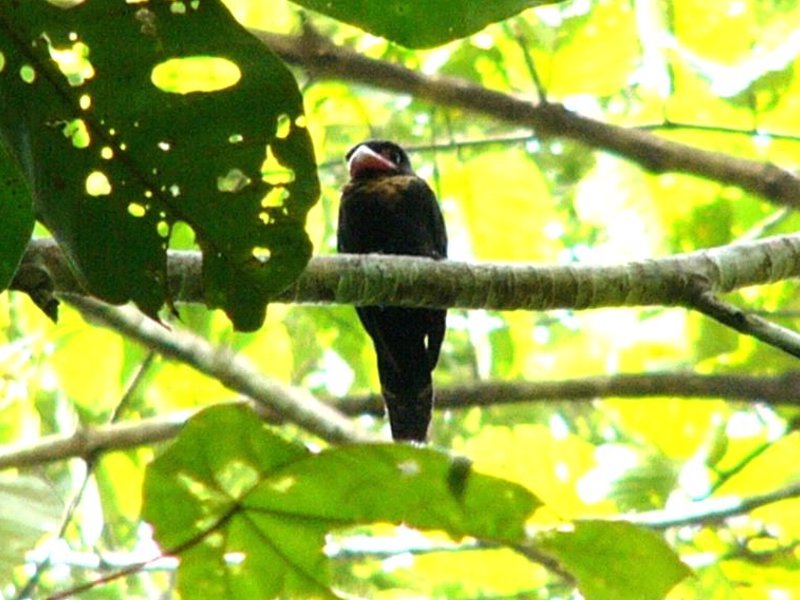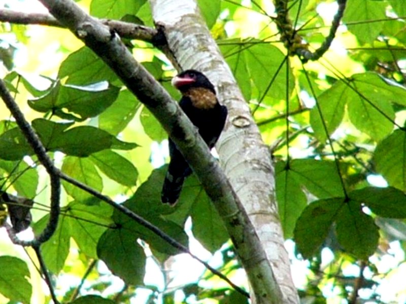 Size & diagnostic markings:- 28 Cm. This bird had loud calls and large nests. It is rarely seen and only when the season for nesting, their presence becomes obvious. Though very large in size, the bird prefers the upper storey and so always some distances away when spotted. The Dusky broadbill is a large and bulky bird. The bird is nearly blackish brown all round with the exception of the throat and upper breast which is buffy and in creamy color. The broad bills is reddish with a grey tip. The facial skin is dull purple. Distribution :- The bird is resident in the Islands of Sumatra and Borneo. Habitats & preferences:- This is a lowland forest bird found in thick forest with rivers. the bird can also be found in the sub-montane environment. Prefers the upper storey and normally detected by its calls. I learn some tricks of birding from Uncle Foo, like many others too. He influenced me into thinking that the Dusky Broadbill is an ugly bird. That impression was etched into my mind especially after seeing the whole family in Congkak as my lifer. Large birds and perched very high up. The air and the surrounding were filled with their calls. Yes, at first glance their looks was so un-Broadbill which are known for their vibrant colors. The Dusky Broadbill as the name implies, is dark in color and a very outstanding broad bill to add to that unusual look. It was not until many years later that with the Panasonic FZ 10 camera that I was able to have pictures of this bird in quality I can decipher. Though odd, the bird has beauty of its own. It is not black but dark brown. What is really outstanding is the beige colored buffy throat combined with a out of proportion reddish bill. Another lowland bird that prefers low hills. They travel in flock and making lots of noises. Not easy to catch them as a chance meeting but need conscientious search. They prefer middle to the upper storey. On most encounter, they would be way out of range for most cameras. But there are exception. This pair in Bukit Tinggi was residing on rather high ground. In the afternoon, they would come down to almost eye level for "photographic sessions". I have also read the birds are more active in the late afternoon, just before dark. I do not have that much of experiences to verify this point.
