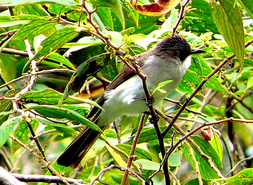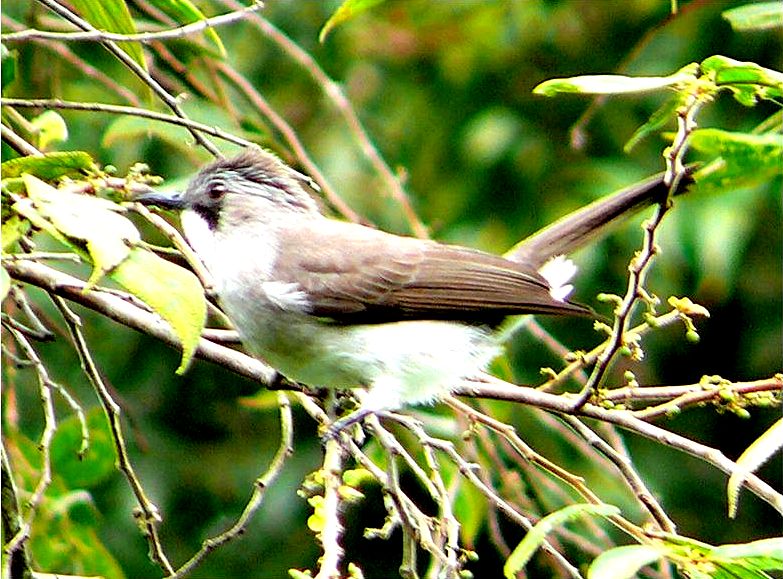 Malaysian Birds Ashy Bulbul Diagnostic markings :- 21 cm. Now this is one Bulbul that is not brown. The brown tinge is noticeable but the whole bird looks grayish. [1] On the head, brownish grey crown, face grayish and a distinctive triangular black patch as lore and cheek [2] Upper part is grey towards brownish tinge Under part - white with grey wash breast. So far all my encounters with the Ashy Bulbuls are during the fruiting seasons. Beyond that at normal times, I saw an isolated bird foraging but perhaps the fruits of flowers were not their favorite, their stay on the tree was only momentarily. Not enough time for proper photography too. Its best to note down the location of flowering tree and also the pertinent period. Ashy Bulbul pix # 1