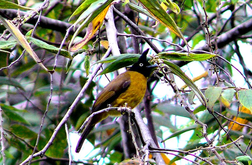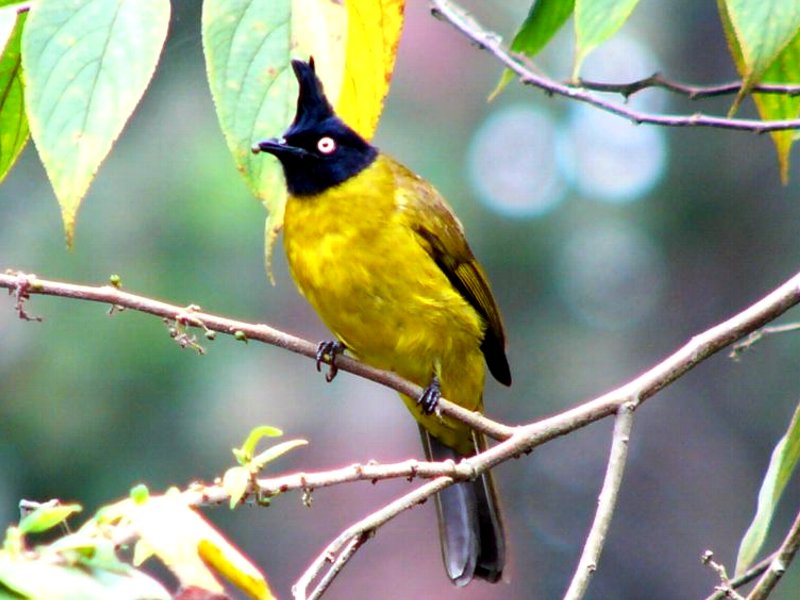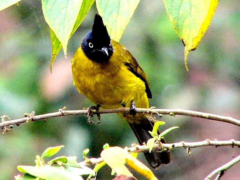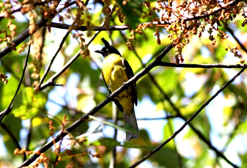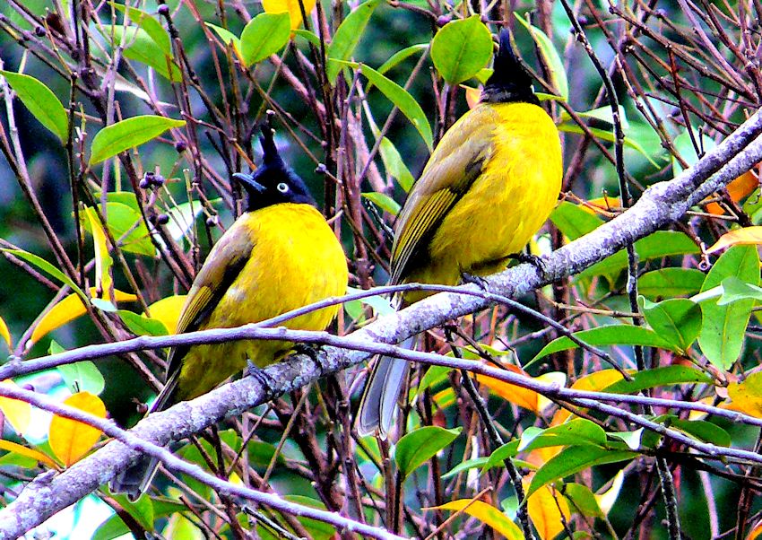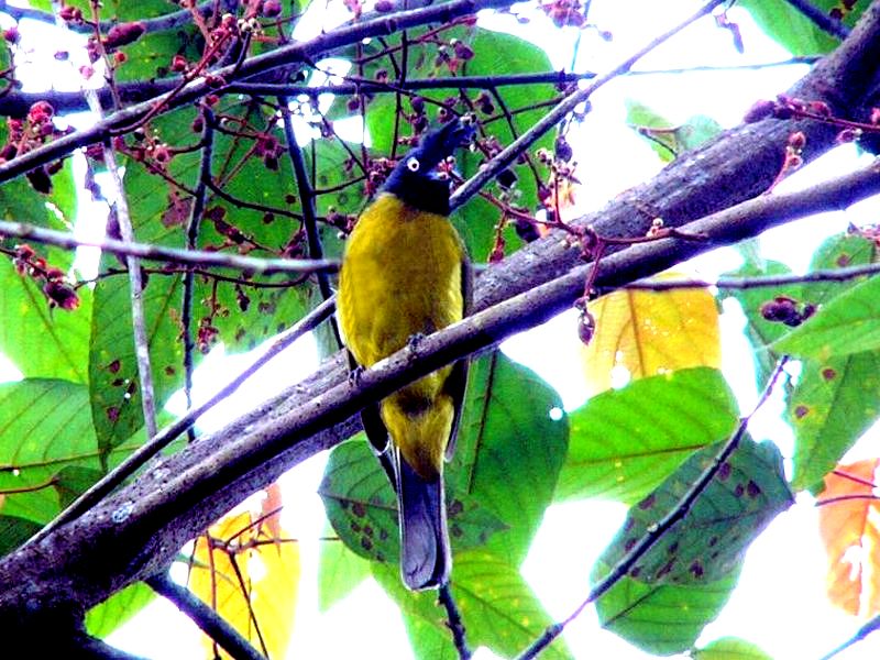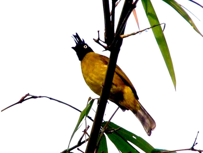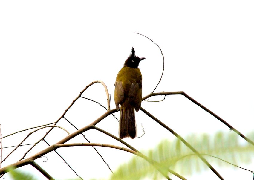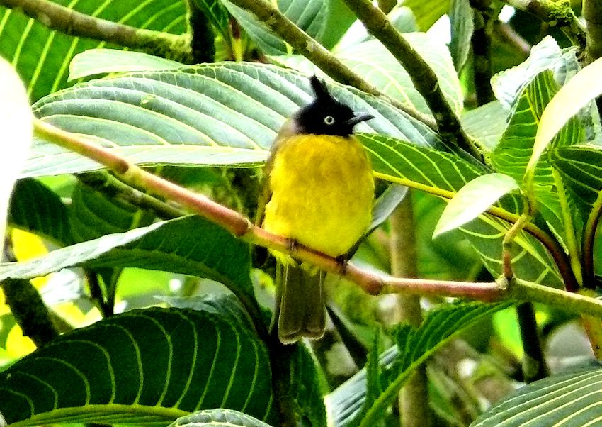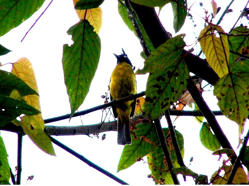 Malaysian Birds Black-crested Bulbul Diagnostic markings :- 19 cm. This is a very prominent bird, the very striking black crest and the birds picks ostentatious spot to perch and makes its call. Could be high up and also low as the ground level. [1] Glossy black head with a tall erected crest [2] Under part -and the yellow upper part olive green. There are 2 ways of spotting Black-crested Bulbuls [1] They are perched at some points that you cannot miss seeing [2] Listen for their calls, it is continuously repeated and usually a pair is very close by in some open perch. As I mentioned, very seldom, you will get Black-crested and Black-headed Bulbul together. Important to note as both birds have same habit of incessant calls. The Black-headed Bulbul is hiding, so be alert as to where to expect so as to spot them. Black-crested Bulbul bird's pix # 1