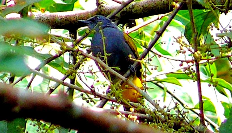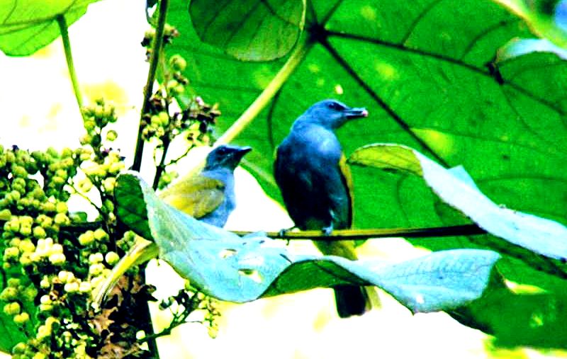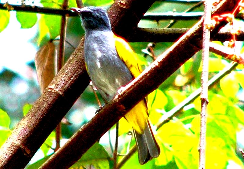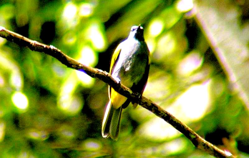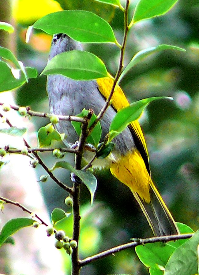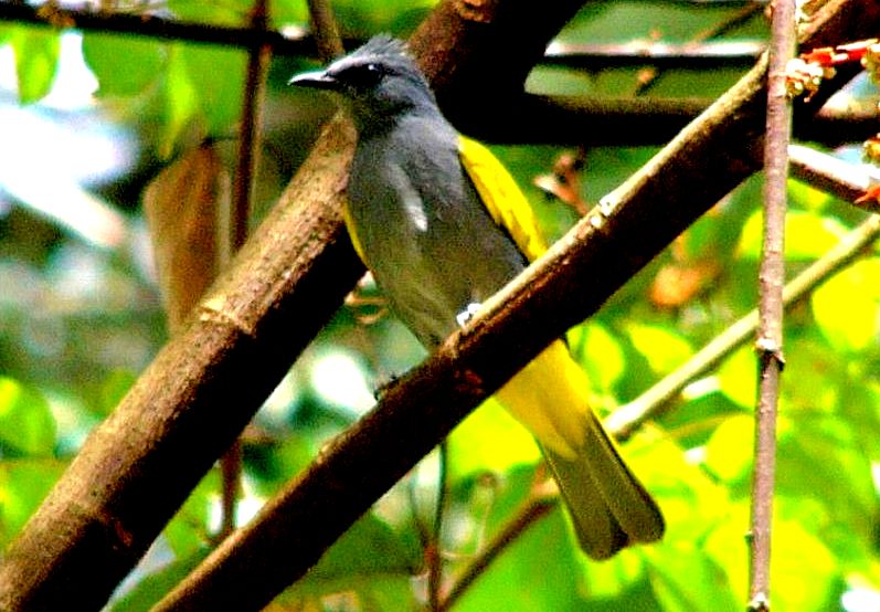 Diagnostic markings :- 16.5 cm. It is a small Bulbul alright but because of the dark colored belly and the very bright upper part, the bird stand out in the jungle setting and in a way also makes the bird appear to be larger that measurement hinted. [1] Grey head and belly, under part. [2] Yellow tail without band - upper part -olive greens. Watch out for low fruiting trees and those filled with lots of small birds like Flowerpeckers, Sunbirds and White-eyes. The largest bird among them should be the Grey-bellied Bulbul. Very distinctive, grey bellied with yellow tail and upper part. The bird though forages alone but in the same area at the same time, there could be several other birds but they do group together. Grey-bellied Bulbul pix # 1