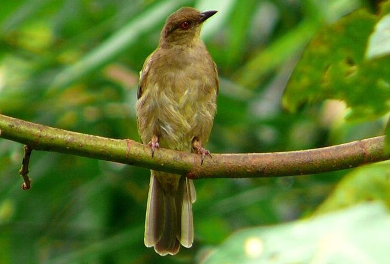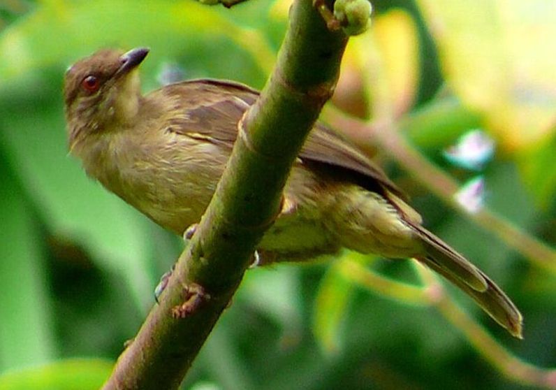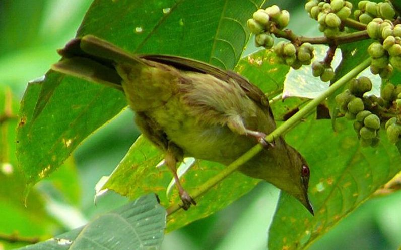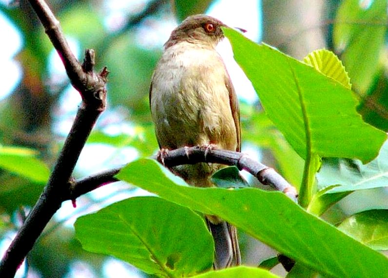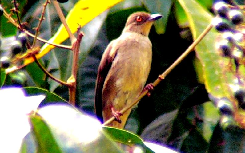 Diagnostic markings :- 19 cm.. This is bird with typical Bulbul size but somehow appears larger than its size. With the typical light brown tone uniformly, it is very difficult to identify, then focus on its eyes. [1] Distinctive red eyes [2] Very uniformly warm brown with a lighter shade on the under part. Bill is dark reddish brown. Has close resemblances to the Olive-winged Bulbul. Distribution :- The bird is resident to Sumatra and Borneo island and is a very common bird in our lowland forest. The big problem is that the bird is also mingled around by the Spectacled Bulbul which near identical other than the eyes. Habitats and preferences :- This is a lowland Bulbul that frequents forest trails and edges. Look out for low trees which are flowering or fruiting. It will remain feeding on the same tree for a while or return to the same tree each day during the season. Their presence is detected through the congregations of a few birds on the same tree. Same species or mixed group with other Bulbuls. Unmistakably Bulbul in shape and color, as I said over and over again, look for flowering tree and when a bird resembling the silhouette of Bulbul is spotted, glue your eyes onto the eyes. At certain angle the red color is very obvious. But it is not easy to look for the red eyes which can be seen as a reflection from the Sunlight. This Bulbul is a wandering birds feeding both on insects, nectars as well as fruits. Meaning the bird is seen throughout the year and do not have specific habits or preferred fruiting trees. When there is a fruiting tree, there they are, a few of them on the same tree and foraging together with other Bulbuls. Red-eyed Bulbul pix # 1