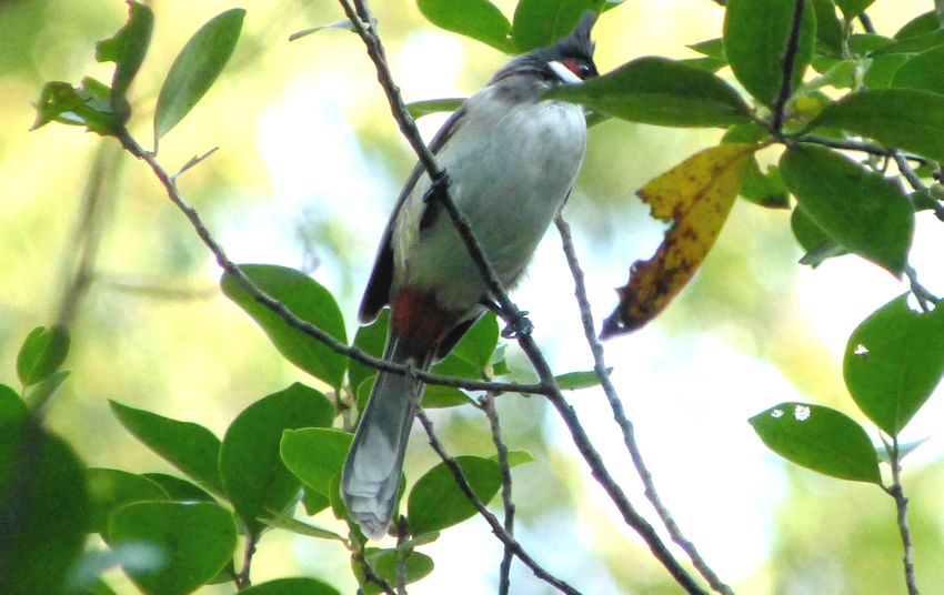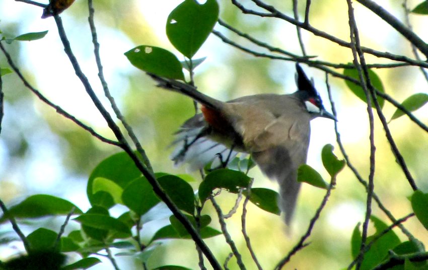 Diagnostic markings :- 20 cm. This is a very well sort after birds and not likely to be seen. Though a few still hanging around, the birds would appear when its favorite trees are fruiting. Still many hobbyists few that those spotted are either escapees or feral birds. To me judging from their habits and behavior those few I have seen were more likely to be wild birds. [1] Tall erected black crest [2] On the face, there is black moustachial line, white ear covert and red ear patch. [3] Upperpart dull brown and underpart white.[4] Undertail is also white Distribution :- This is a bird of continental India, countries south of the Himalayas and South-west China. Introduced in a few countries like Australia and North America. Habitats and preferences :- This is a lowland Bulbul that frequents open country and fields. Now there is a new trend since many of these birds were introduced, they frequent public parks as well as home garden. I saw my first Red-whiskered Bulbul in Rimba Kiara some 6 years back and never encounter the bird again. Then early this year, I was in Ampang at the jungle fringes opposite Kelab Darul Ehsan. There was a keen poachers lying in wait for the bird. Judging from his determination, he must have sighted the species in the same spot before. The point to note here is, that this bird appearing at forest edge, meaning this could be an authentic Bulbul and not an escapee. Again recently, a fruiting tree that attracted Yellow-vented, Striped-throated and Olive-winged Bulbuls also drawn in one Red-whiskered which hurriedly but quietly slipped in and left after a short time feeding of 45 minutes. I would say its habit is very unique and unlike any of the more common species of Bulbuls