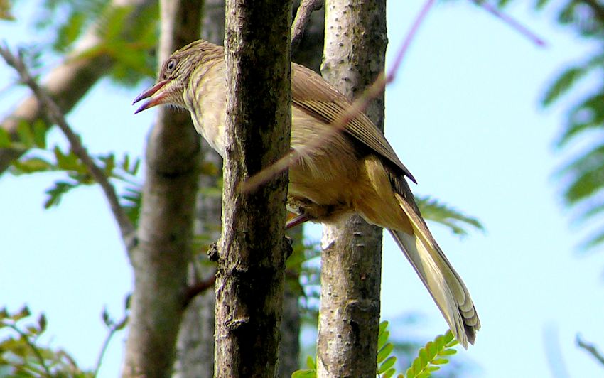 Diagnostic markings :- 18 cm. I couldn't say much about this species. I had seen the birds before but the pictures that I had posted doubts whether they are Streaked-ear or Olive-winged. If the patch at the ear were to be used as norm. However the color on the vent is more definite as this bird used as a feature had more that dull yellow, almost orange tinge. [1] Typical of Bulbuls with brownish upper part. The throat and belly pale in color. and dull yellowish vent. [This yellow on some birds appeared off colored] Best distinguished by the whitish streaks on its ear coverts. Another feature not consistently seen is the brown bill with pink at its base. The Olive-winged Bulbul have streaks too on its ear covert but less pronounced. Grey eyes - adult while juvenile has brown eyes. Distribution :- This bird is native to a belt stretching from Myanmar, Thailand, northern Peninsula Malaysia and into Indo china. Even hanging around places like Perlis will not guarantee sighting of this bird. My meeting and pictures were accidental. Habitats and preferences :- The bird prefers arid bush land with sparse and low vegetation. Then public parks, gardens and wasteland with scrubs. While the terrain preferred sounded urban, this bird was never spotted. This is a lowland bird. It is difficult to to say for sure the ID for this bird in the field as it is hardly seen. Only at home, slowly evaluating it's markings and ensuring that the bird is not a Olive-winged. Then on the spot there were no 2 Bulbuls at the same place and time for comparison of the size. As this bird is not spotted that often, very difficult to make more comments.