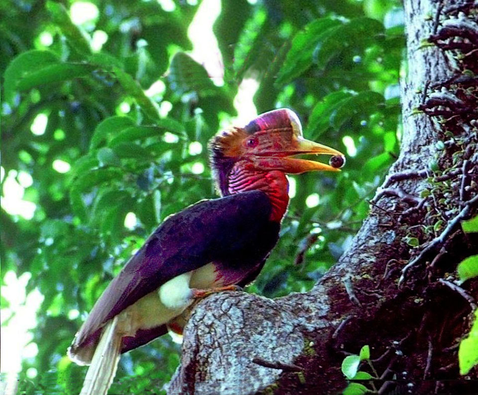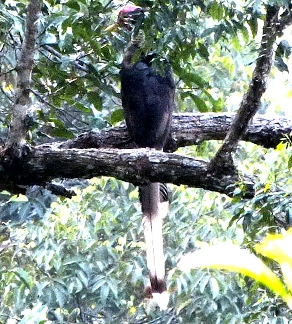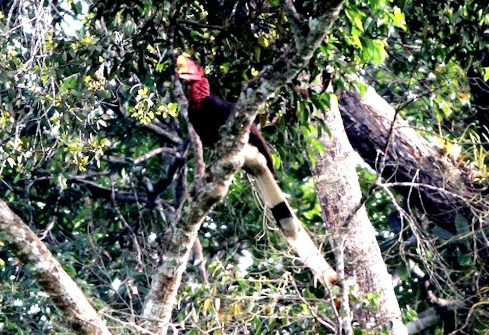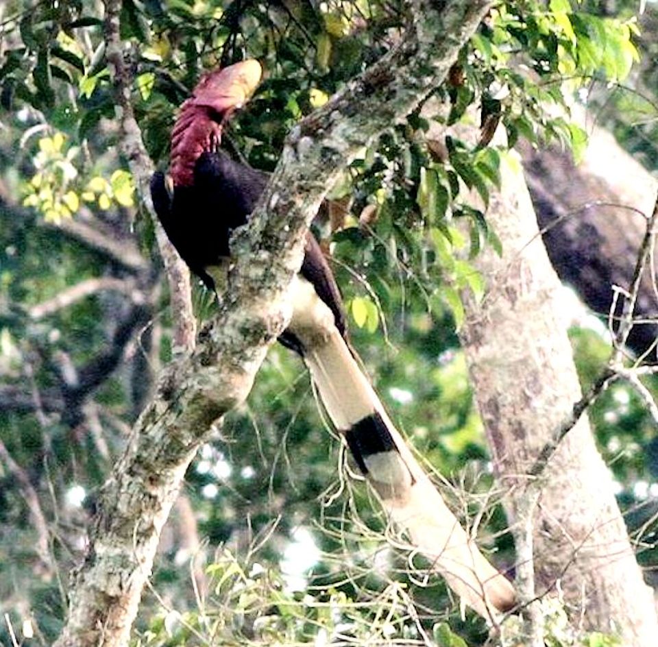 Size & diagnostic markings:- 127 cm. This Hornbill is even longer then the Rhinoceros Hornbill and could also be longer as the central feather at the tail could extend further. This point itself is diagnostic. Dark red skin on the sides of the head, throat and neck reminds us of that Turkey looks. This Hornbill is black with a white rump and hind underpart. The tail is also whitish with a central band. Like most Hornbill, it has a short casque, rounded in red color with a yellow tip. The bill is unlike that of other Hornbill, short - yellow in color ending with red at the end near the head. Distribution :- This bird is found in Sumatra and Borneo. Could be seen fairly often in peninsula Malaysia too. Habitats & preferences:- This is a lowland forest bird preferring preferring low hills. The bird usually seen in pairs. The call of this Hornbill though sounded different from that of the Great Hornbill has the same style and it is also this call that attracted us to the birds' where about. But the huge bird well perched on the canopy and very high up could not be spotted. Nicest point is that when the series of calls ended, that signal the bird's changed in perching spot and we should be on a look out for the birds flying past in the direction where the call was last heard. This is a graceful bird and I had no opportunity to be near a spot where the bird was perched for better pictures. |