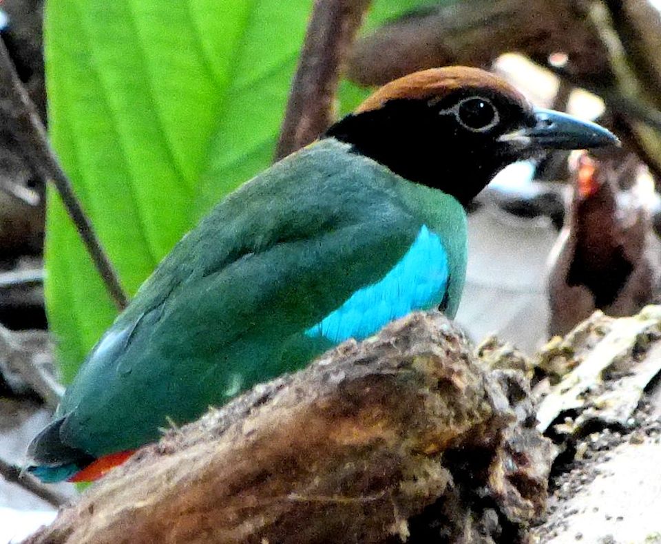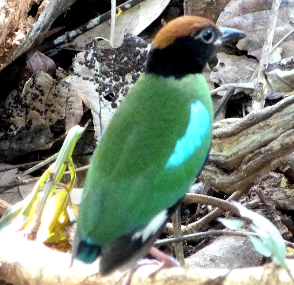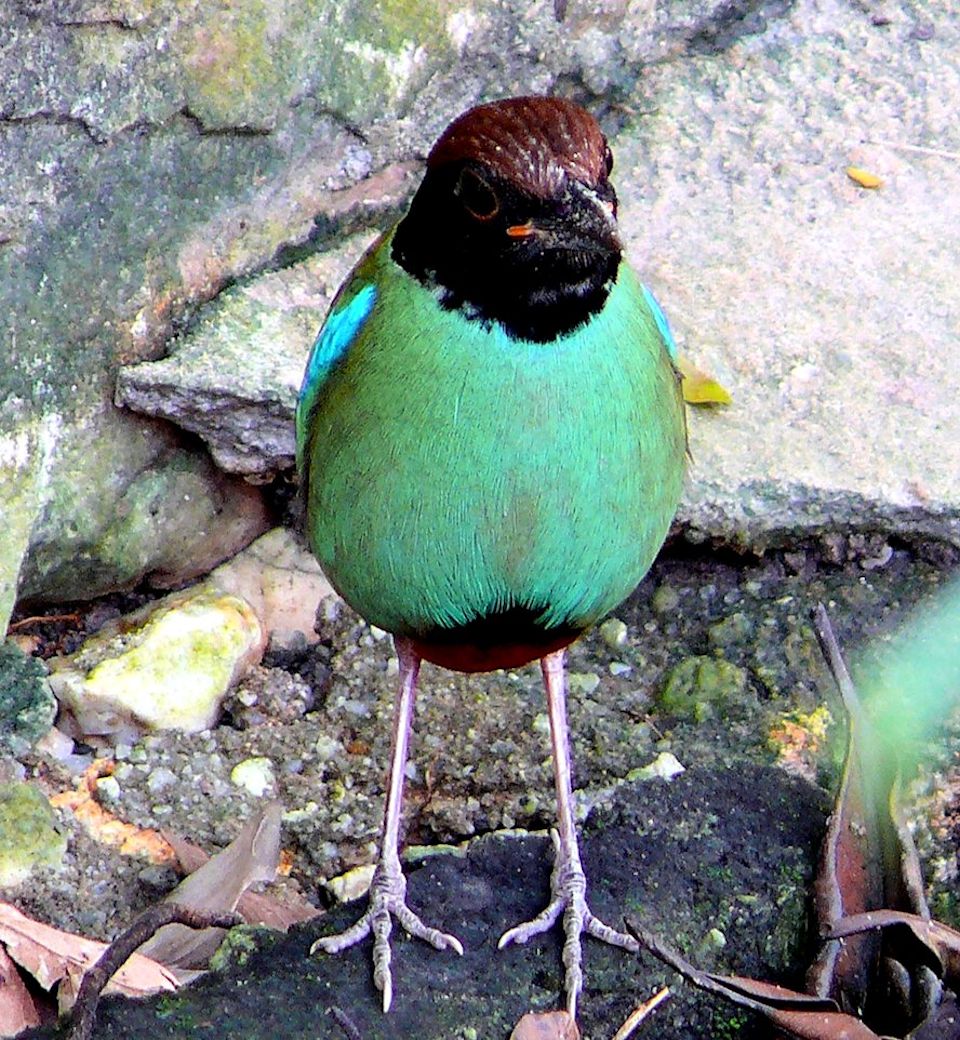 Size & diagnostic markings:- 18 Cm. This is another roundish bird with a very short tail measuring only 18 cm. The entire bird in dark pastel green with a dark brown crown and a thick black collar. A turquoise-blue stripe on the wing. From center of under part to the vent in bright red. Distribution :- The bird breeds in north-eastern India South-west China, then the region of the Greater Sundas down south to Sulawesi and New Guinea. Also resident in south Thailand and northern peninsula Malaysia.The Hooded Pitta is even smaller at 18 cm long. This is a bird from North-eastern India and western China, then another locality in south Greater Sundas and the Philippines. One more location is the Nicobar Island. This is a lowland bird and also a passage migrant in the Peninsula. Another sub-species the Pitta Sordida cucullata with a completely black crown is a resident in Borneo. This bird prefers open areas of the forest edge and old plantations. This bird is accustomed to human presence and would choose small patches of hiding places in urban or near to urbanized area. A pre-requisite would be the availability of wet ground nearby. Once the surrounding area where the bird is hiding is devoid of human presence, the bird would leave its hiding place to scour the open ground for food. The bird would remain in the same spot for a couple of weeks and then continues on its way. This bird remind me of the Flycatcher that works within a small confine. The bird is also shy of human to a certain extend and would not easily come out from the comfort of its hiding place. When it comes to time for feeding, the bird would come out in the open, even with the knowledge of human being around. Birders at this point of time should not spook their confidence by making too much movement or approaching closer within their comfort zone.