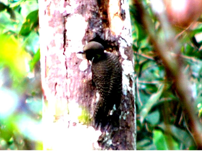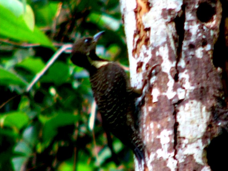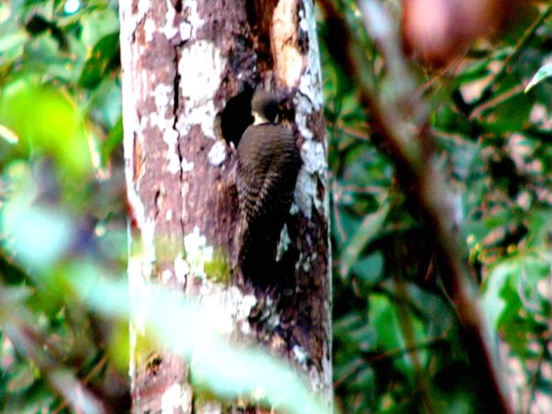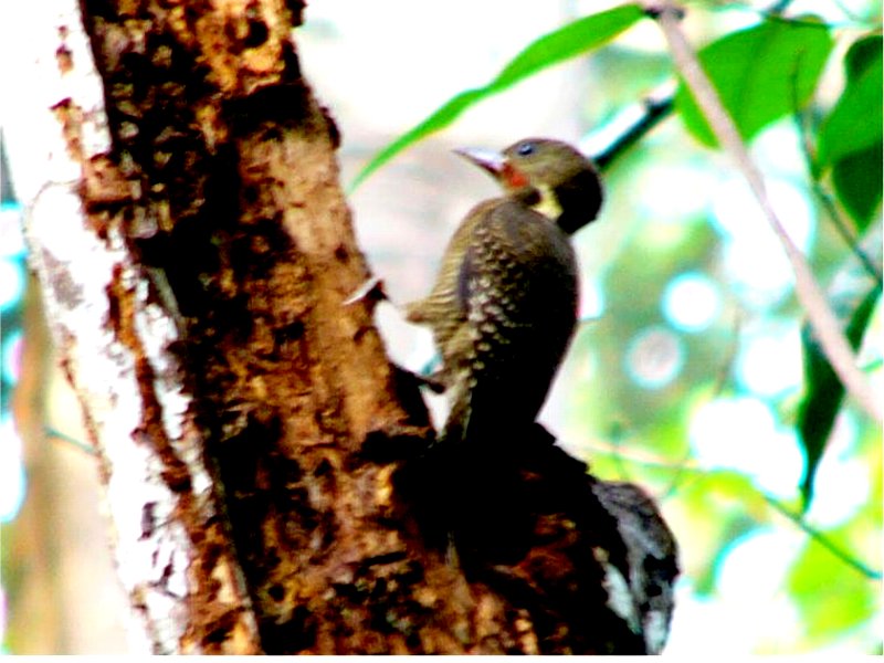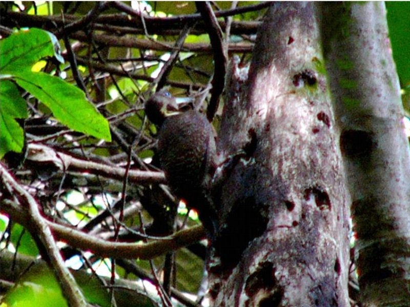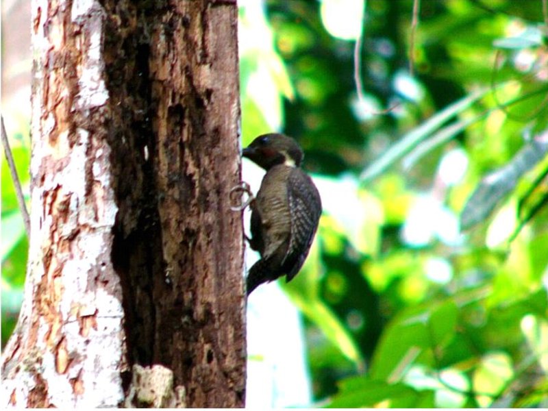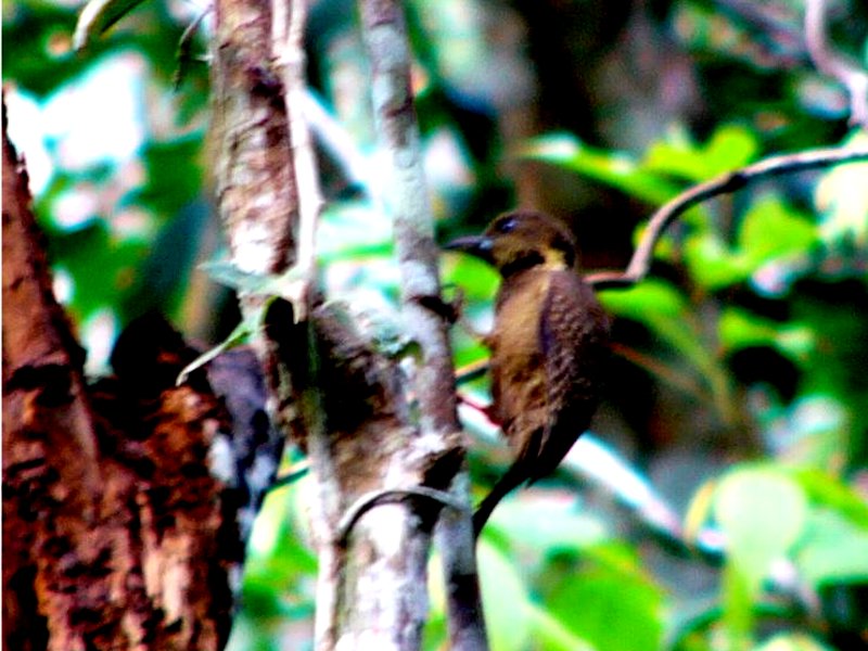 Size & diagnostic markings:- 21 cm. The Buff-necked at 21 cm is much bigger than the Buff-rumped. Most significant on this bird is the strong pale color patch on the neck. Though not a large patch but critical to tell this bird apart from the Buff-rumped. Then the red sub-moustachial strip is much longer and prominent. The female do not have the red stripe. Distribution :- This bird is the resident for Sumatra and Borneo Island. It is a fairly common bird in Malaysia. Habitats & preferences:- This is a lowland forest Woodpecker that prefers thick forest. Hunting in the lower and middle storey. Moving up and down vertical trunks. My first encounter with the Buff-necked Woodpecker was years ago when I was alerted by a medium size bird on top of a low shrub. It was so near and just beside me that I did not have time to make an ID. With the pictures, I confirmed that it was in fact a Woodpecker at eye level making some very un-Woodpecker like action. That was the first time for me to see the Buff-necked at the forest edge in Rengit. The pictures posted on this page was from a visit when I saw this Buff-necked again. This time beside the trail to the Canopy Walk in Taman Negara. That was a pair of them. After these couple of times, sighting were more frequent and easy. Like another encounter in Rengit where I met up with a family of 3 birds. Some pictures were taken off a lone bird in FRIM. Once more, this is a forest bird, more inside the forest and seldom seen in forest edge. On all occasions the birds spent more time in the lower storey. They were extremely shy bird. I suppose spending most of their time in forest with little outside intrusion, they not very attentive creature. Most of my encounters were by chance with the birds extremely close. On all sightings, the birds were not part of a bird wave. This is a Woodpecker native to the islands of Sumatra and Borneo and in no where mentioned about migratory. For ID, this series show distinctly the important marking. Photographs show the sharply contrasting pale buff patch on the neck.