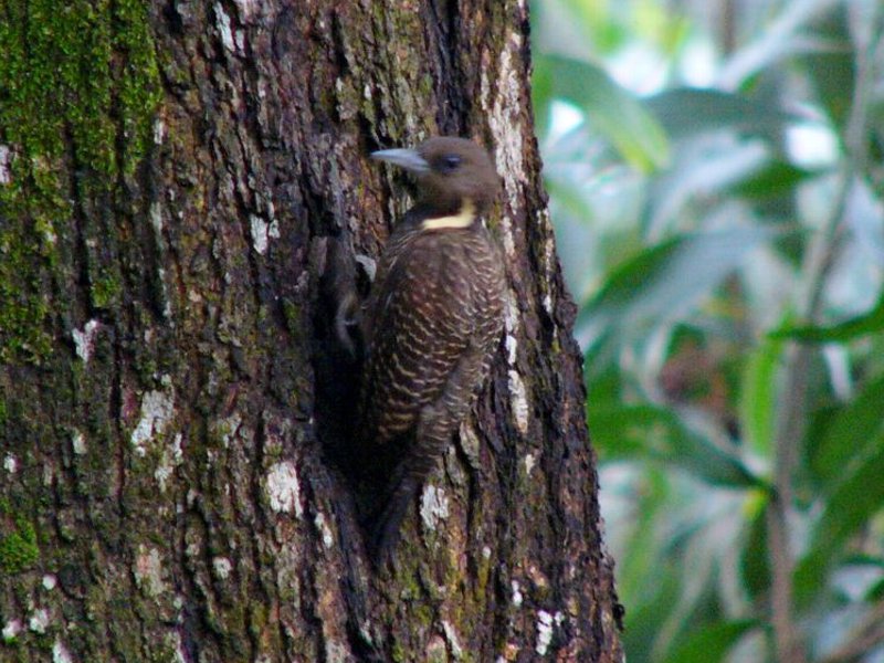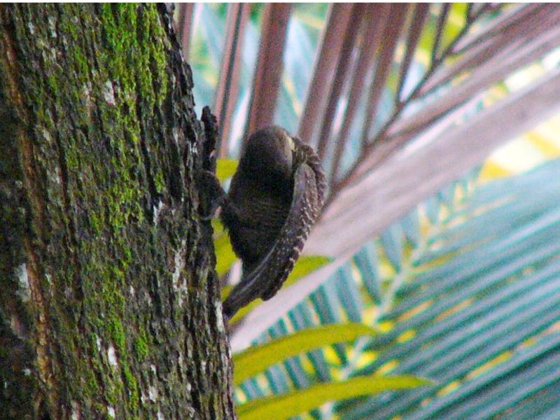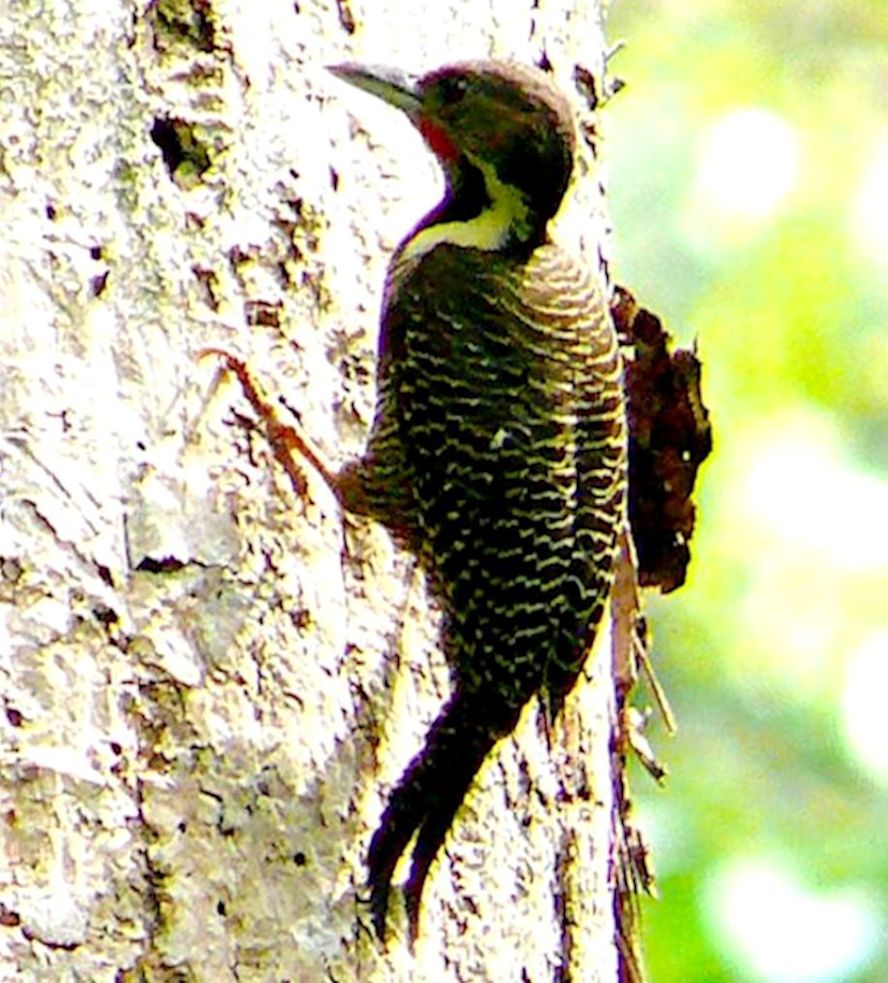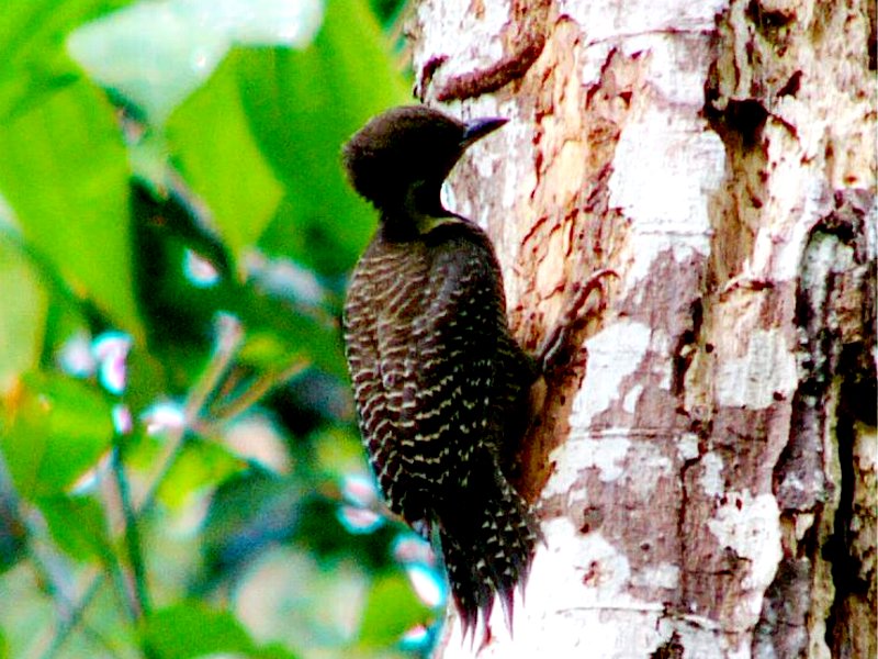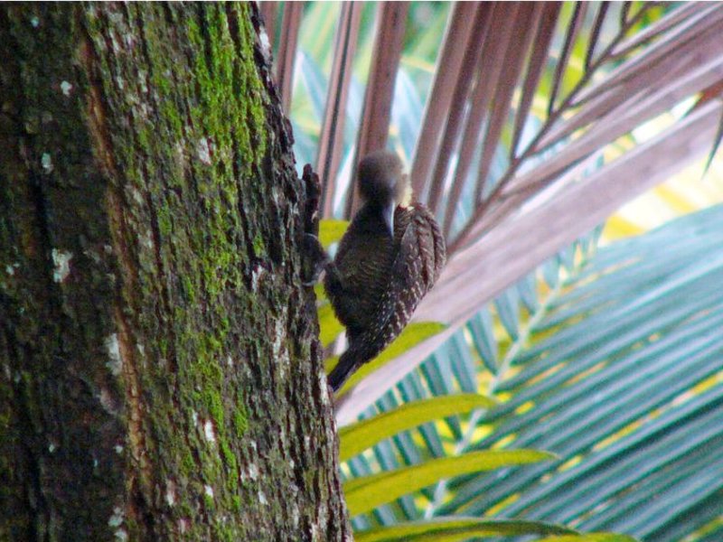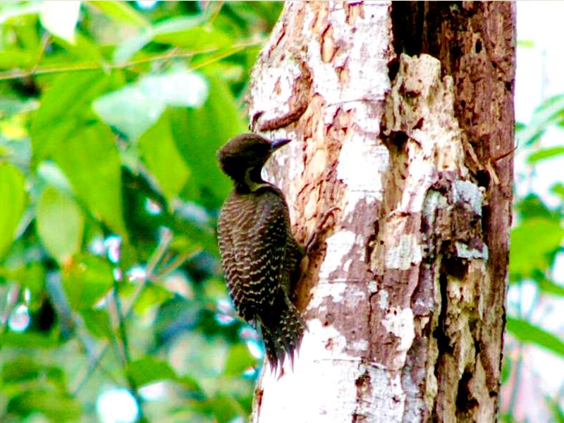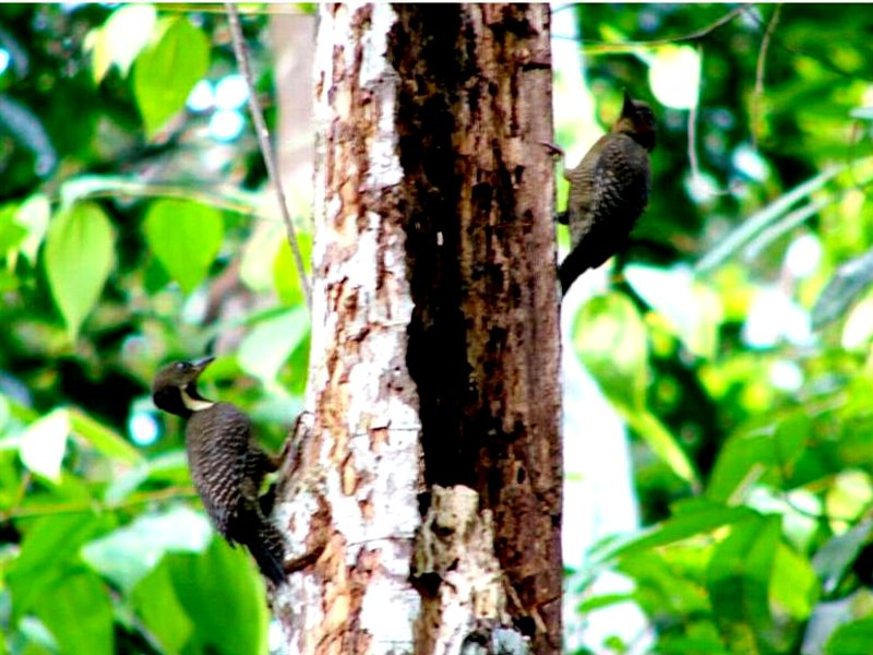Size & diagnostic markings:- 21 cm. The Buff-necked at 21 cm is much bigger than the Buff-rumped. Most significant on this bird is the strong pale color patch on the neck. Though not a large patch but critical to tell this bird apart from the Buff-rumped. Then the red sub-moustachial strip is much longer and prominent. The female do not have the red stripe. Distribution :- This bird is the resident for Sumatra and Borneo Island. It is a fairly common bird in Malaysia. Habitats & preferences:- This is a lowland forest Woodpecker that prefers thick forest. Hunting in the lower and middle storey. Moving up and down vertical trunks. My first encounter with the Buff-necked Woodpecker was years ago when I was alerted by a medium size bird on top of a low shrub. It was so near and just beside me that I did not have time to make an ID. With the pictures, I confirmed that it was in fact a Woodpecker at eye level making some very un-Woodpecker like action. That was the first time for me to see the Buff-necked at the forest edge in Rengit. The pictures posted on this page was from a visit when I saw this Buff-necked again. This time beside the trail to the Canopy Walk in Taman Negara. That was a pair of them. After these couple of times, sighting were more frequent and easy. Like another encounter in Rengit where I met up with a family of 3 birds. Some pictures were taken off a lone bird in FRIM. Once more, this is a forest bird, more inside the forest and seldom seen in forest edge. On all occasions the birds spent more time in the lower storey. They were extremely shy bird. I suppose spending most of their time in forest with little outside intrusion, they not very attentive creature. Most of my encounters were by chance with the birds extremely close. On all sightings, the birds were not part of a bird wave. This is a Woodpecker native to the islands of Sumatra and Borneo and in no where mentioned about migratory. For ID, this series show distinctly the important marking. Photographs show the sharply contrasting pale buff patch on the neck.