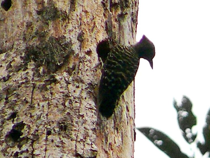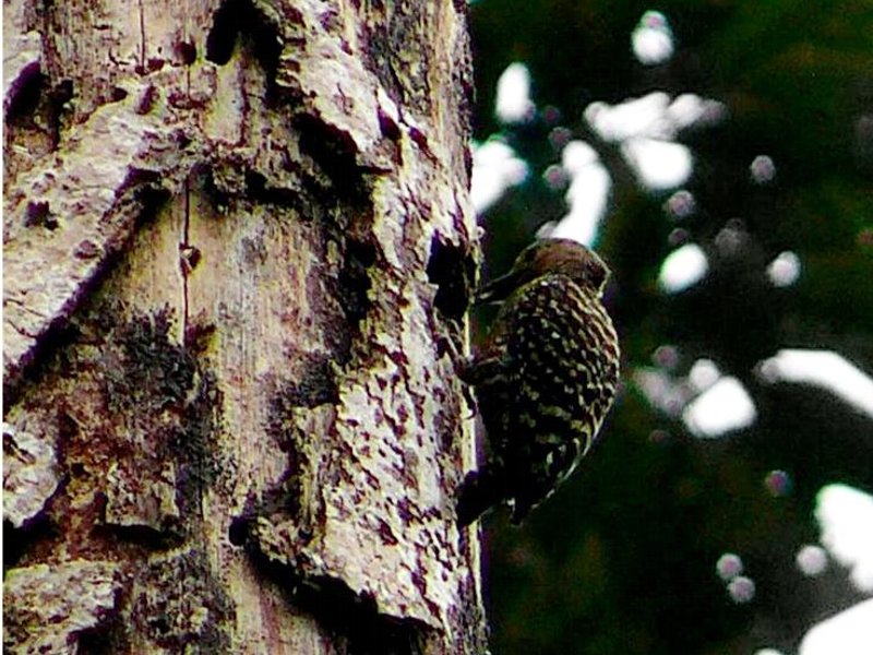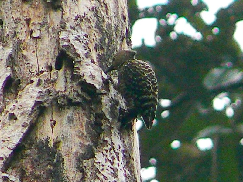 Size & diagnostic markings:- 17 cm. The Buff-rumped Woodpecker is small at 17 cm. The bird appears short as it has the combination of a smaller body plus a shorter tail. The red sub-moustachial stripe is not always noticeable Again the female do not have this stripe. So to tell the difference between this Buff-rumped against the Buff-necked would be 1] its small size and 2] the Pale patch on the neck. Distribution :- This is a bird again of the Sumatra and Borneo island but this time, Java is also one place for home. This is also another easy to spot Woodpecker in Malaysia Habitats & preferences:- The is also a lowland forest bird, but unlike the Buff-necked Woodpecker, the buff-rumped tends to get into secondary forest and plantation as well. It does crawl onto the trunk but also more times seen foraging among leaves. The Buff-rumped Woodpecker at 17 cm is a much smaller bird when compared to the 21 cm Buff-necked. First task is to look for that cream patch on the neck. Next, when there pale neck patch is unseen, then the ID of the bird being a Buff-rumped is more or less ascertained. Overall, I would say that Buff-rumped appeared blackish with all its barring. Buff-necked on the other hand has a brownish tone. Perhaps, good to note the head for the Buff-necked Woodpecker is more roundish while that of the Buff-rumped Woodpecker is getting triangular, some resemblances with the Grey & Buff Woodpecker. Like a in-between the Buff-necked and Buff & Grey Woodpeckers. Then next, look for the red sub-moustachial, those with that red stripe will confirm the Woodpecker is a male. As mentioned earlier, the Woodpecker spends more time foraging among the leaves. They are looking for insect by breaking up nests made by combining leaves. From afar, movements among the leaves could be interpreted as that made by Green Leafbirds.