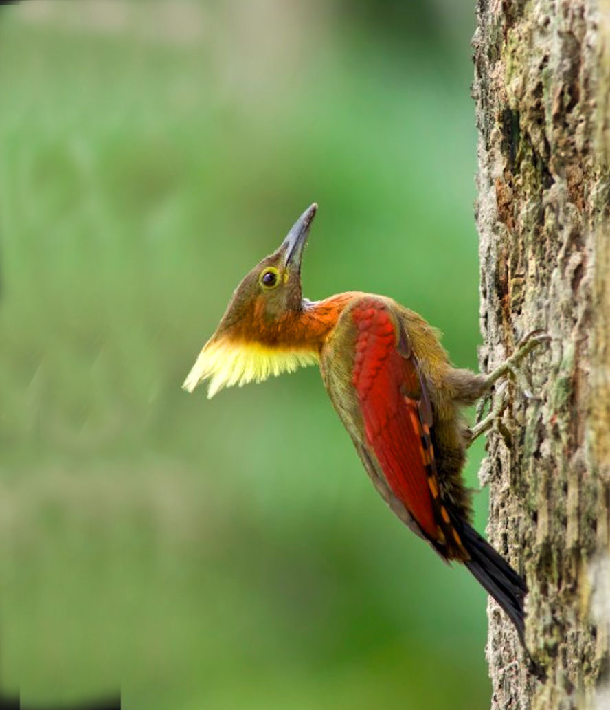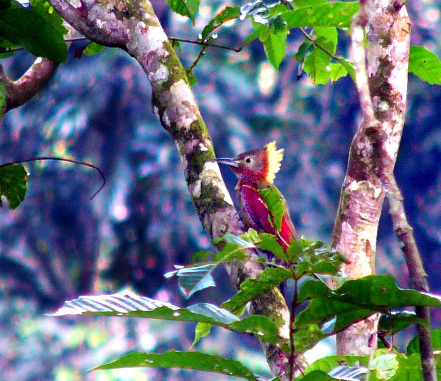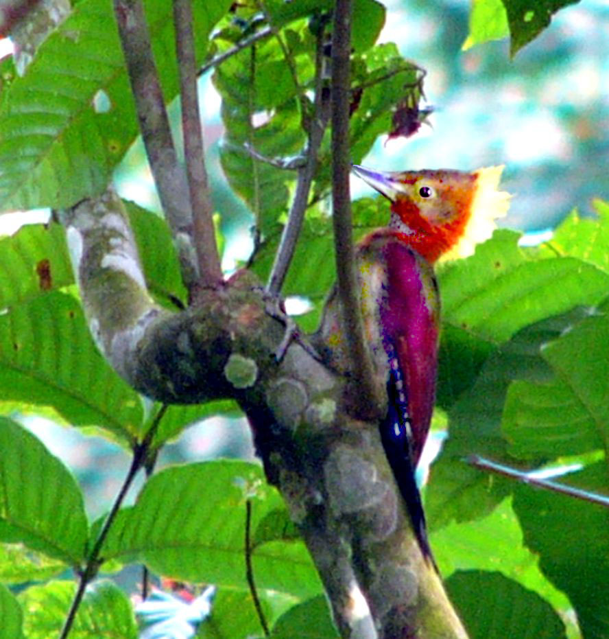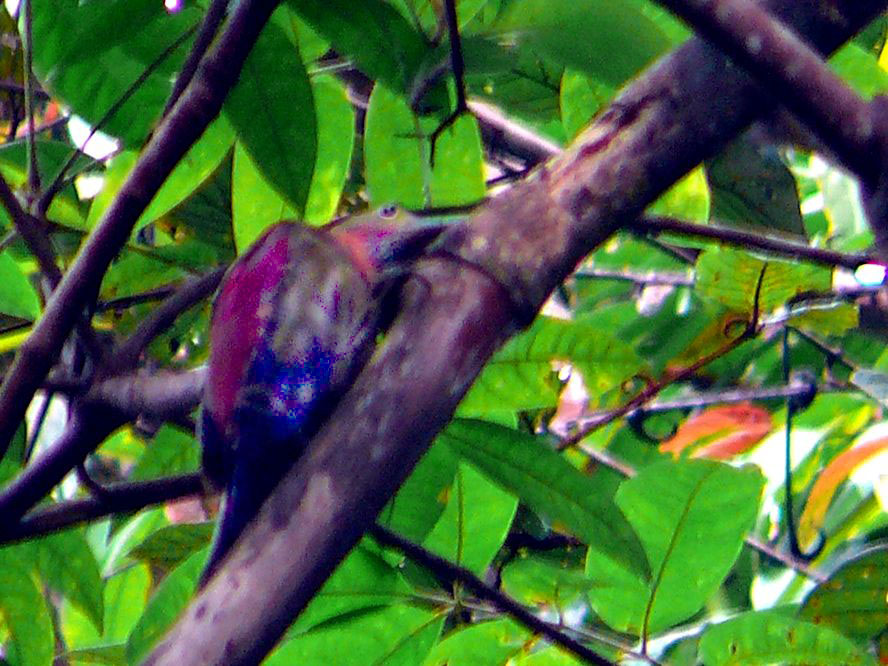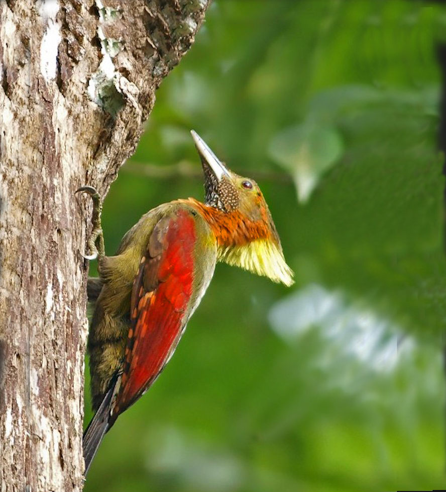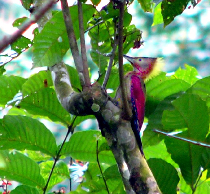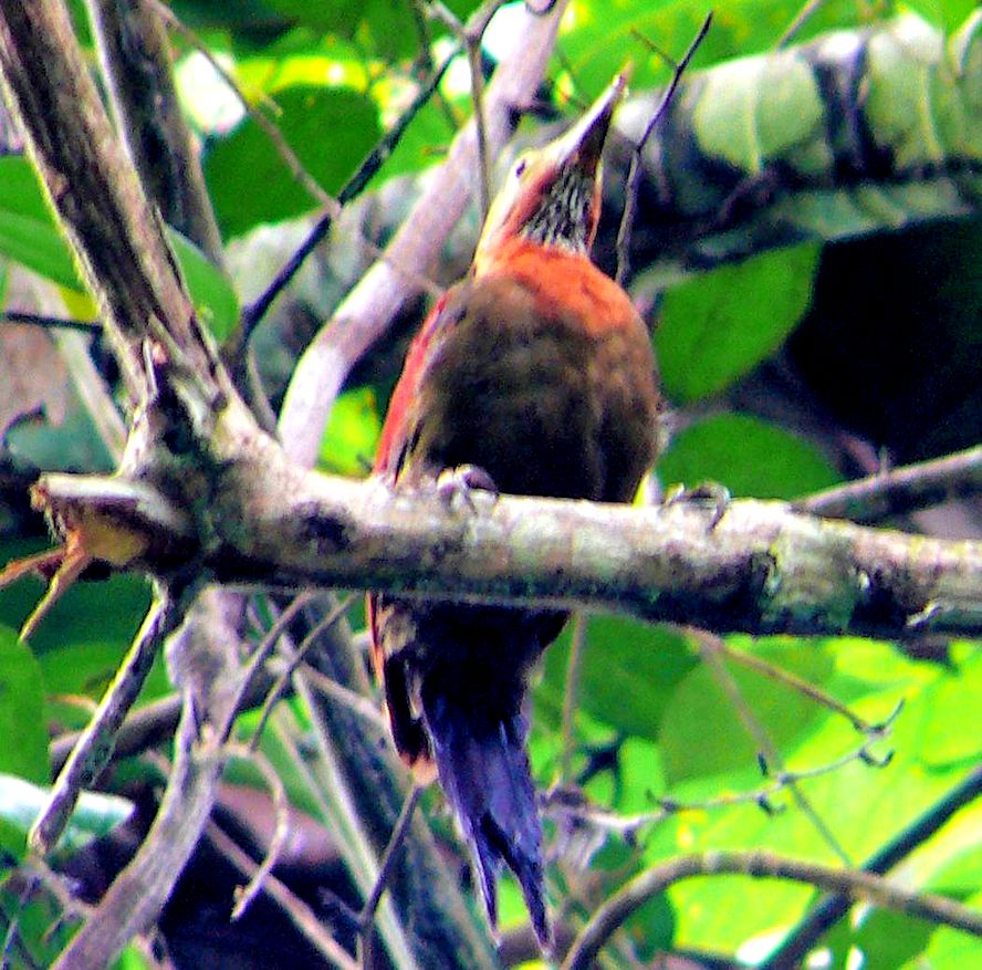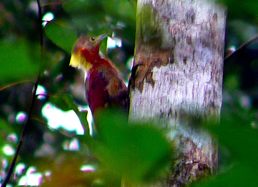 Size & diagnostic markings:- 28 cm. A fairly large Woodpecker at 28 cm long. With the looks of Crimson-winged Woodpecker having bright red wings part and Olive-green upper part. The eye ring is less prominent. The single most important diagnostic marking would be:- 1] the chestnut colored side of neck and the breast. Then 2] the small details of the throat white with black streaks. Distribution :- Also a bird of the Greater Sundas with a local population. In Malaysia, this is a bird of deep forest and not frequently encountered. Then on random meeting up easily dismissed as a Crimson-winged Woodpecker. Habitats & preferences:- This is a bird of the deep forest and mangrove wetlands but could be found in the hills as well. I could have missed many chances of photographing this bird, the lack of knowledge then made me complacent and dismissed spending more time to look for details on this bird. So my advise, upon seeing that common "Crimson-winged" don't draw conclusion yet. Observed harder. This is the 2nd Woodpecker that I was tied up in knots. In Malaysia, where can the bird be found:- Mainly in places with primary jungles. This is a large bird but more often seen from a distance spot. Rengit is one such destination when the chances of meeting up the bird is very good. Another place would be the forest at the Ulu Langat Waterfalls area of Terkali. Forest in Perdik and more times in Rengit.These places were quoted from my own experiences |