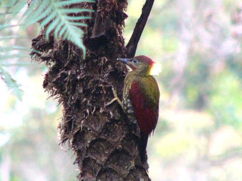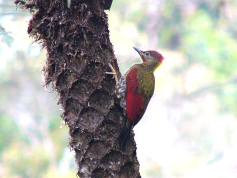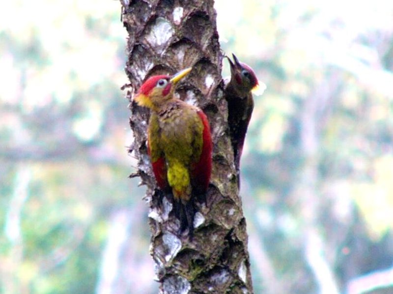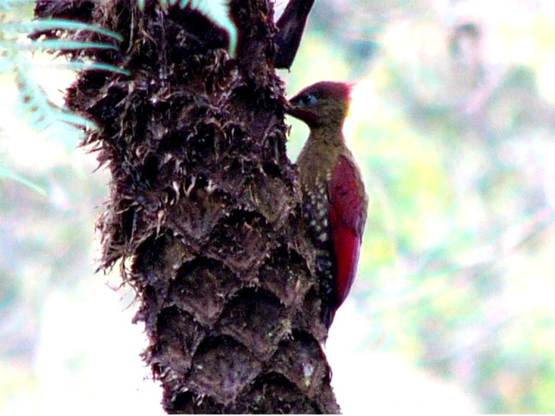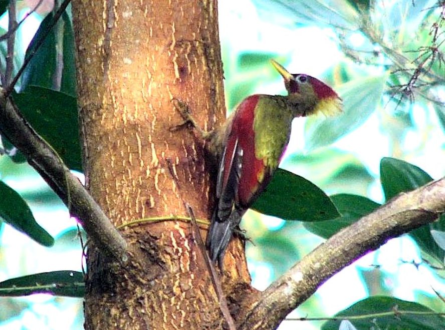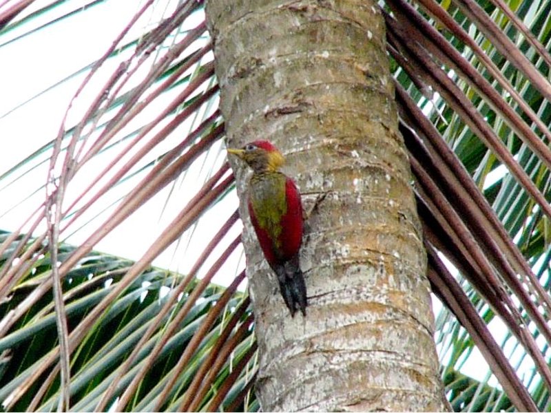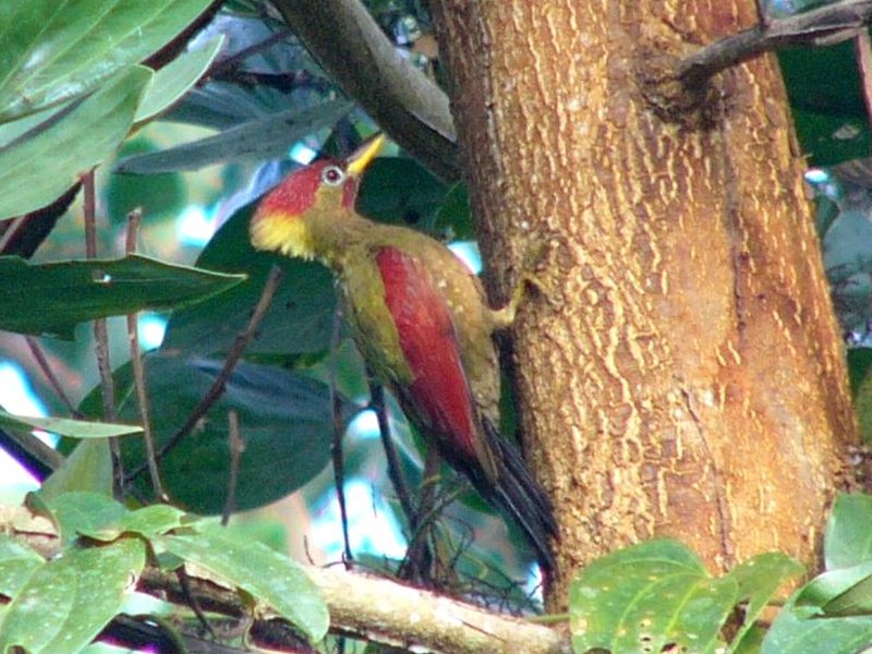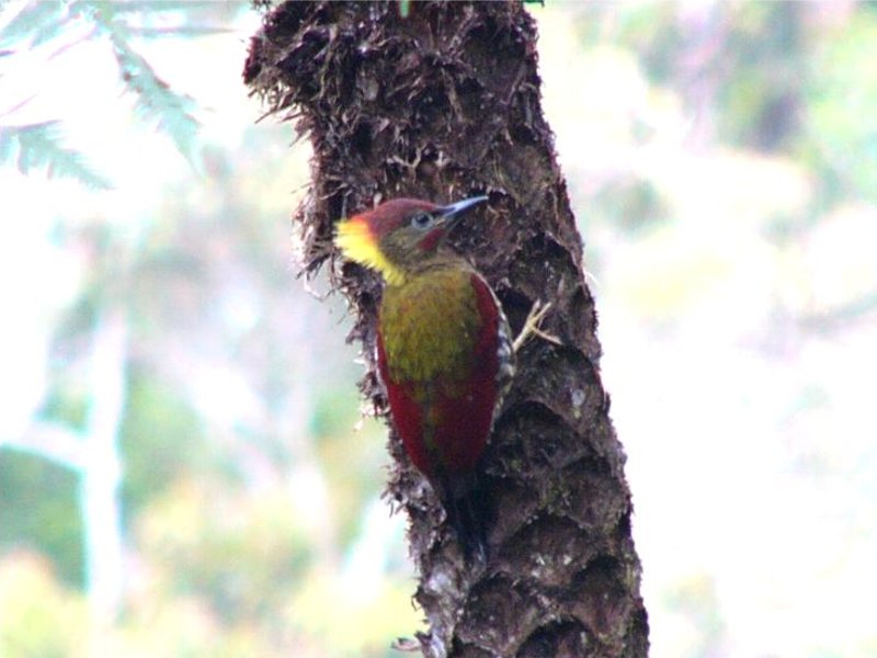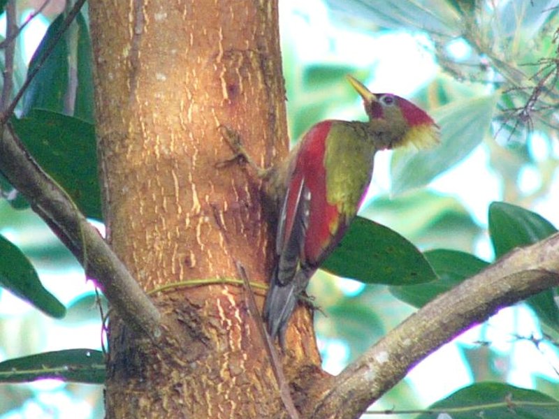 Size & diagnostic markings:- 27 cm. The Crimson-winged at 27 cm is larger when compared with the Banded Woodpecker. Obvious would be the Olive green on its upper part and the yellow nuchal crest. More distinctive would be the red sub-moustachial stripe appearing on the male. Then the red wings patch over the greenish body that helps to brings out the green. Notice the pale grayish-blue eye ring which is also diagnostic for this bird. Distribution :- Again this is another Woodpecker from the Greater Sundas. In Malaysian forest this is the most often seen Woodpecker. The Common Flameback has that position in rural forest edge and public park. Habitats & preferences:- This is a bird of the lowland forest edge as well as secondary forest. Commonly seen and the second most commonly seen Woodpeckers after the Common Flameback. This true to the term forest edge irrespective of terrains i.e. in the lowlands and well as in the mountain. Example the bird was seen in the plantation outside a kampong and then along the forested road in Rengit. This time a stretch of road without houses and primary forest. Some of the pictures included in this page were taken at the Old Pump House Road, a sub-montane area. Also in the same area, the Banded was spotted. In most other places, I have seen the bird moving in pairs. They moved at the lower as well as middle storey. This is not a shy bird and would carry on its activity even when it was under observation. In making out the differences between the Banded and Crimson-winged, I could see that photographs are better guides when compared to drawings. Straight away, the points mentioned about the subtle differences makes sense. The difference are so obvious and not subtle. It is a matter of getting used to recognizing the diagnostic markings.. As mentioned in the notes for the Banded Woodpecker, the wings on the Crimson-wings may sometimes makes the Woodpecker appear red. In actual fact, looking at the pictures, notice that brightly red shaded portion which may be a main feature is less imposing on the overall olive green color of the bird. In the case of the Banded Woodpecker, the dark red wings blended in well with the maroon-brownish speckles on the back. Of course, the clearest diagnostic marking is the red sub-moustachial stripe. This is so important but not helpful as the feature only appears on the male and with the bird moving about swiftly, hard to pick up unless done with after a picture was taken and studied.