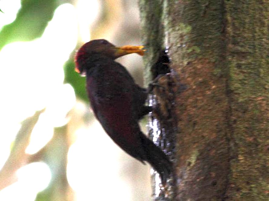 Size & diagnostic markings:- 24 cm. I love seeing this bird with a outstanding ivory beak A small Woodpecker at 24 cm almost the size of the Rufous and yet smaller. The description of "unmarked maroon chestnut" looks like plain maroon on the upper part and the under part also plain looks brown . The beak which is the striking part is long of pale ivory color. Distribution :- The is a bird from Sumatra and Borneo Island. This is not a common bird to find but could seen at Forest edge in Malaysia. Habitats & preferences:- The bird prefers Bamboo clumps. A lowland bird but usually prefers Bamboo growing on heavily forested hill slopes. So I would say that this is a bird of the low hills and not sub-montane. Though a bird native to Malaysia, the bird is not often sighted. In fact the few occasions I met the bird at the Gap and Perdik by chance. Not enough experience with the bird to pass on in this page. The images shown below with that of my collection of female Maroon Woodpecker. Then further down are pictures of the male bird feeding the chicks. Unfortunately, lightings was hostile even though I was very close by to the nest. In Malaysia, where can the bird be found:- The bird seen in the hills in Ulu Langat as well as those on the road to Frasers. A good place would be The Gap |